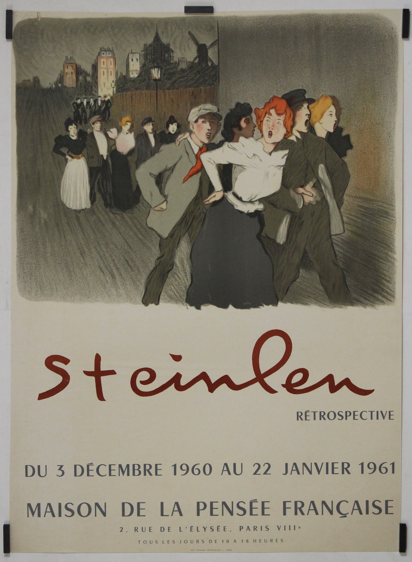 La typographie de l'affiche, à la fois élégante et audacieuse, met en valeur le nom « Steinlen » en lettres rouges fluides qui contrastent avec les tons feutrés de l'œuvre. Le programme de l'exposition, présentée du 3 décembre 1960 au 22 janvier 1961 à la Maison de la Pensée Française, souligne l'importance culturelle de cette rétrospective et célèbre l'influence durable de l'œuvre de Steinlen.