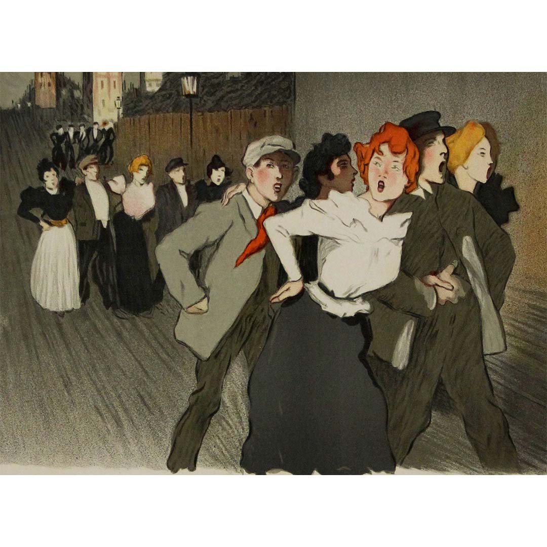 L'œuvre figurant sur l'affiche incarne l'engagement de Steinlen à dépeindre les luttes et la vitalité du quotidien. L'image saisit un moment de protestation ou de manifestation, avec un groupe expressif d'ouvriers et de femmes avançant avec détermination. La scène se déroule sur fond de Montmartre, avec la silhouette inimitable du Moulin Rouge et l'atmosphère âpre d'un Paris industrialisé. Les personnages, dessinés dans le style caractéristique de Steinlen, sont à la fois puissants et profondément humains, reflétant sa capacité à allier finesse artistique et commentaire social.