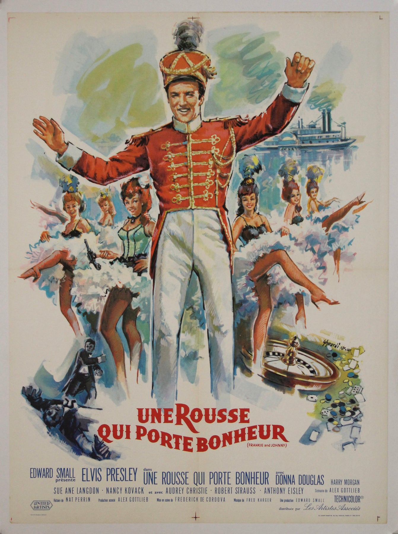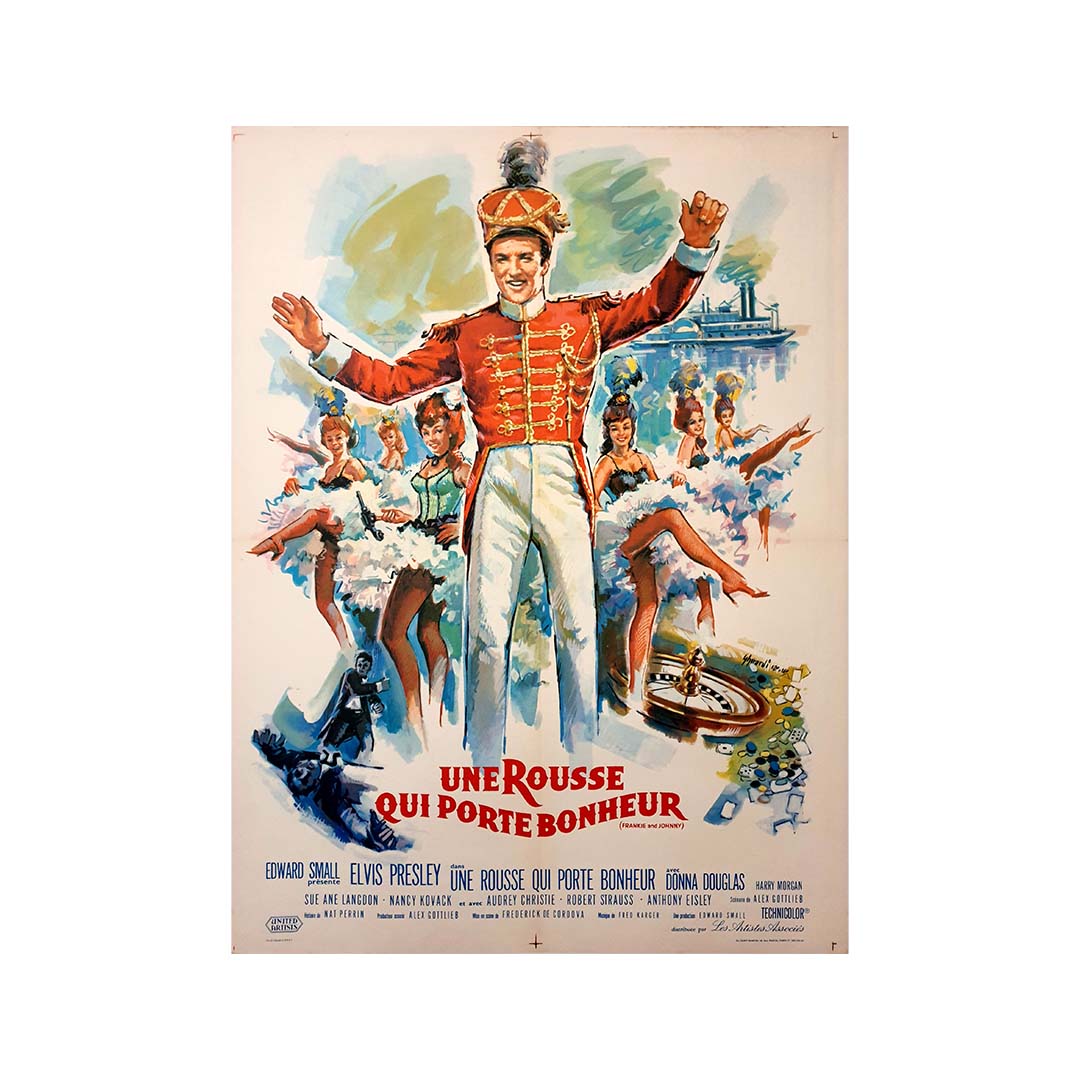 L'affiche met en avant Elvis Presley, rayonnant de charisme dans le rôle de Mike McCoy, pilote de course et musicien rock insouciant. Autour de lui, des illustrations dynamiques de voitures de sport, de femmes glamour et d'éléments musicaux évoquent le mélange d'action, de romance et de musique du film. Le titre « Une rousse qui porte bonheur » souligne l'intrigue amoureuse, faisant référence au personnage de Shelley Fabares, Cynthia, l'une des trois femmes qui se disputent le cœur de McCoy.