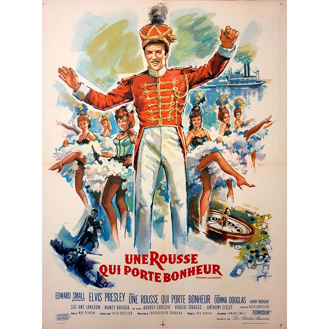 L'affiche originale de 1966, conçue par Ghirardi pour la sortie française du film « Une rousse qui porte bonheur » ( Spinout ), réalisé par Edward Small et mettant en vedette Elvis Presley, est une œuvre publicitaire cinématographique vibrante et dynamique. Reflétant l'énergie et le charme du Roi du Rock 'n' Roll, cette affiche capture l'essence de la culture pop des années 1960 grâce à son design audacieux et à son imagerie ludique.