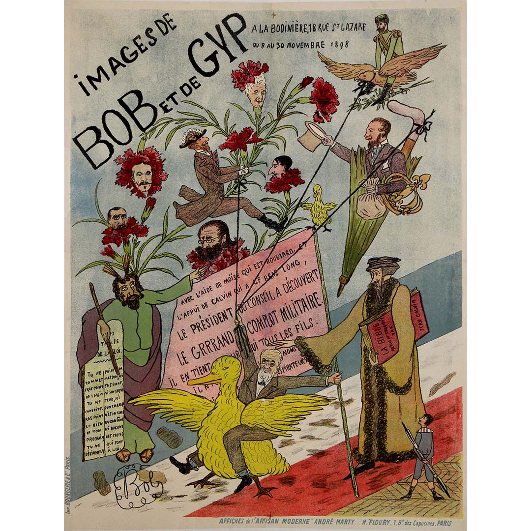 Cette remarquable affiche lithographique de 1898, richement illustrée, annonce l'exposition satirique Images de Bob et de Gyp , qui se tiendra à La Bodinière (18, rue Saint-Lazare, Paris) du 9 au 30 novembre. L'exposition était centrée sur la collaboration entre le caricaturiste Bob (Georges Ferdinand Bigot, dit « Bob ») et la célèbre écrivaine aristocrate Gyp (pseudonyme de Sibylle Riqueti de Mirabeau), un duo qui utilisait la caricature et l'humour pour cibler les affaires politiques et sociales de la Troisième République française.