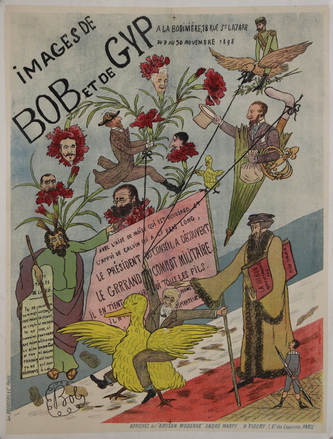 Dessinée dans un style Belle Époque exubérant, l'affiche est un tourbillon de symbolisme, de caricature et d'imagination absurde. Des têtes de politiciens flottent au-dessus de tiges d'œillets rouges, tandis que des silhouettes volantes, des parapluies, des oiseaux et des rouleaux peuplent la scène dans un paysage surréaliste. Au centre, une figure à la Moïse serre contre elle une tablette de pierre gravée de versets moqueurs, proclamant des révélations politiques absurdes. La scène dans son ensemble parodie le langage et les postures du pouvoir d'État et de l'autorité religieuse, les ridiculisant avec un esprit mordant.