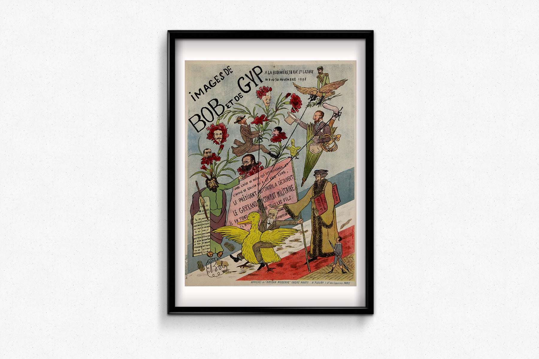 Cette affiche n'est pas qu'une simple publicité : c'est une œuvre satirique à part entière. Les noms cités et les images utilisées reflètent les scandales politiques de l'époque, notamment ceux qui ont touché des personnalités militaires et religieuses lors de la tumultueuse affaire Dreyfus. Dans le coin inférieur gauche, la lithographie est attribuée à Affiches de l'Artisan Moderne, avec une impression réalisée par André Marty et H. Fleury.