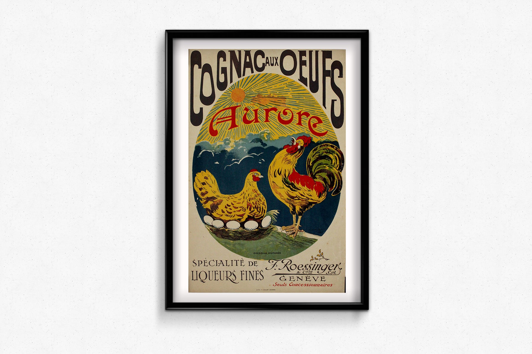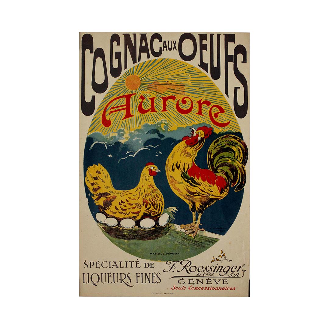 Au centre de la composition, un coq majestueux se dresse fièrement aux côtés d'une poule couvant ses œufs, symbolisant la fraîcheur et la qualité des ingrédients utilisés pour l'élaboration de cette luxueuse liqueur française à base de cognac. Le fond en forme de soleil, orné du nom « Aurore », évoque un nouveau départ, renforçant l'idée d'énergie, de chaleur et de vitalité – qualités associées aux œufs et au cognac.