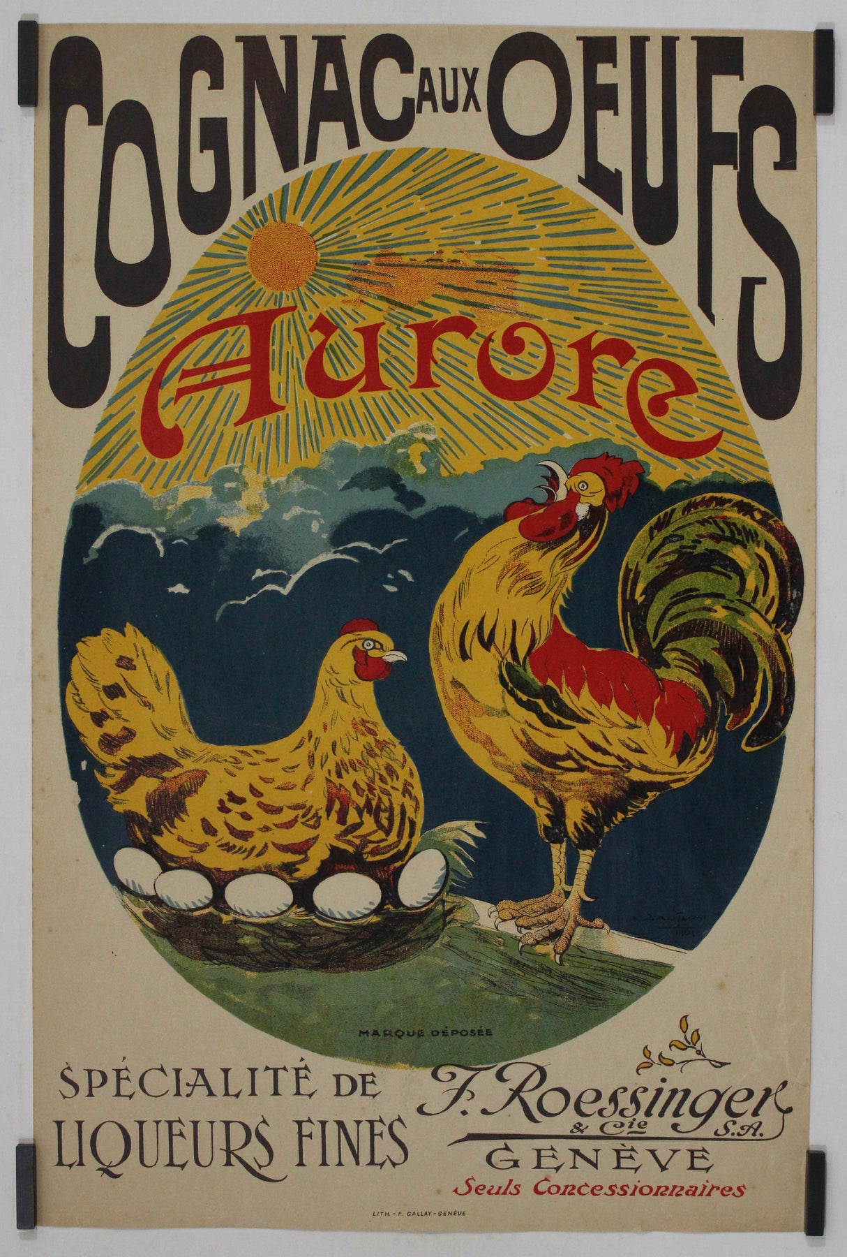 La typographie, audacieuse et élégante, met en valeur le nom « Cognac aux Œufs » en lettres capitales imposantes, attirant immédiatement l'attention sur le produit. En dessous, l'affiche mentionne F. Roessinger & Cie, Genève, comme distributeur exclusif, soulignant ainsi son prestige. Le lettrage manuscrit et l'impression lithographique témoignent du savoir-faire de l'époque, faisant de cette affiche une pièce de collection emblématique de la publicité Art déco.