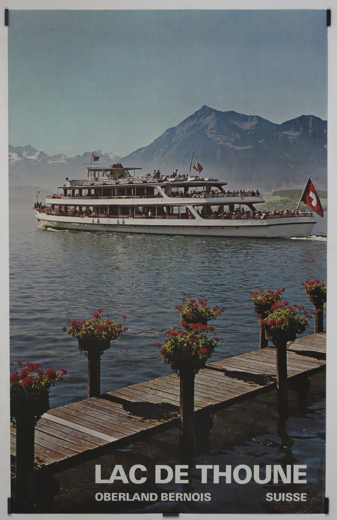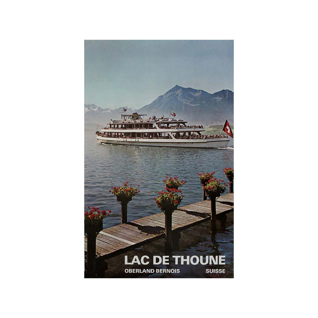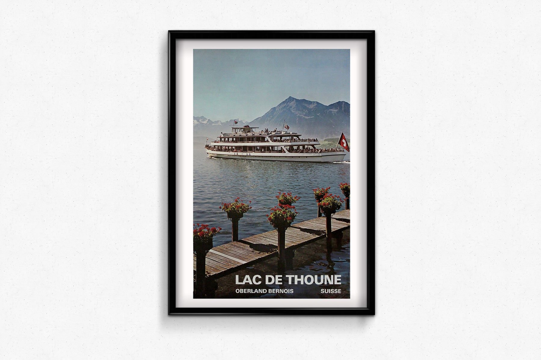 Cette affiche de voyage originale, datant des années 1960 et créée par l'artiste Eigstler, invite à découvrir la beauté paisible du lac de Thoune, situé au cœur de l'Oberland bernois en Suisse. Commandée durant l'âge d'or du tourisme européen, cette œuvre incarne l'élégance et la sérénité de la publicité touristique du milieu du XXe siècle.