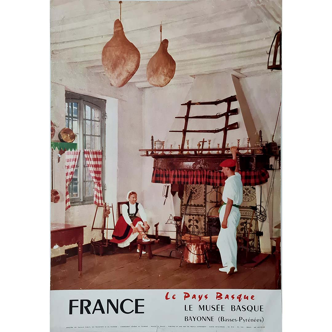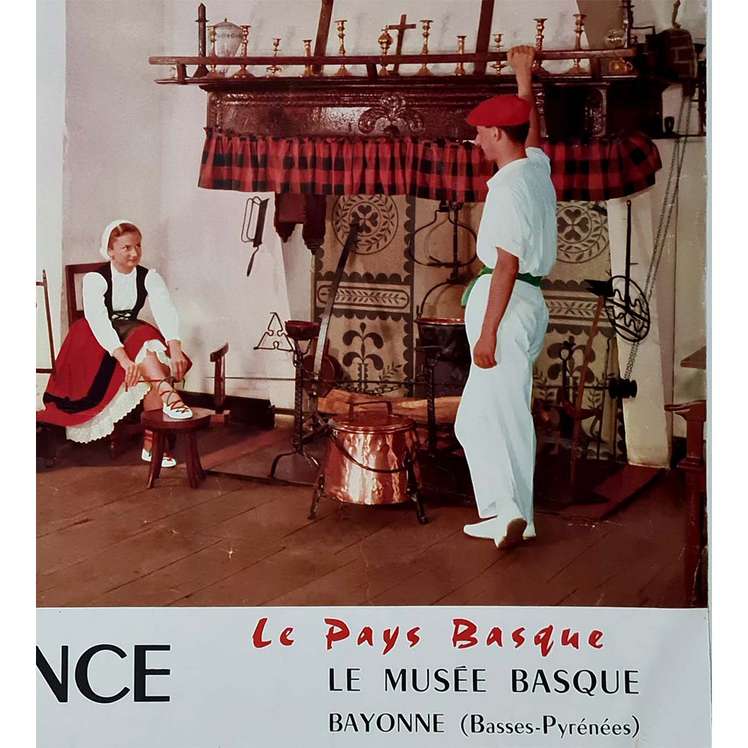 Publiée par le ministère français des Travaux publics, des Transports et du Tourisme, cette affiche s'inscrivait dans une campagne de promotion du tourisme régional et du patrimoine culturel en France. Le Musée Basque, fondé en 1922, demeure le plus grand musée ethnographique consacré à la culture basque ; il abrite des objets qui célèbrent l'identité, les coutumes et les traditions de cette région unique.