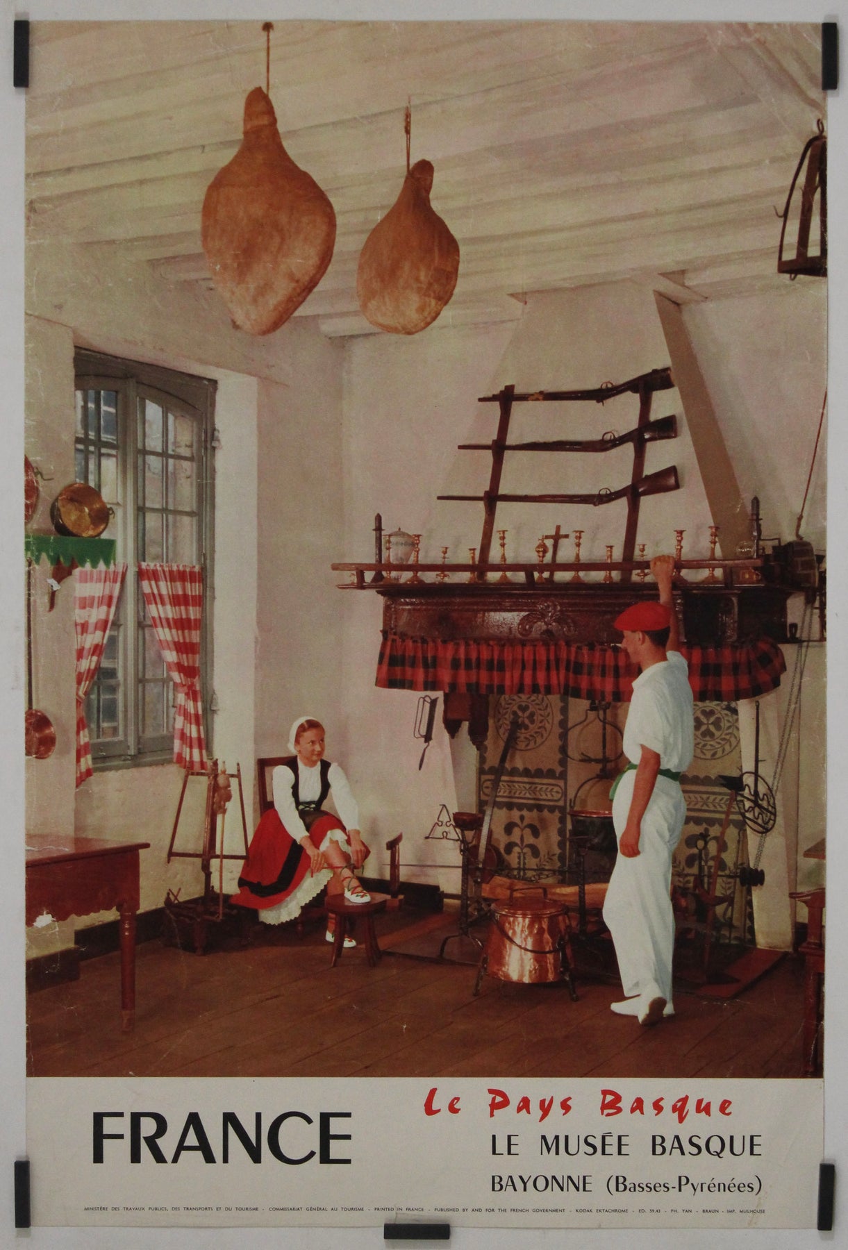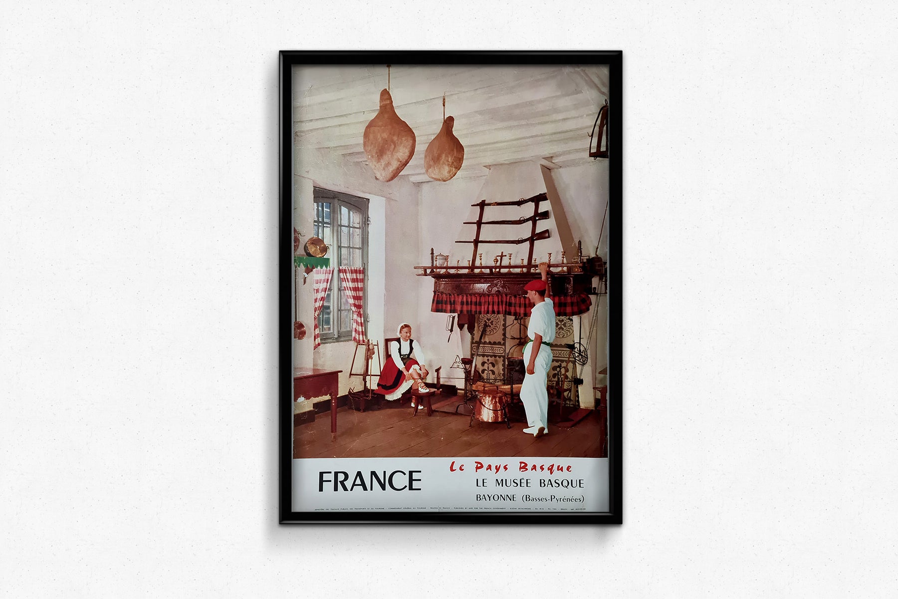 Cette affiche de voyage originale de 1959, photographiée par Yan, offre un aperçu captivant du riche patrimoine culturel du Pays basque français. Installée au Musée Basque de Bayonne (Basses-Pyrénées), l'image transporte le spectateur dans l'intérieur d'une maison basque traditionnelle, où l'histoire, l'artisanat et les traditions sont profondément ancrés.