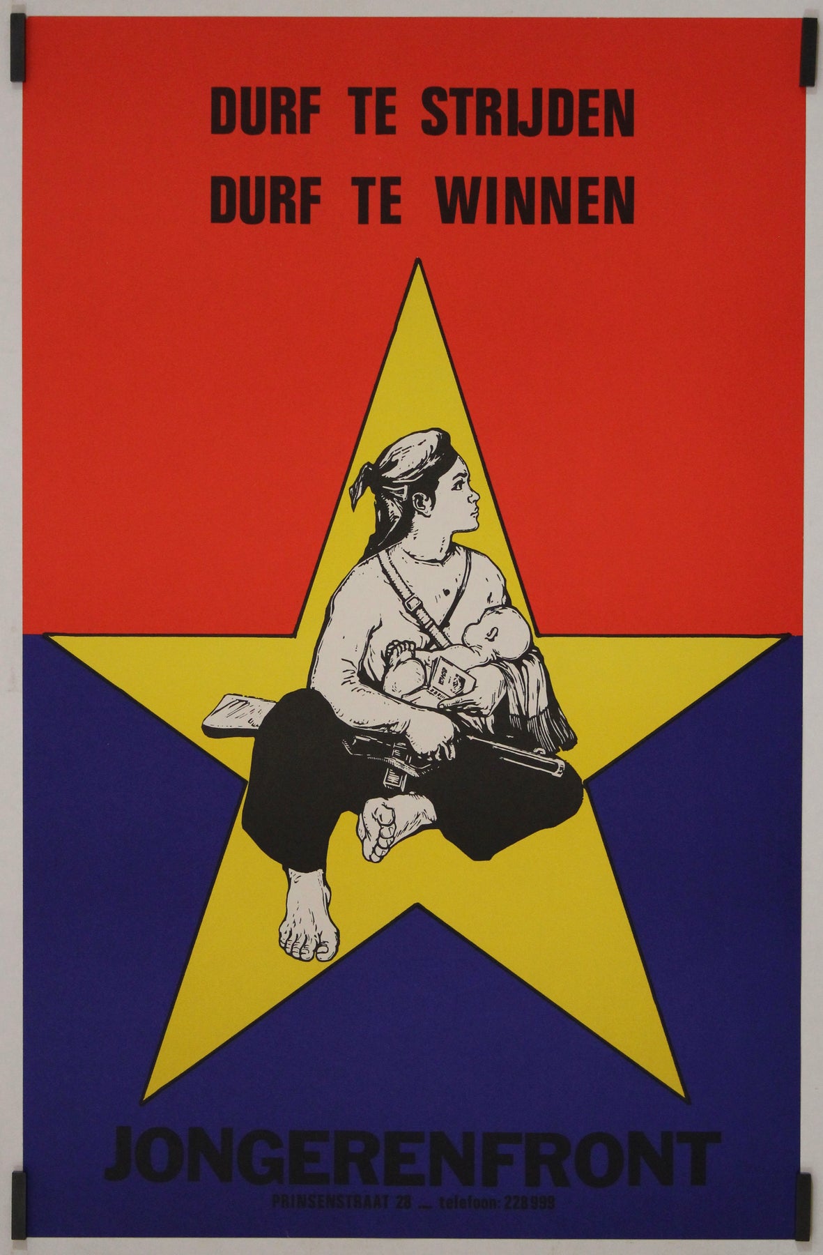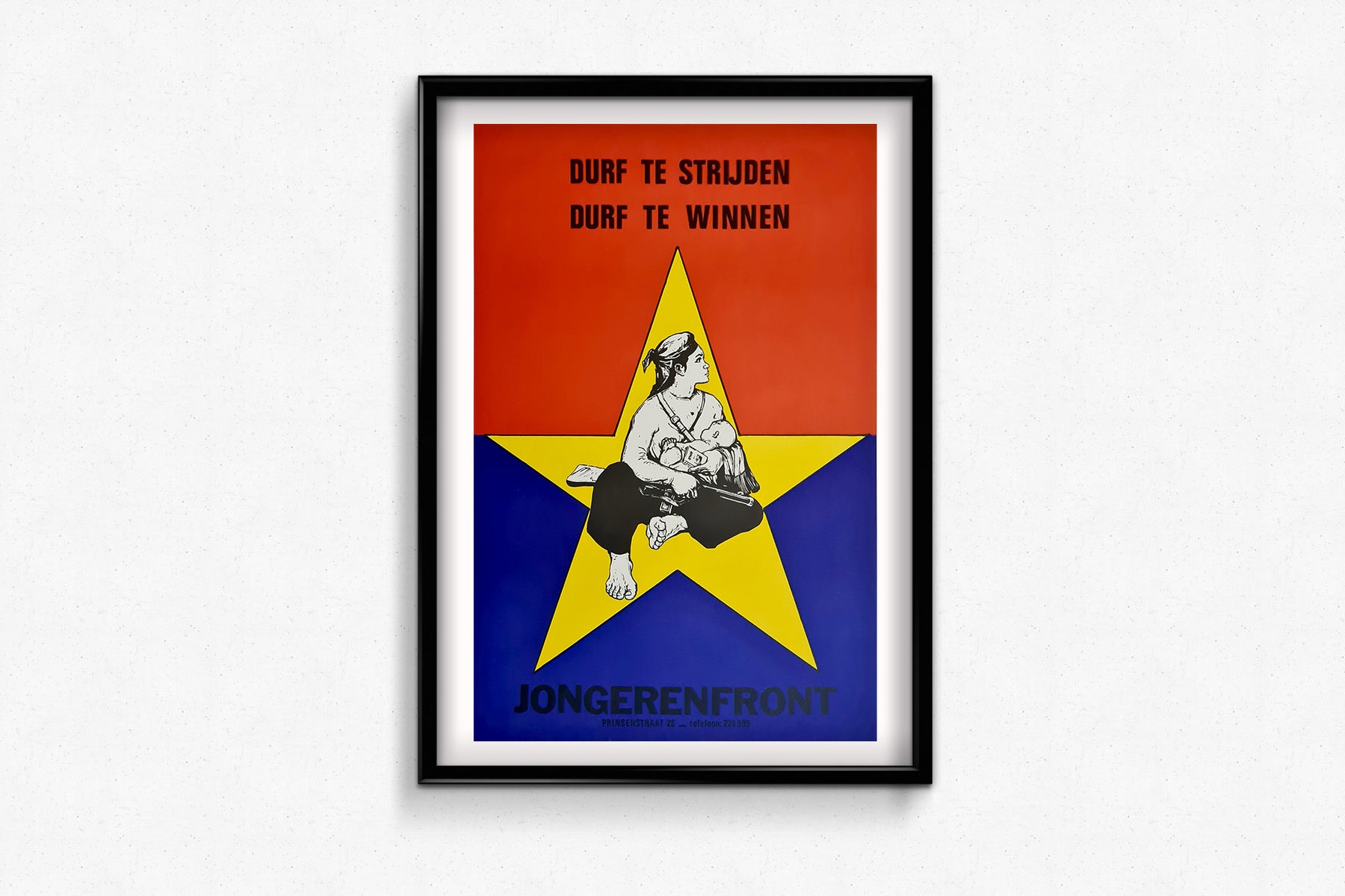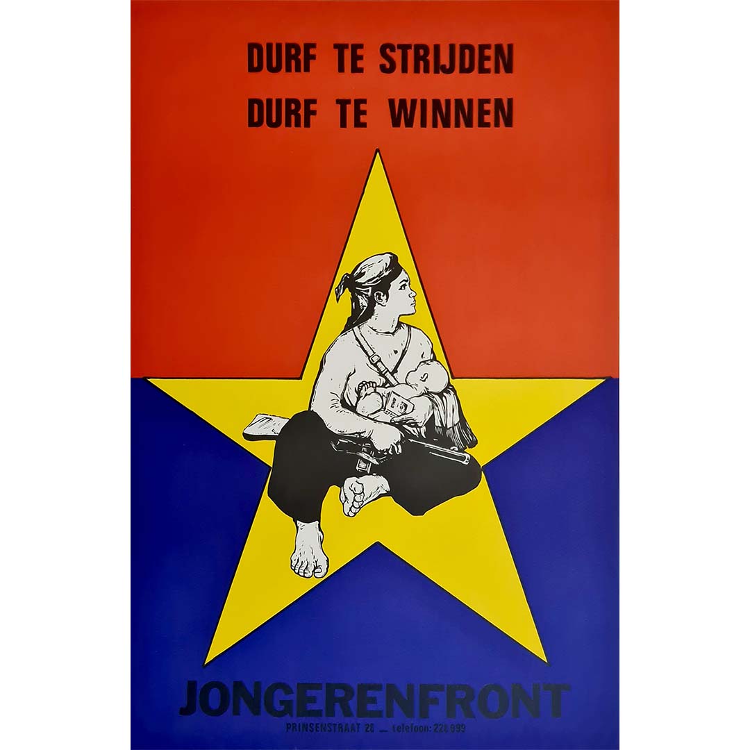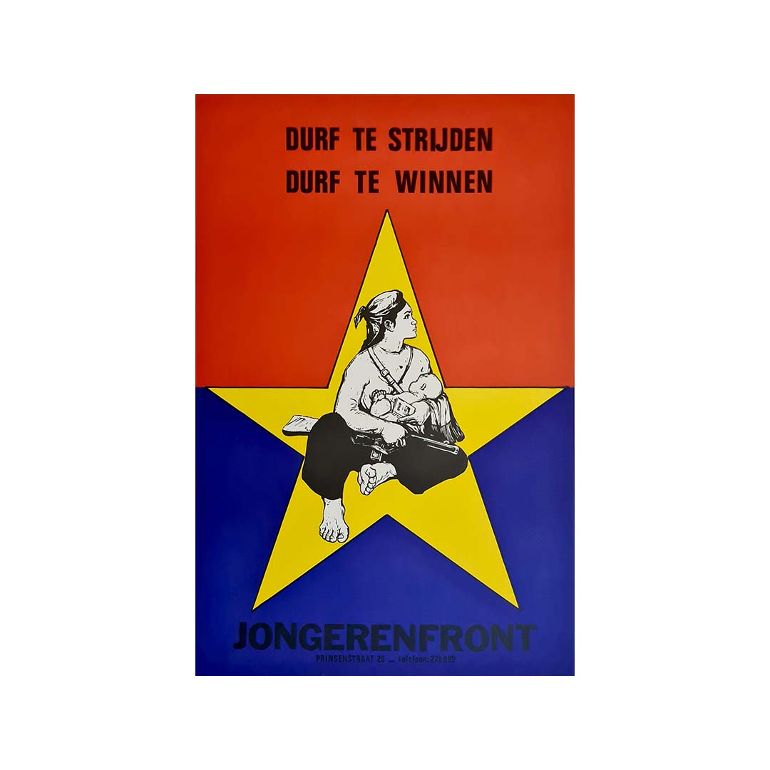 Cette affiche politique néerlandaise de 1973 a été créée pour Jongerenfront, un mouvement de jeunesse radical prônant l'anti-impérialisme et la solidarité révolutionnaire. Son imagerie percutante et ses couleurs vives reflètent la position militante du groupe et son soutien aux luttes de libération à travers le monde, notamment au Vietnam durant les dernières années de la guerre.