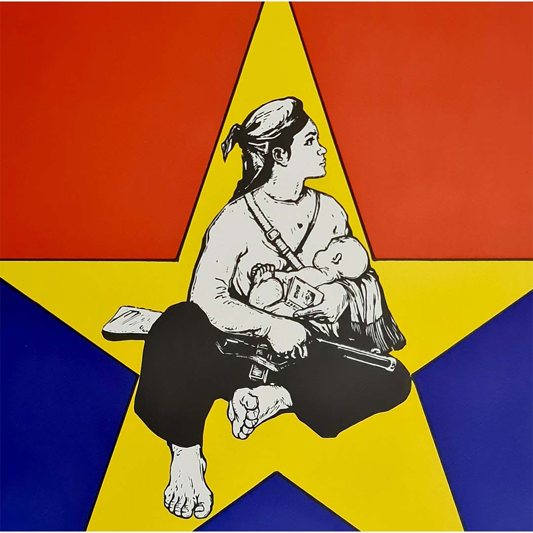 L'image centrale représente une Vietnamienne pieds nus allaitant son enfant tout en tenant un fusil, symbolisant le point de rencontre entre maternité et résistance. Ce contraste saisissant illustre à la fois le rôle nourricier et le rôle combattant des femmes dans la lutte pour la libération nationale.