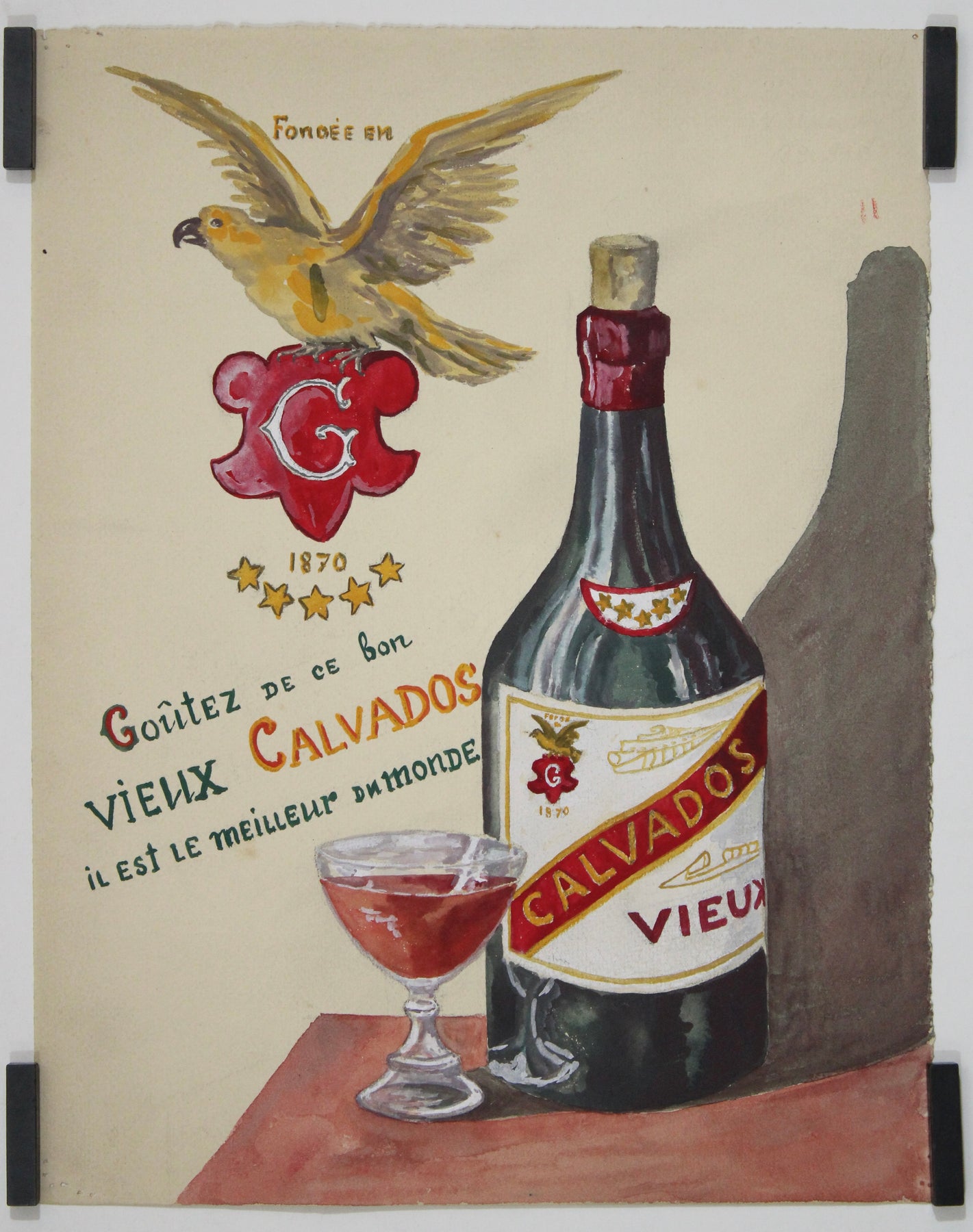 Au centre de la scène trône une imposante bouteille de Vieux Calvados, flanquée d'une coupe ample qui laisse deviner la richesse ambrée de ce nectar. Au-dessus, un aigle royal plane au-dessus d'un blason rouge orné de la lettre G et de la date 1870, soulignant l'héritage et la tradition de la marque. Cinq étoiles accompagnent l'emblème, symbole d'excellence – une figure stylistique typique des publicités françaises d'époque.