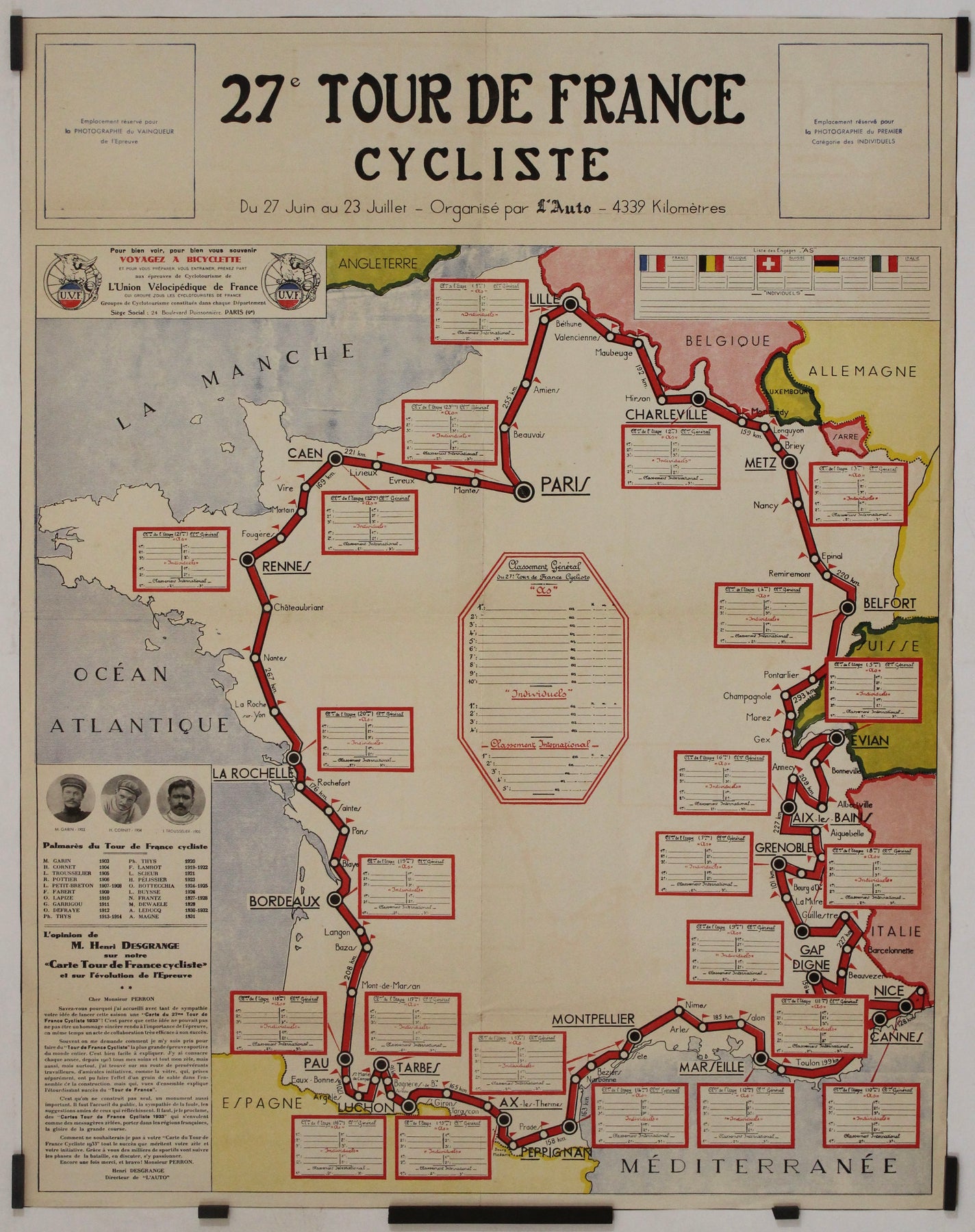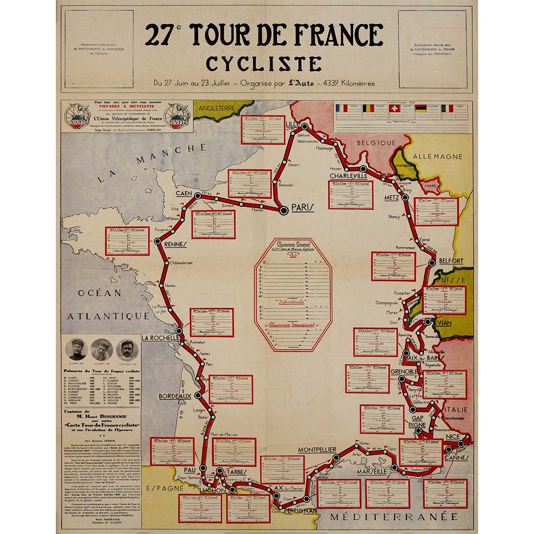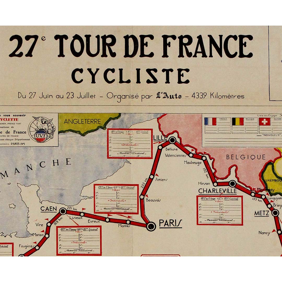Cette carte-affiche rare et visuellement captivante est à la fois un document historique et une œuvre d'art, témoignant de l'enthousiasme et de l'importance du Tour de France à l'âge d'or du cyclisme. Sa cartographie détaillée, sa typographie d'époque et son contexte historique en font une pièce très recherchée par les collectionneurs d'objets liés au cyclisme, d'affiches sportives anciennes et d'histoire du sport français.