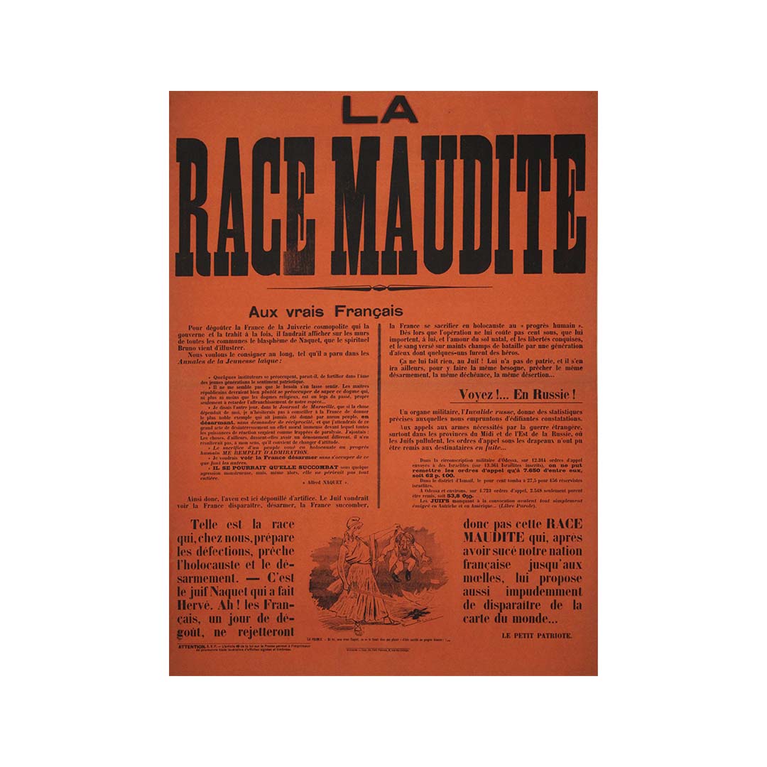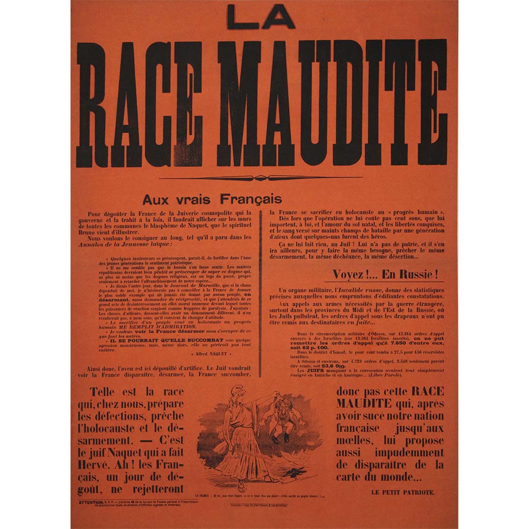 Le titre, « La Race Maudite » , révèle d'emblée le ton agressif de l'affiche, qui cible des groupes spécifiques par des accusations et un langage incendiaires. Visant à mobiliser les « vrais citoyens français », elle mêle rhétorique conspirationniste et appel à l'action, mettant en garde contre des menaces perçues comme pesant sur la nation. Le texte de l'affiche, fortement imprégné d'idéologie nationaliste, accuse ses adversaires de saper le tissu moral et culturel de la France.