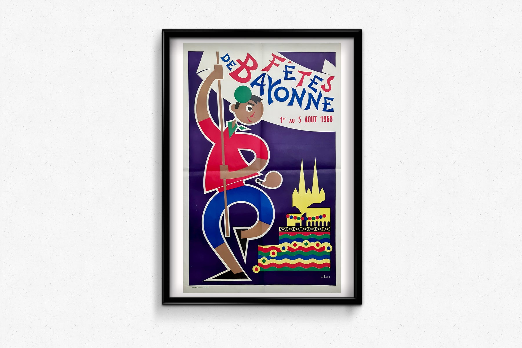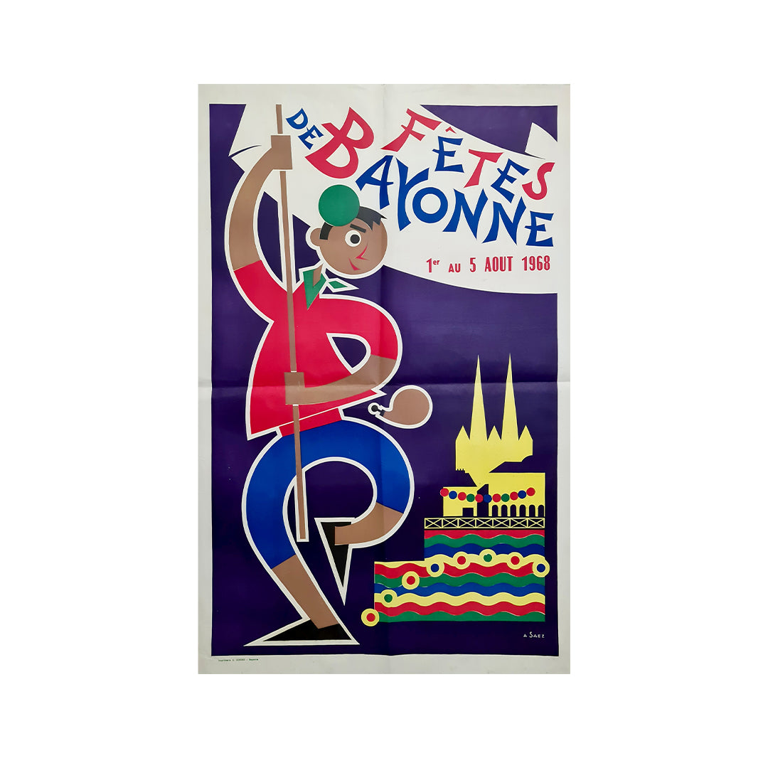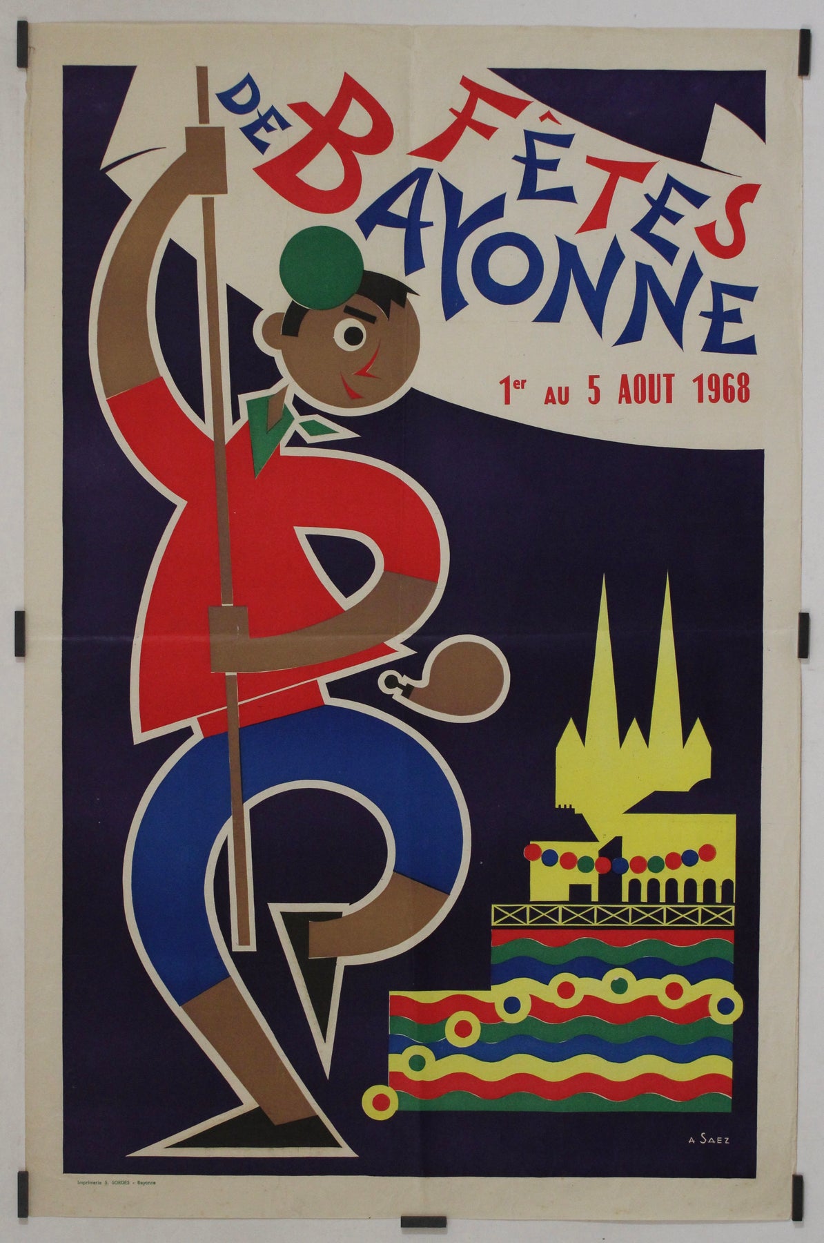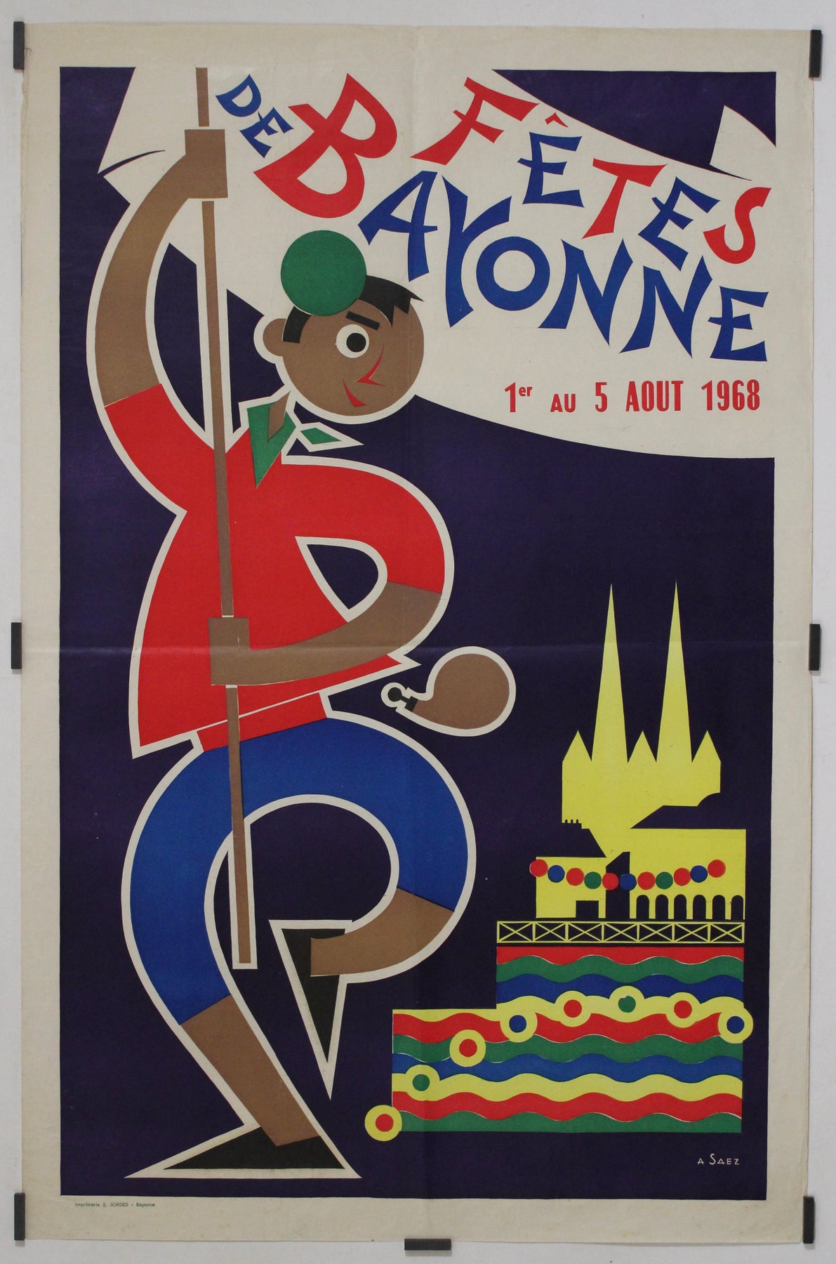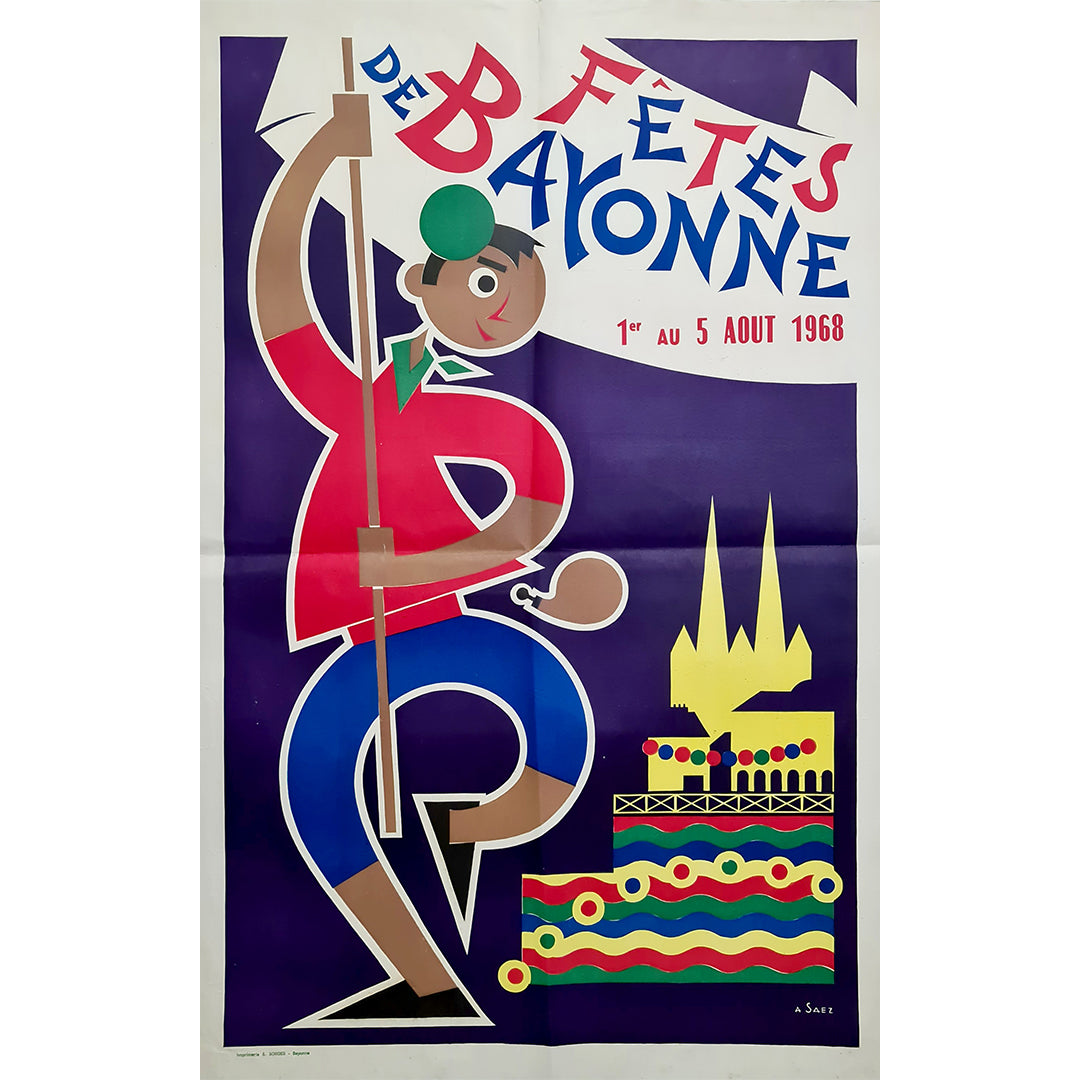Cette affiche originale de 1968, signée par l'artiste français A. Saez, célèbre l'un des événements les plus emblématiques et exubérants du Sud-Ouest de la France : les Fêtes de Bayonne. Conçue dans un style graphique saisissant typique du milieu du XXe siècle, la composition déborde de couleurs, d'énergie et d'esprit festif, capturant à merveille l'atmosphère de cette fête estivale qui s'est déroulée du 1er au 5 août 1968 .