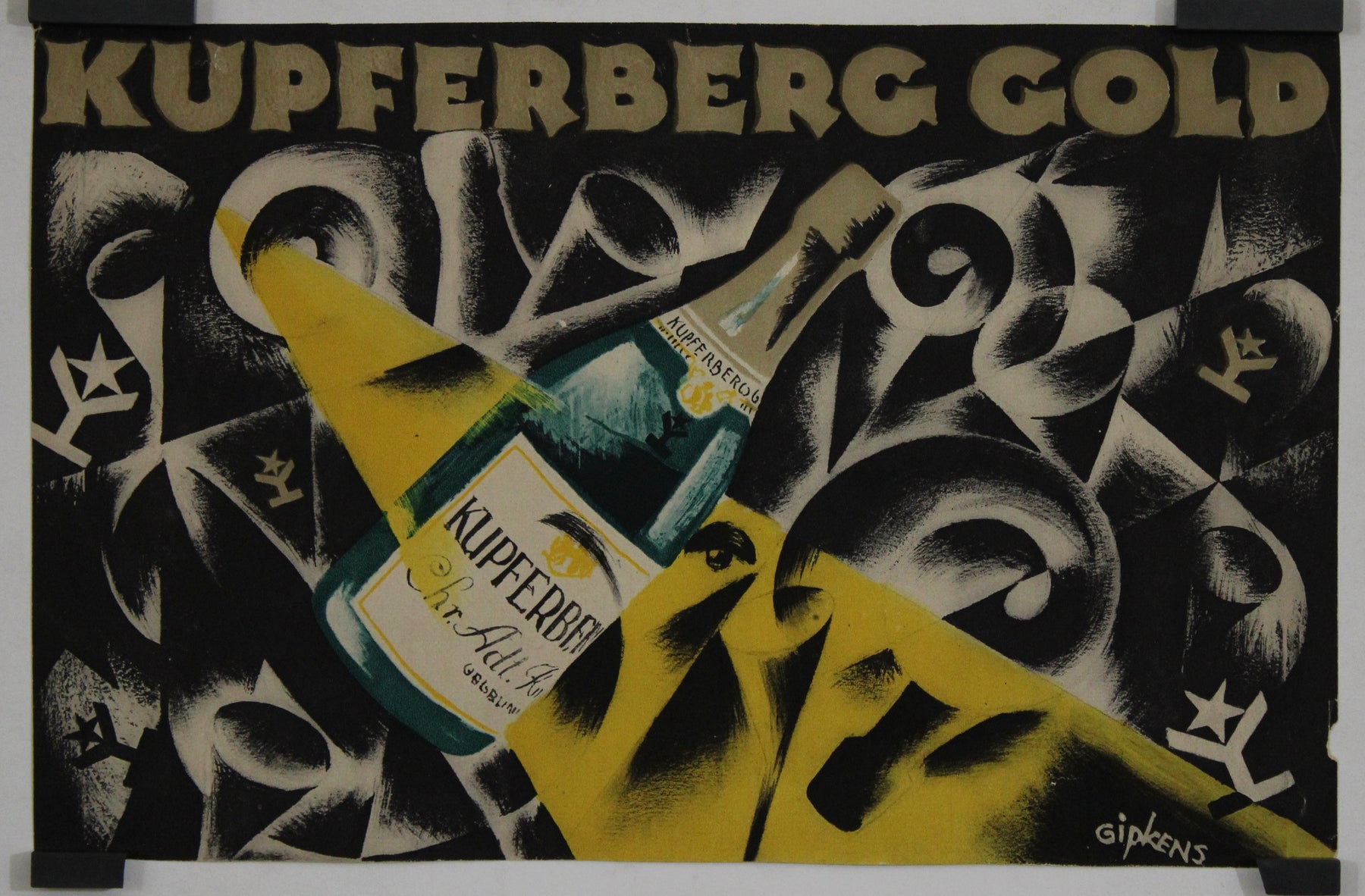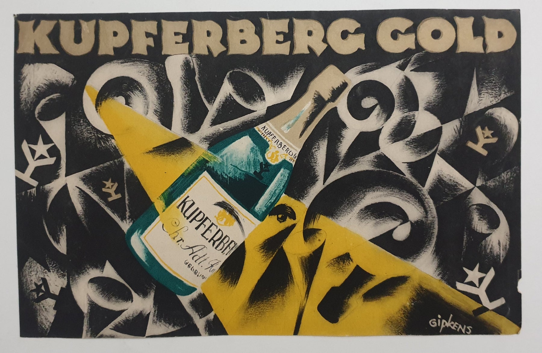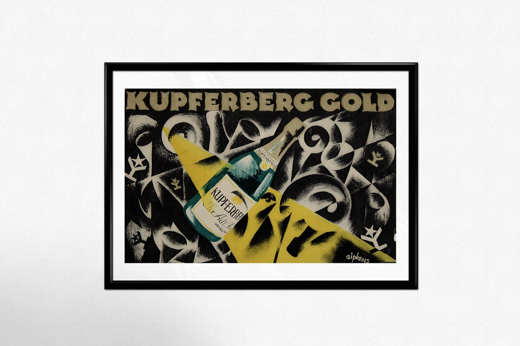Kupferberg Gold, l'une des marques de vin mousseux les plus anciennes et les plus prestigieuses d'Allemagne, était souvent associée à l'élégance, au raffinement et aux occasions festives. L'approche de Gipkens pour cette publicité reflète cet esprit, combinant des éléments d'inspiration cubiste et une abstraction dynamique pour créer une impression de vivacité et de modernité. La typographie audacieuse en trois dimensions en haut renforce encore la forte présence de la marque.