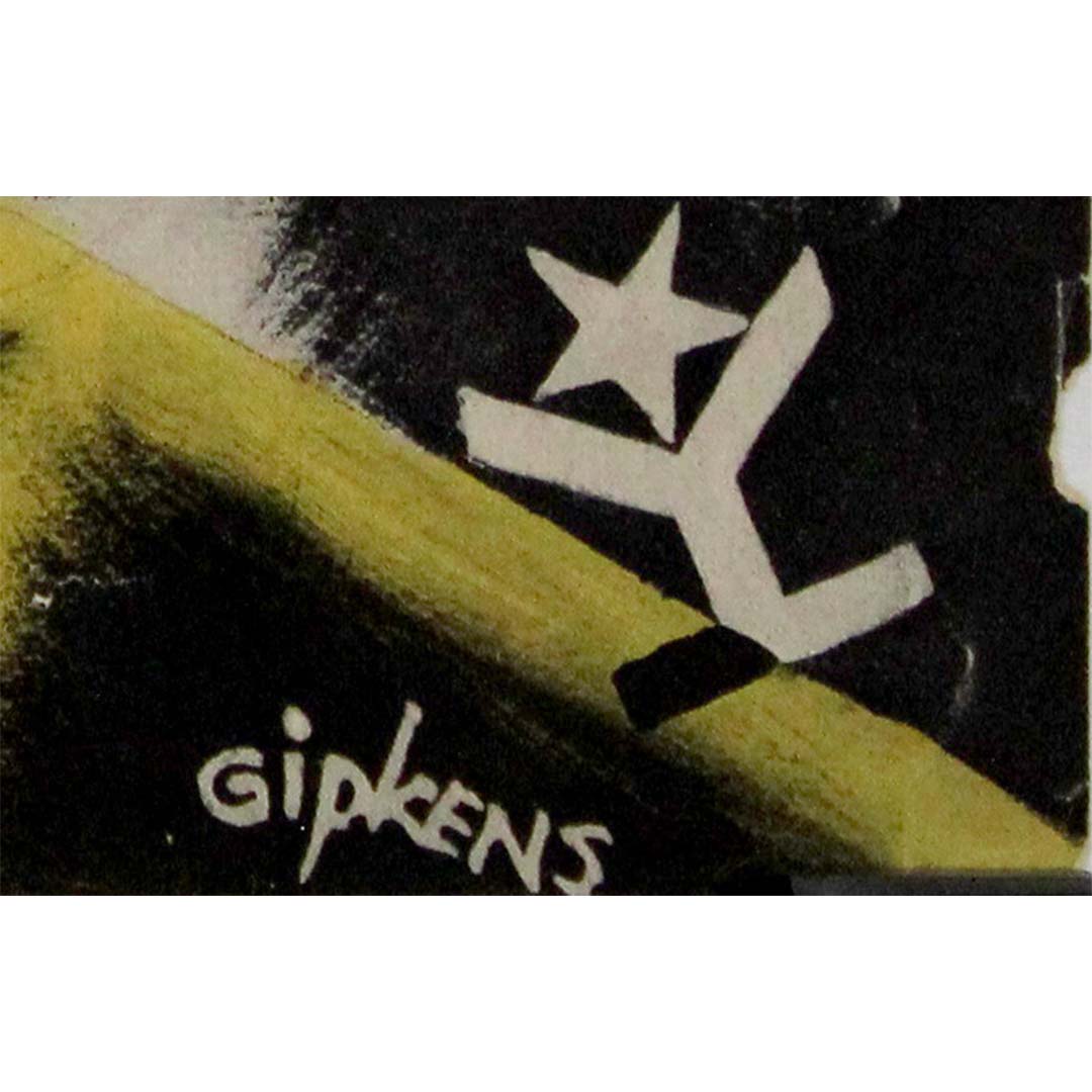 Dans cette œuvre, Gipkens présente une bouteille de vin mousseux Kupferberg Gold, élégamment disposée sur un fond abstrait de formes tourbillonnantes, de motifs géométriques et d'images festives. La composition rayonne de mouvement et d'énergie, évoquant l'effervescence et le raffinement du vin. Le choix des teintes jaunes et noires accentue le contraste, faisant ressortir avec éclat les éléments centraux : la bouteille et la nappe dorée festive.