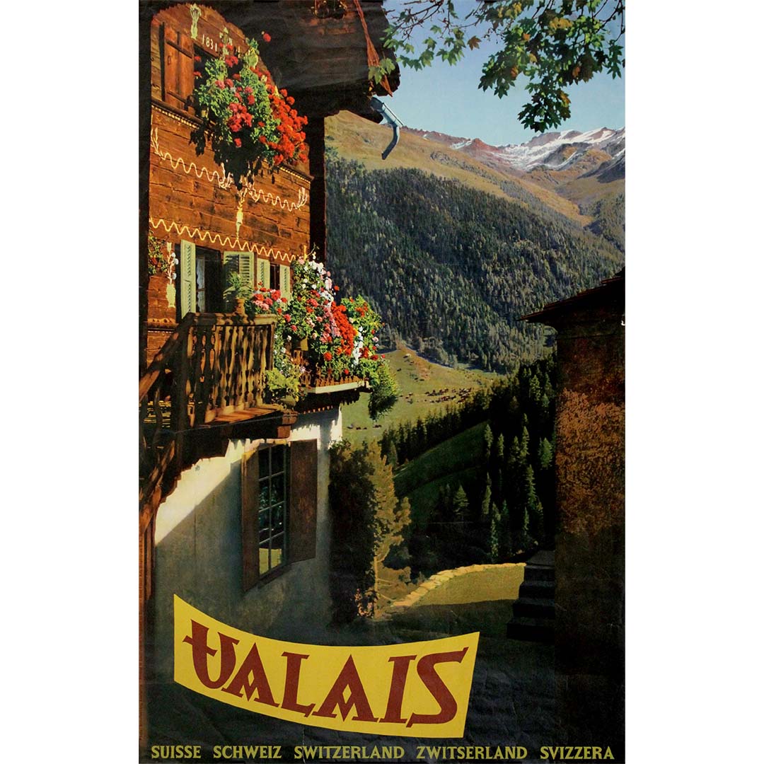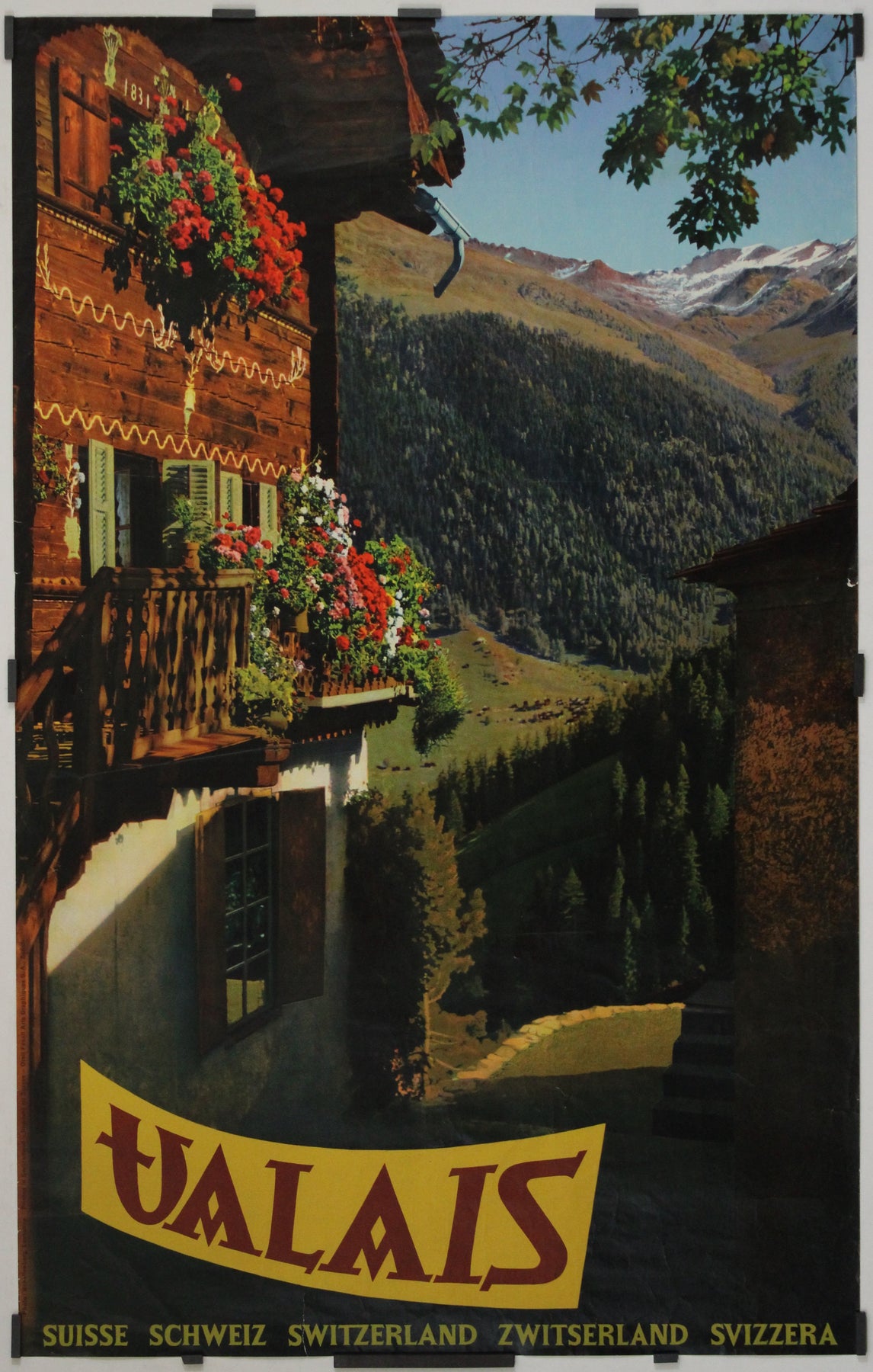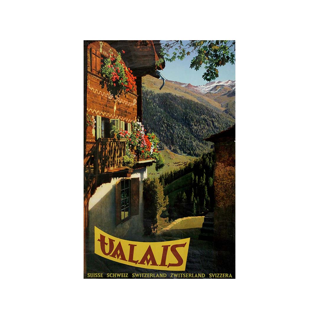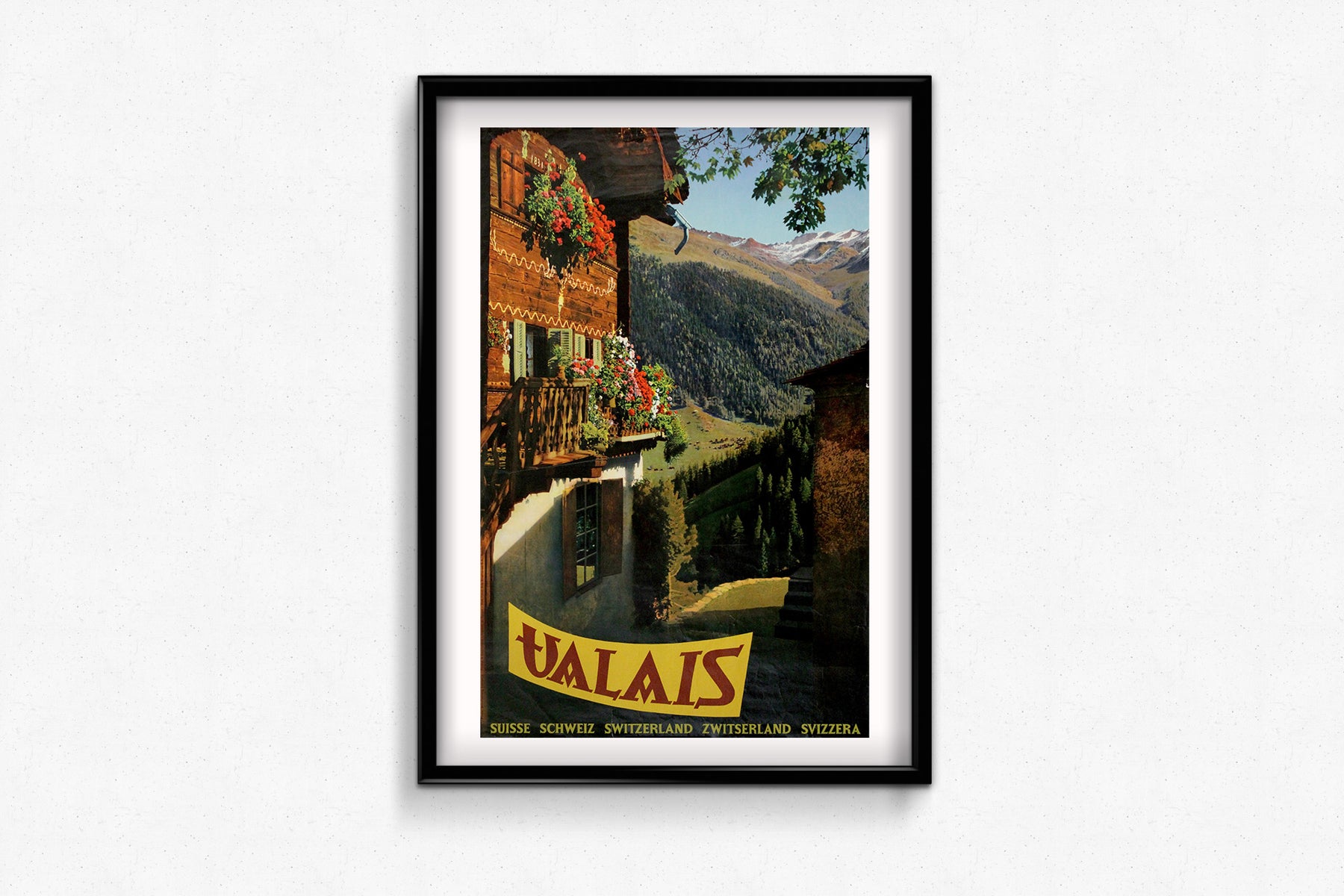 Cette superbe affiche de voyage originale de Hans Heinrich Schellenberg, datant des années 1960 et intitulée « Valais – Suisse », capture à merveille le charme pittoresque de la région suisse du Valais. Imprimée par la célèbre imprimerie Orell Füssli à Zurich, elle constitue un bel exemple du graphisme suisse du milieu du XXe siècle, reconnu pour la pureté de ses lignes, la vivacité de ses images et la force de ses récits visuels.