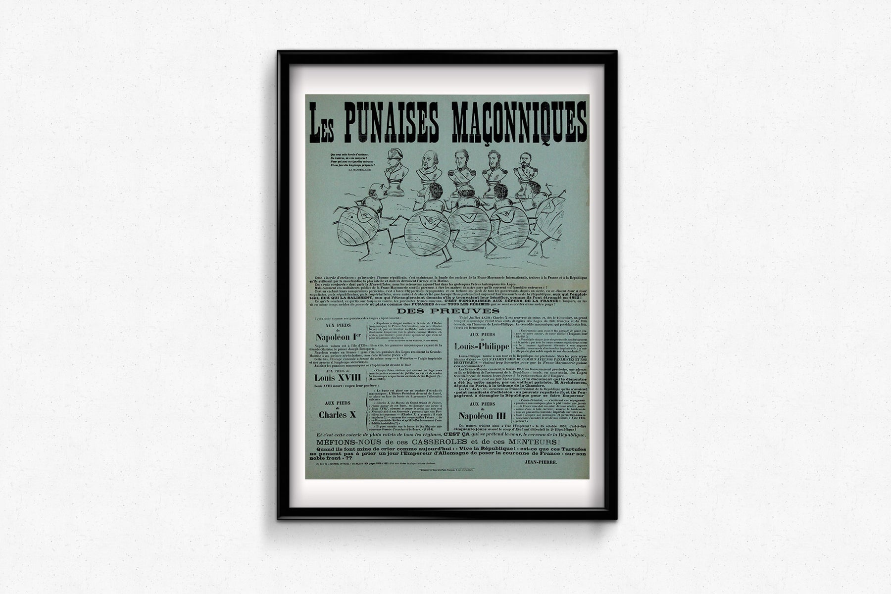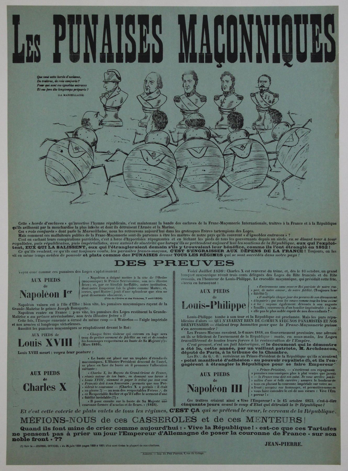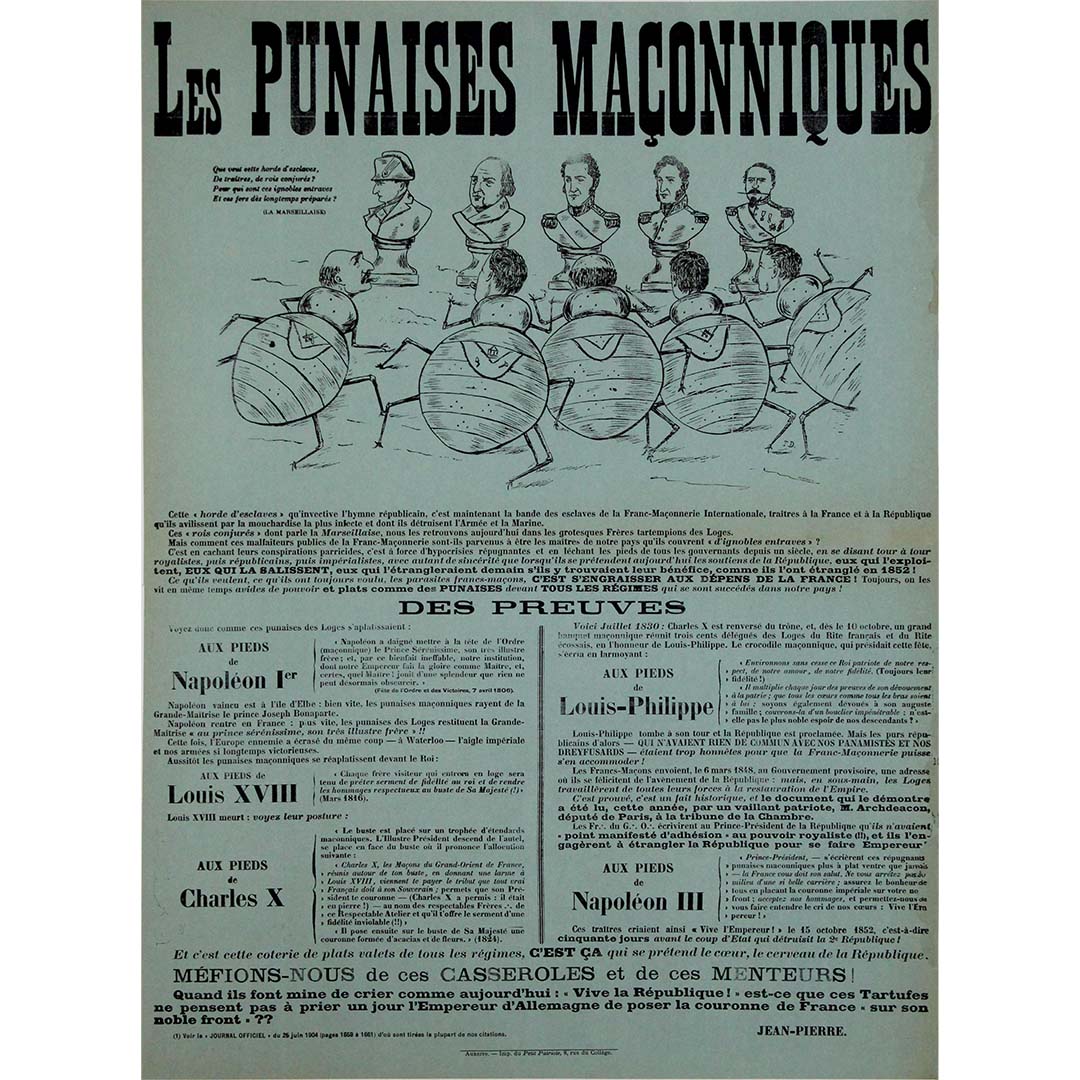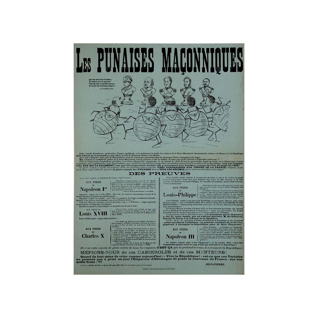 Imprimée sur papier bleu avec de grandes lettres noires en gras, la composition mêle satire politique et rhétorique conspirationniste, thèmes récurrents des débats passionnés qui agitaient la France sur la franc-maçonnerie et le républicanisme. L'illustration en haut de page ridiculise les hauts gradés militaires et politiques, les représentant comme des créatures insectoïdes marchant au pas – une métaphore claire de la corruption, du secret et de la manipulation.