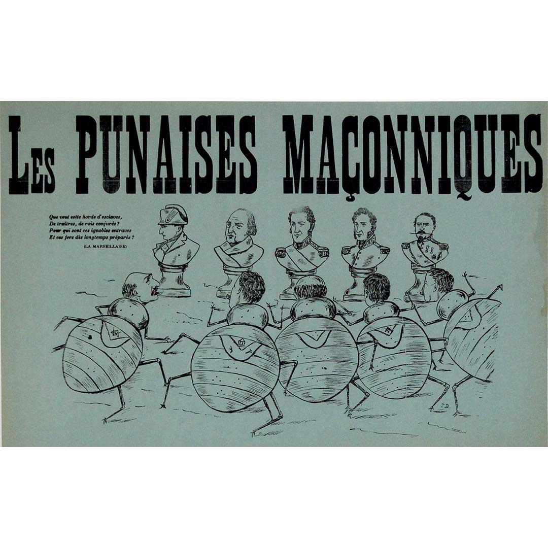Cette rare affiche satirique française datant d'environ 1908, intitulée « Les Punaises Maçonniques » , est un exemple frappant de propagande anti-maçonnique du début du XXe siècle. Conçue par TD, l'affiche utilise la caricature et une typographie audacieuse pour dépeindre la franc-maçonnerie comme une force parasitaire, représentant visuellement les francs-maçons comme des punaises grotesques à tête humaine.