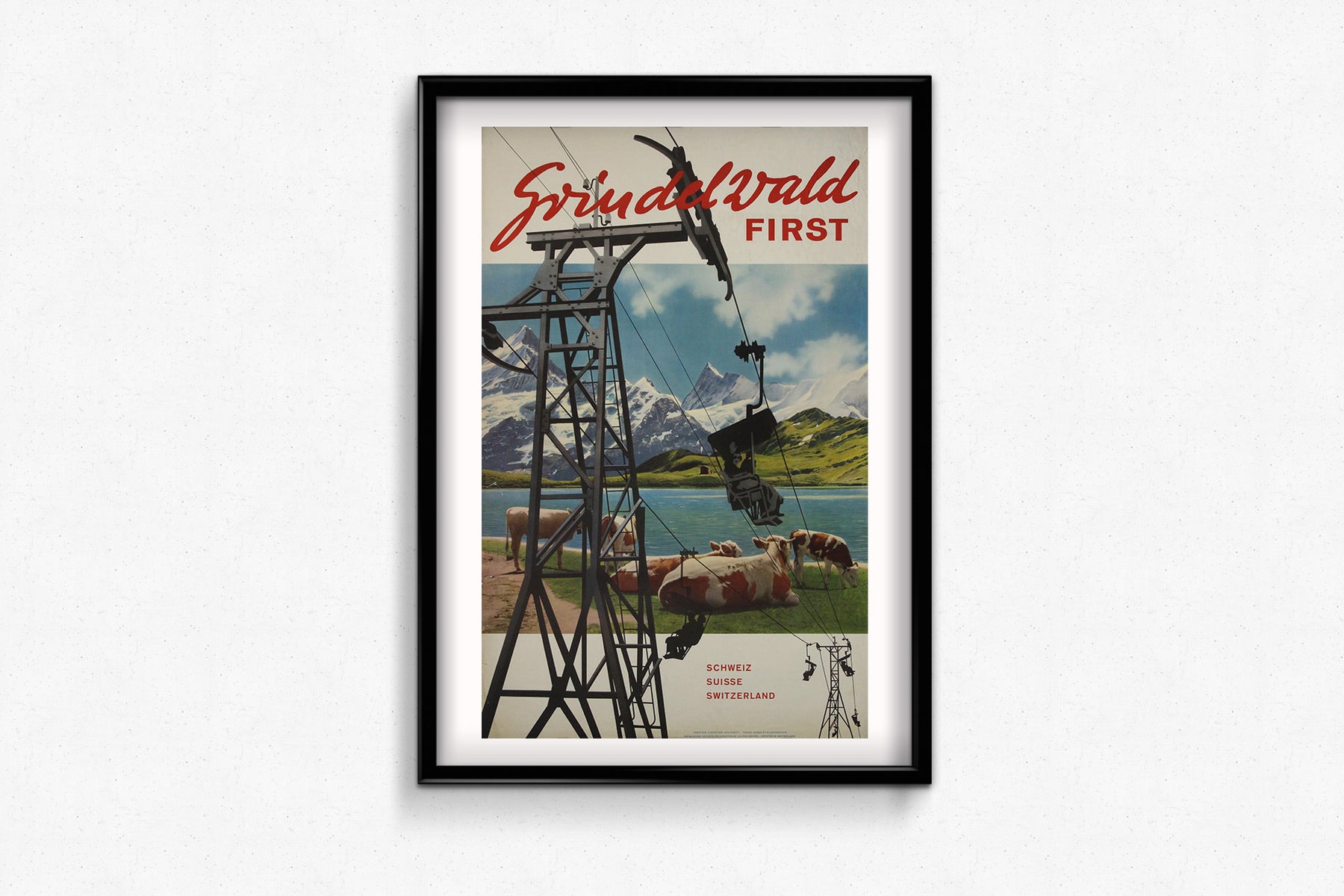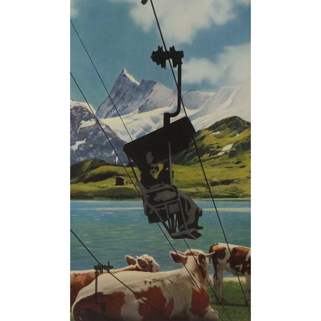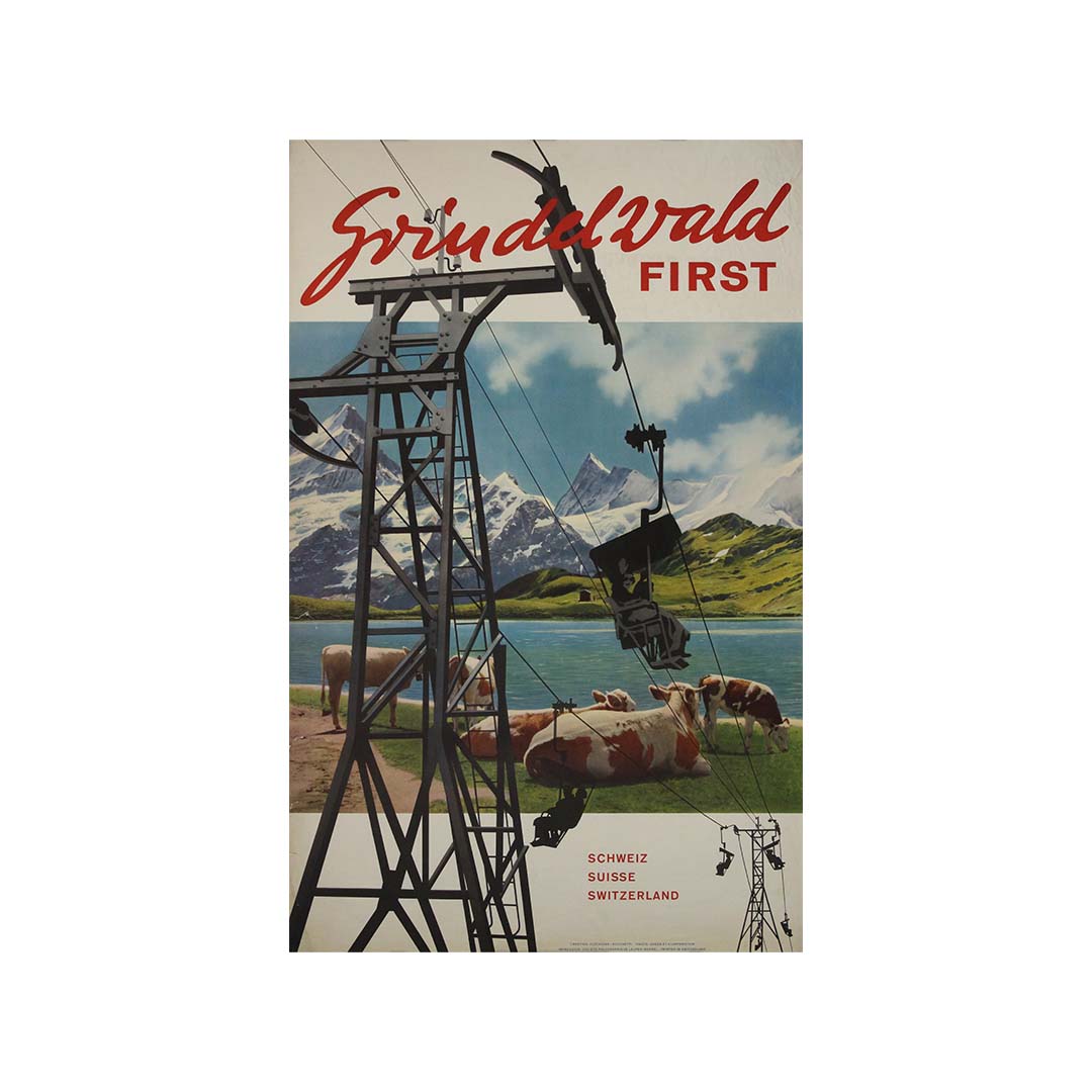 L'affiche « Grindelwald First », créée par Gyger & Klopfenstein dans les années 1950, est une illustration saisissante du tourisme suisse du milieu du XXe siècle. Destinée à attirer les visiteurs dans le village alpin de Grindelwald, elle présente des images à couper le souffle des Alpes bernoises, avec leurs sommets enneigés et leurs pistes de ski idylliques. L'œuvre met l'accent sur l'attrait des sports d'hiver, en phase avec l'essor du ski de loisir et du tourisme de montagne après la guerre. Ses couleurs éclatantes et sa composition dynamique capturent l'esprit d'aventure et de loisirs de l'époque, faisant d'elle un témoignage précieux de l'histoire de la promotion touristique.