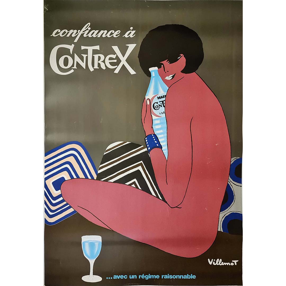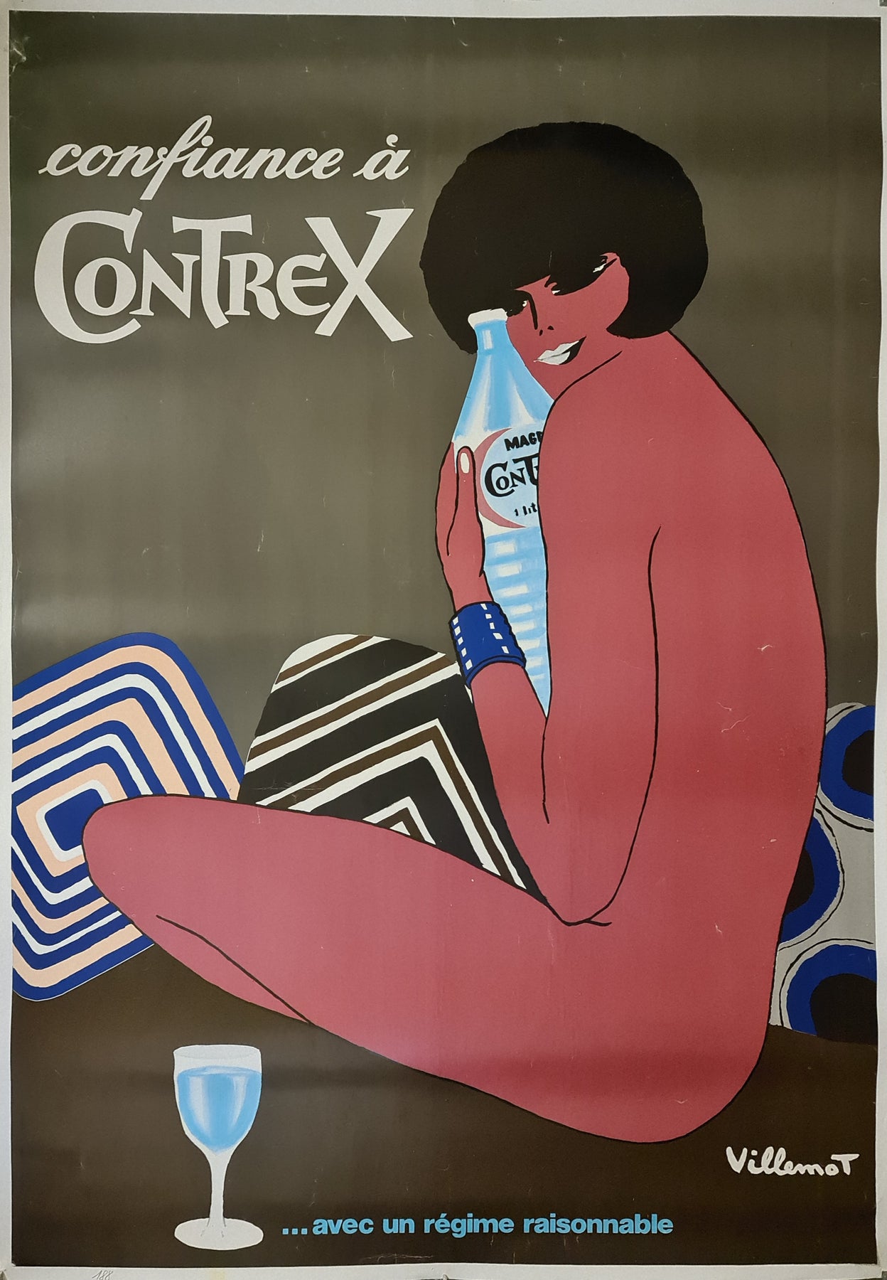 « Confiance à Contrex » illustre parfaitement le talent de Villemot. Une femme, l'air assuré, tient une bouteille d'eau minérale Contrex. La composition est d'une grande élégance.