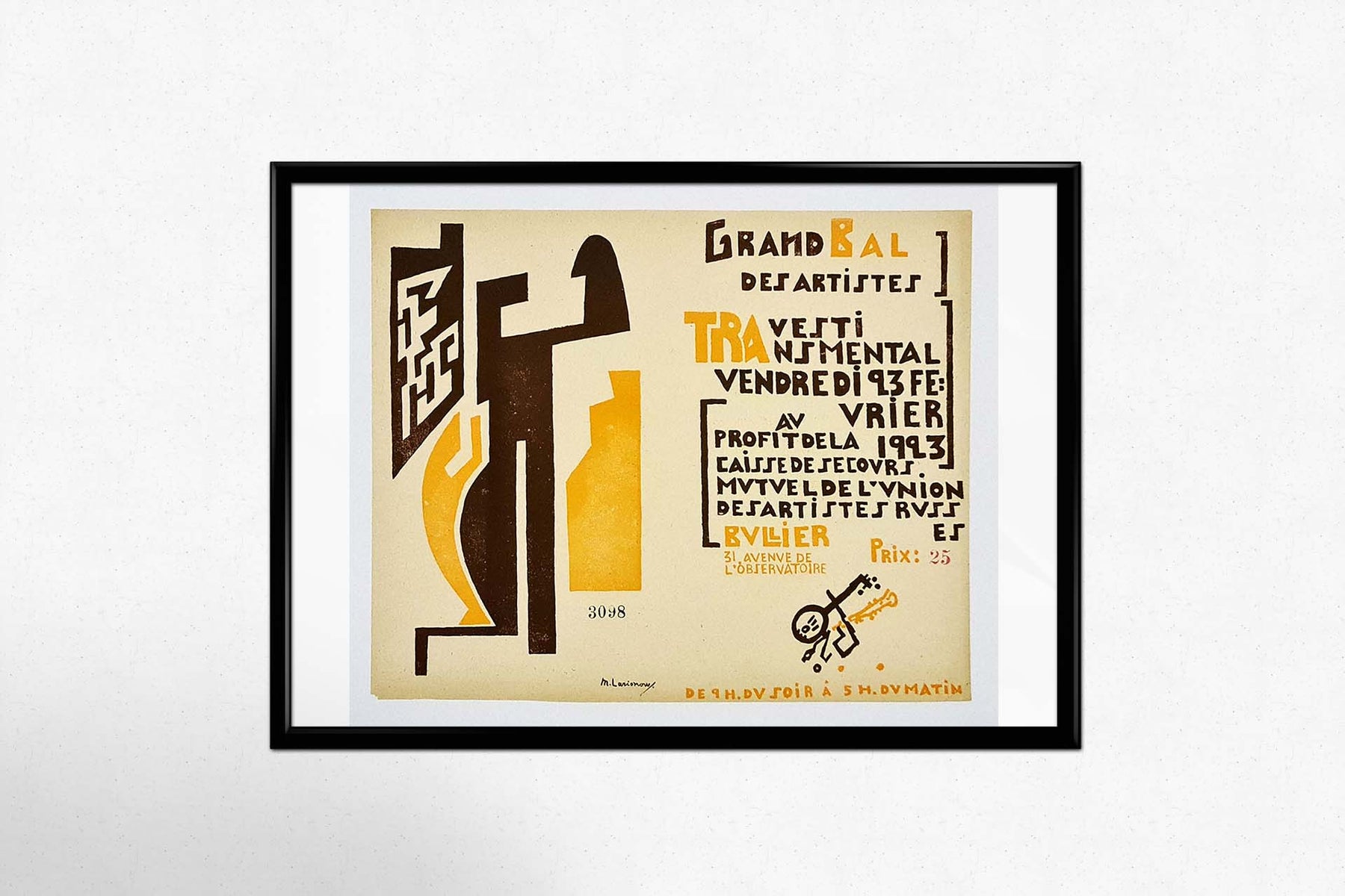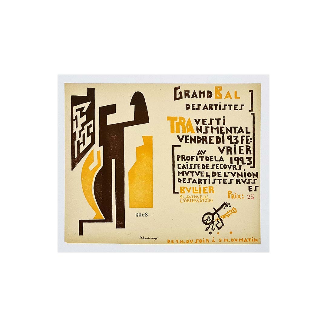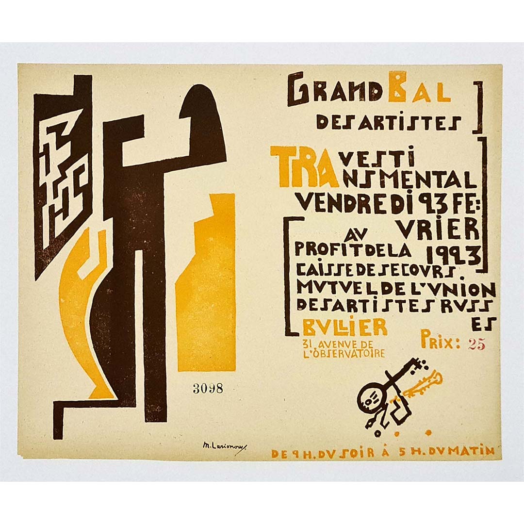 Magnifique affiche de Mikhaïl Fiodorovitch Larionov (1881-1964) pour un bal au profit du fonds d'entraide de l'Union des artistes russes lors du Bal Bullier.