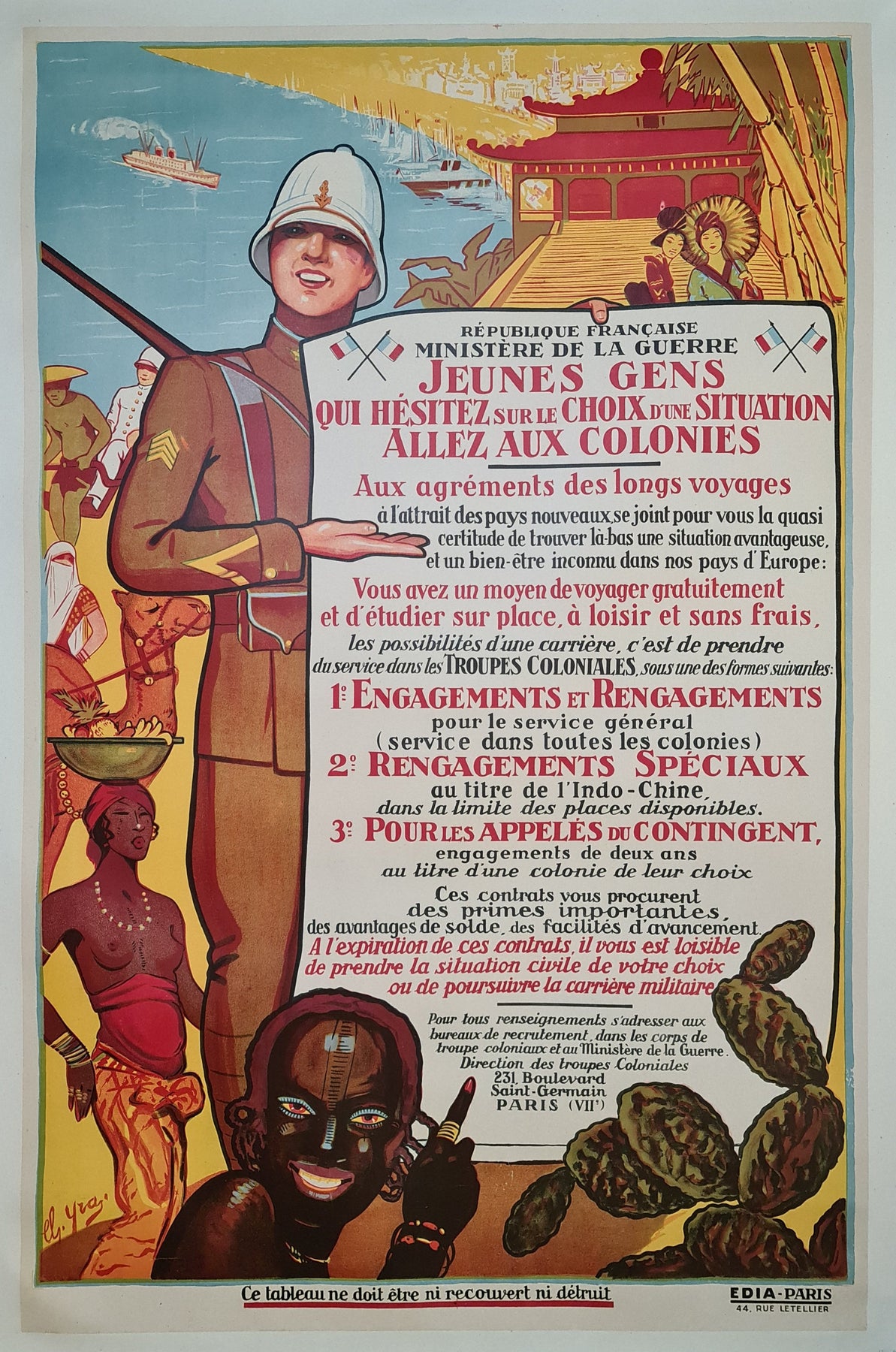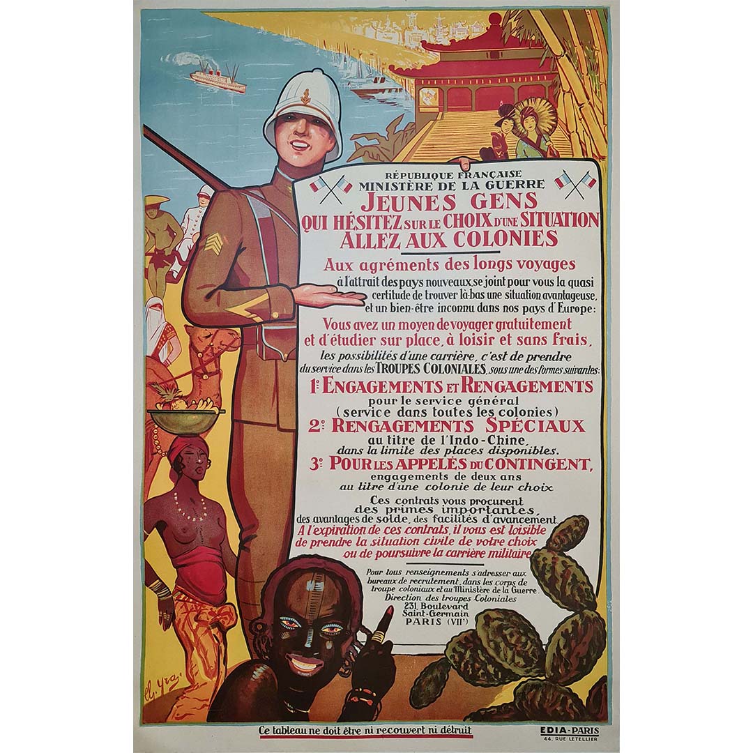 L'affiche de Charles Yray, portant le message percutant « Jeunes Gens qui Hésitez sur le Choix d'une Situation, Allez aux Colonies », est un artefact historique captivant qui nous invite à explorer l'attrait de la vie coloniale.