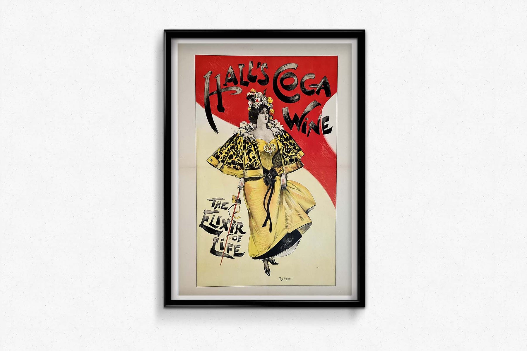 L'affiche de Dudley Hardy Hall de 1915 pour le « vin de coca – l'élixir de vie » offre un aperçu fascinant d'une époque révolue de la publicité. Cette boisson unique associait vin et cocaïne ; parmi les marques les plus connues figurait Vin Mariani, créé par Angelo Mariani en 1863.