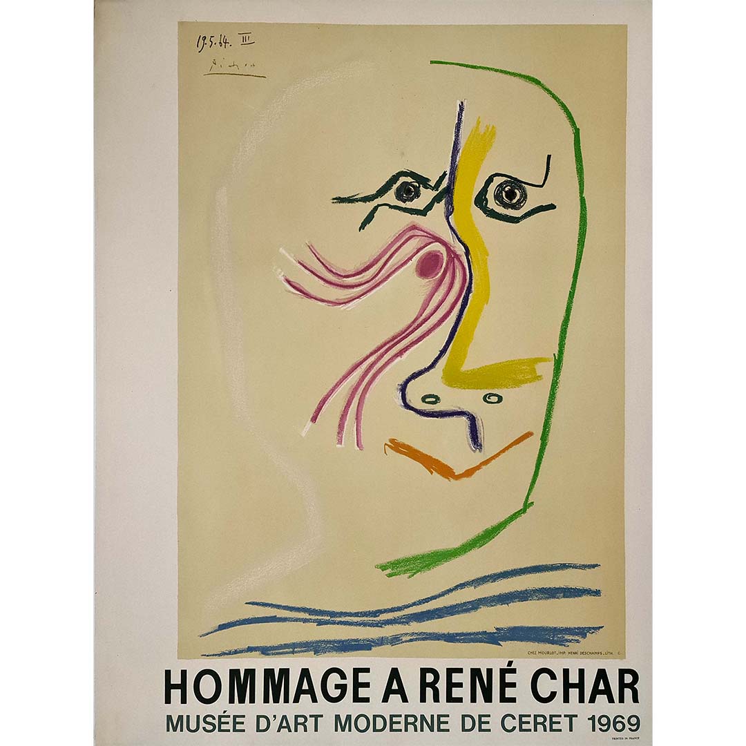 René Char, reconnu pour sa poésie profonde et son exploration des thèmes existentiels, trouva en Picasso un allié précieux. L'affiche annonce une exposition et célèbre l'œuvre littéraire de Char. Le choix du Musée d'art moderne de Céret souligne l'importance de cet hommage dans le contexte de l'art moderne.