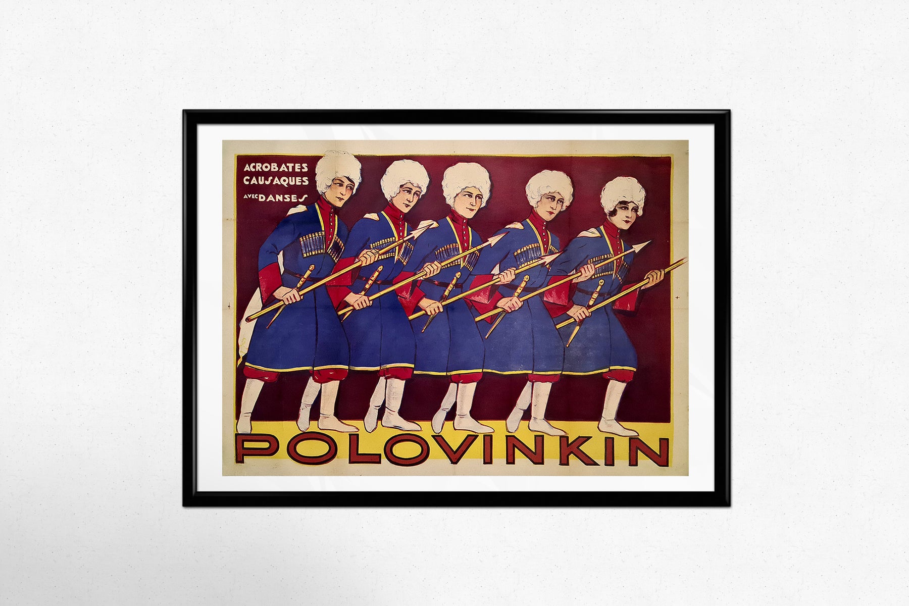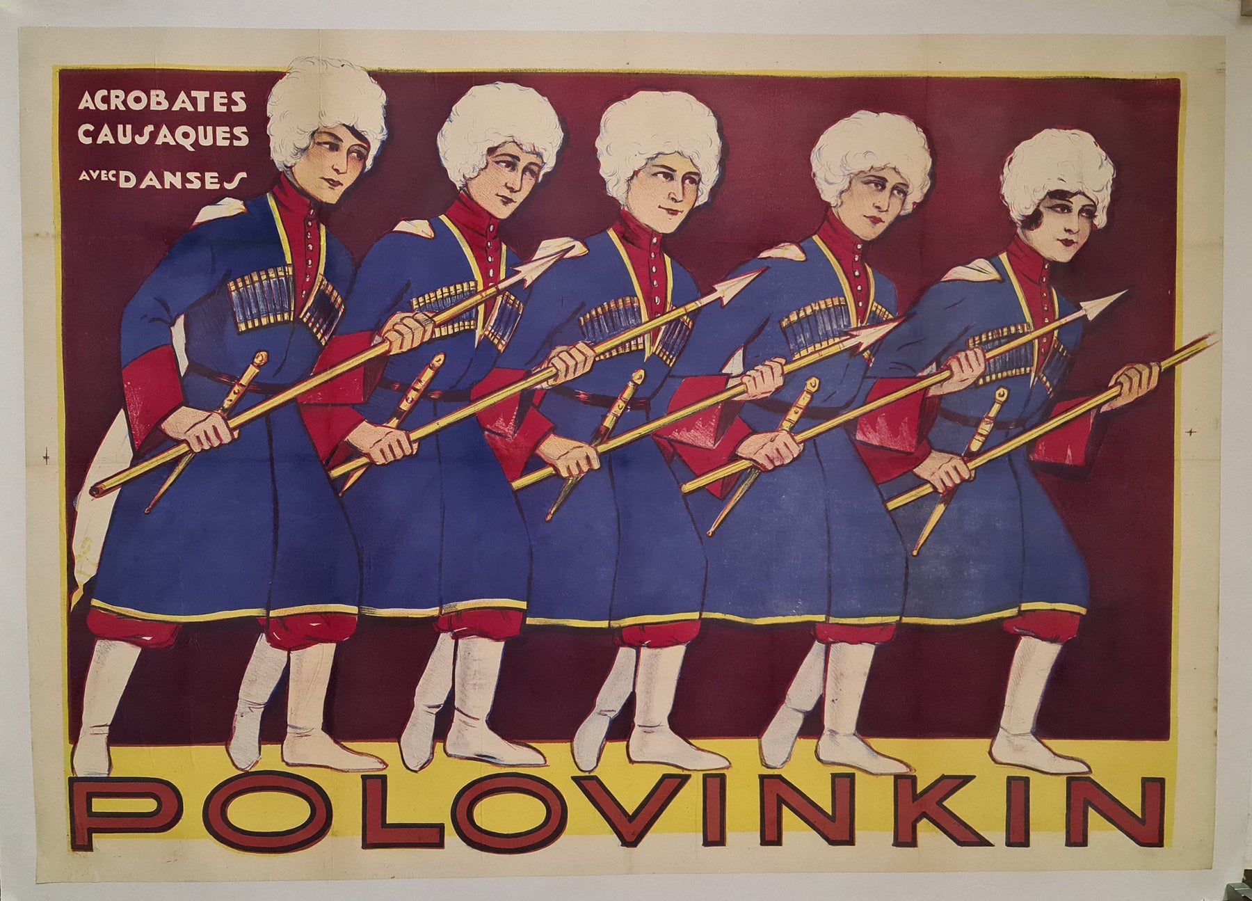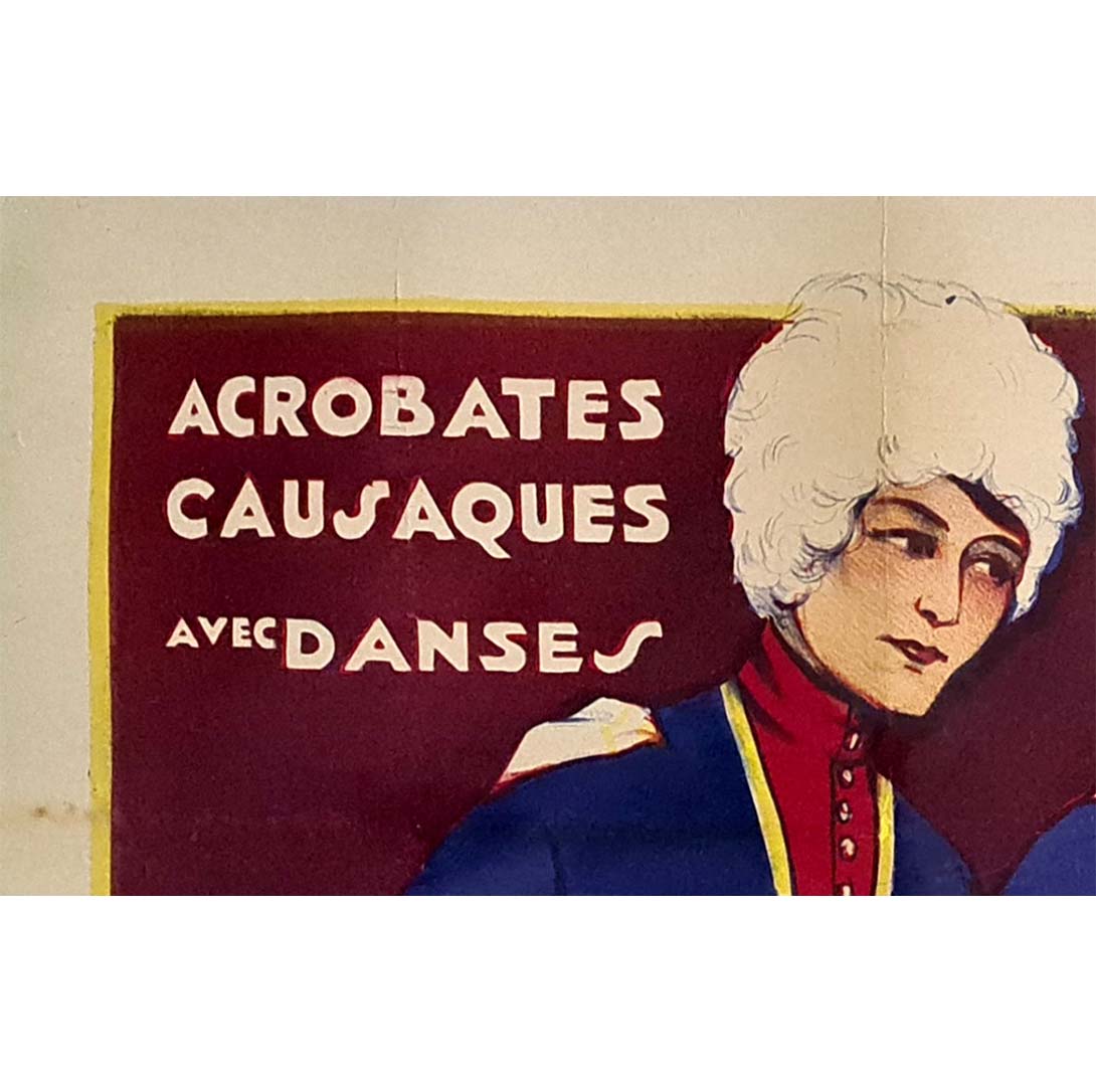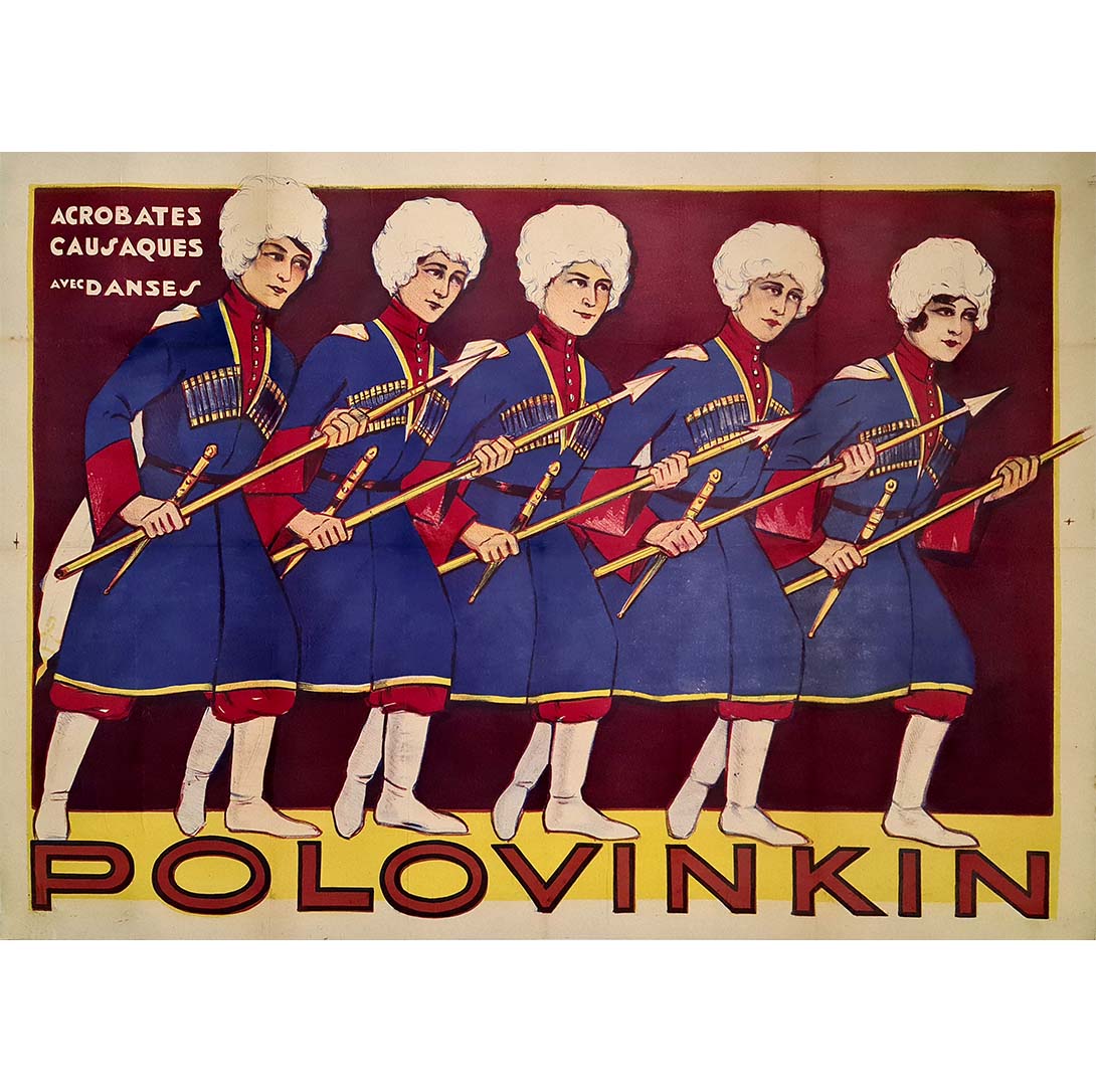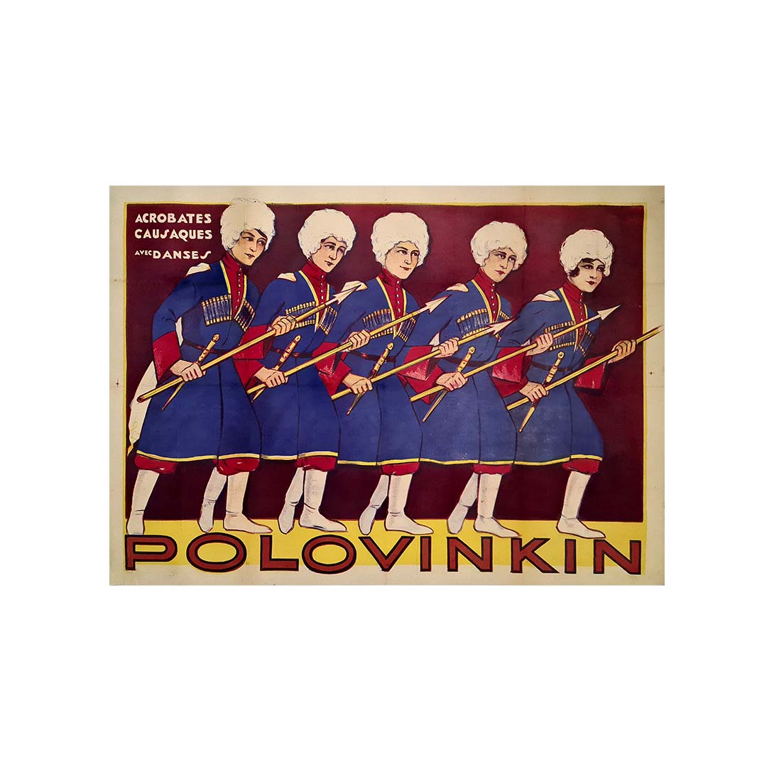 Cette rare affiche originale datant des années 1920 fait la promotion de la troupe Polovinkin , un ensemble renommé d' acrobates et de danseurs cosaques , connus pour leurs performances scéniques électrisantes qui combinaient précision martiale et chorégraphie d'inspiration folklorique.