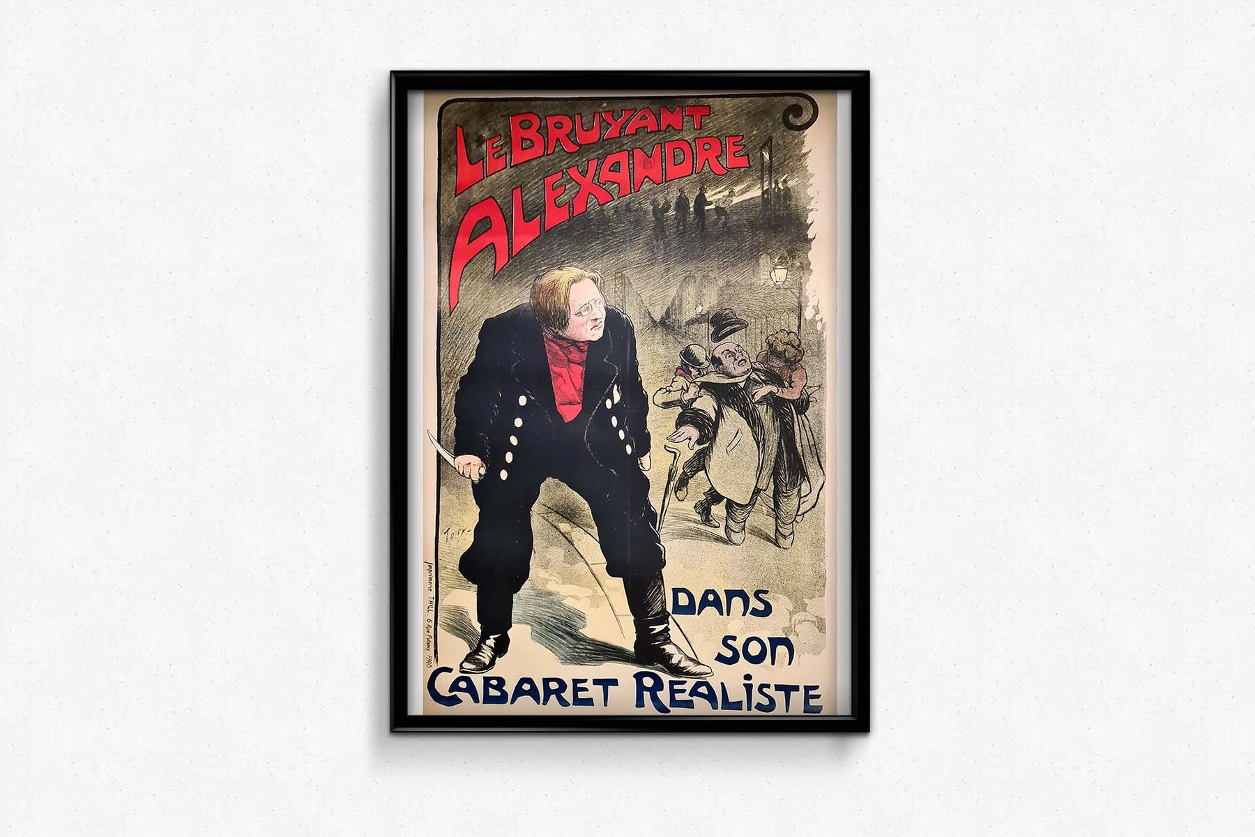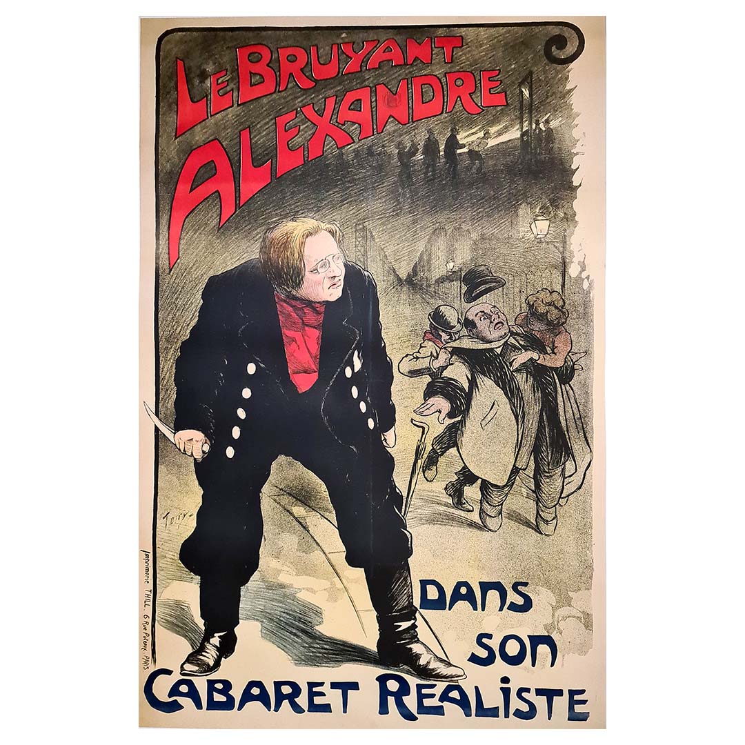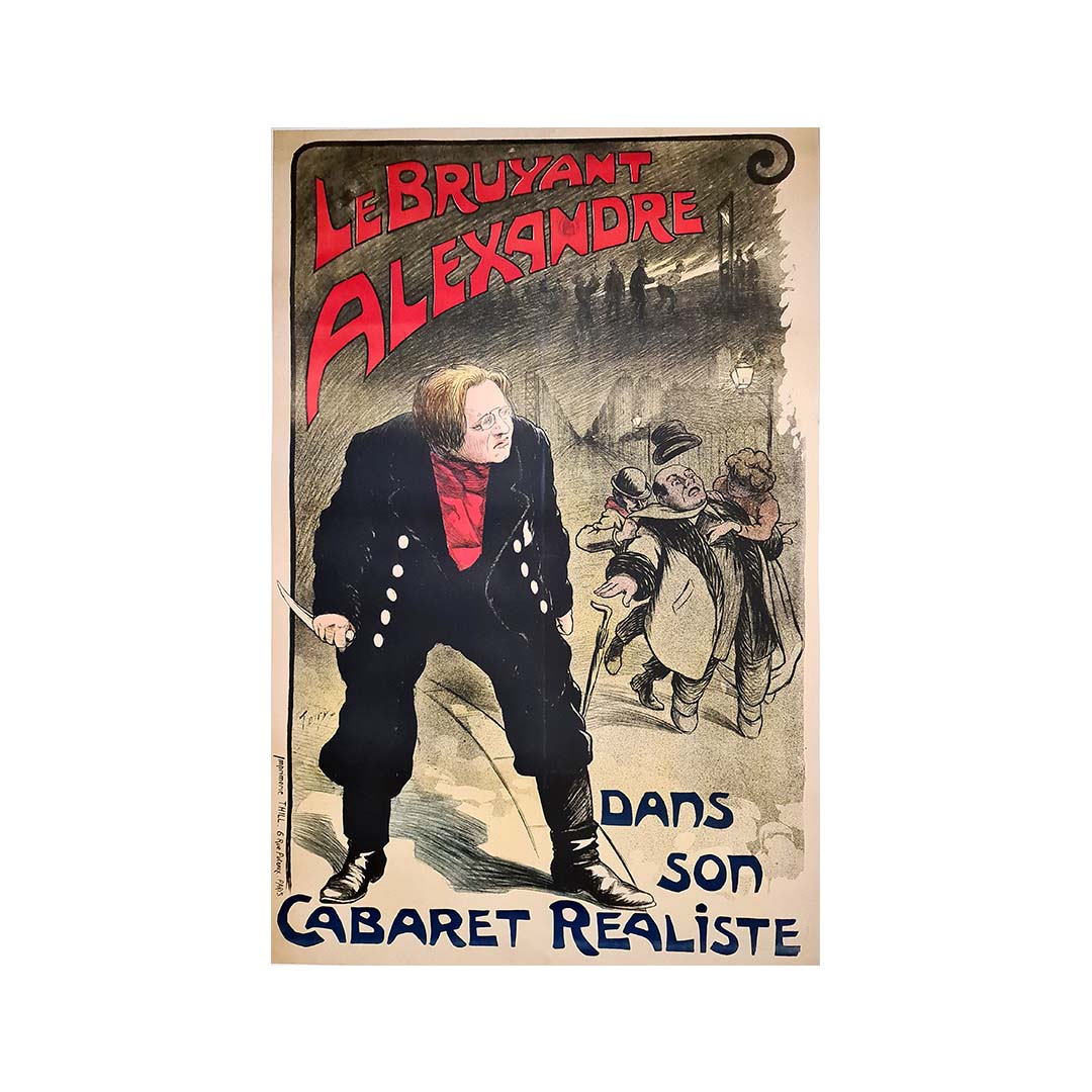 Affiche de style Art nouveau du début du XXe siècle représentant Alexandre Le Bruyant dans son cabaret réaliste, imprimée par l'imprimerie Thill. Alexandre Ernest Célestin Leclerc, né le 2 juin 1866 à Josselin, dit Alexandre Le Bruyant, était un chansonnier de Montmartre, dans la lignée d'Aristide Bruant (1851-1925) avec lequel il fit ses débuts. Le Bruyant acquit une renommée particulière pendant la guerre grâce à son répertoire de chansons patriotiques et à son engagement dans des œuvres caritatives au profit du Poilus.
