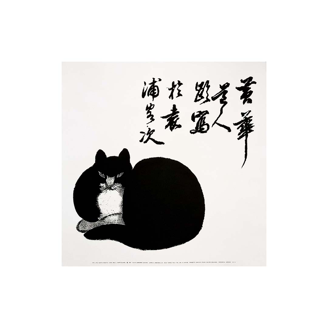 Affiche originale de Chu Ling, imprimée en 1991 et intitulée Gatto Seduto (Chat accroupi). Cette affiche, réalisée en sérigraphie, est éditée par Silvio Zamorani à Turin.
