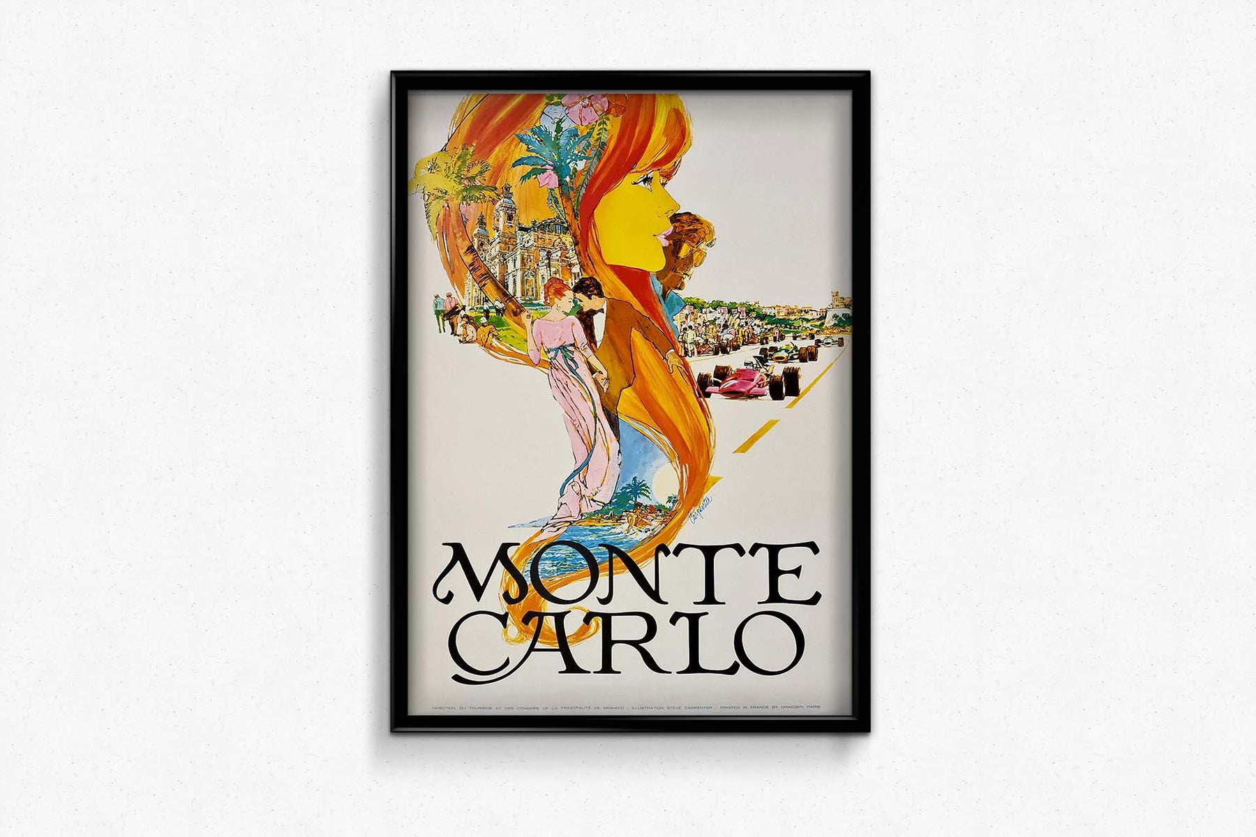 Belle affiche touristique de Steve Carpenter, imprimée en 1969, représentant une scène agréable lors du Grand Prix de Formule 1. Une Ferrari 312 F1 est en pole position.
