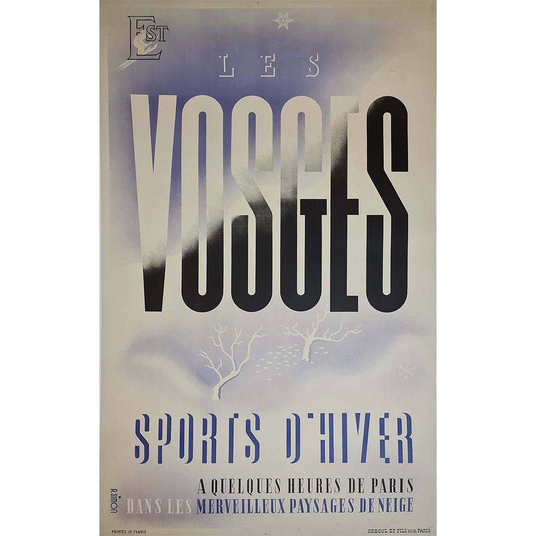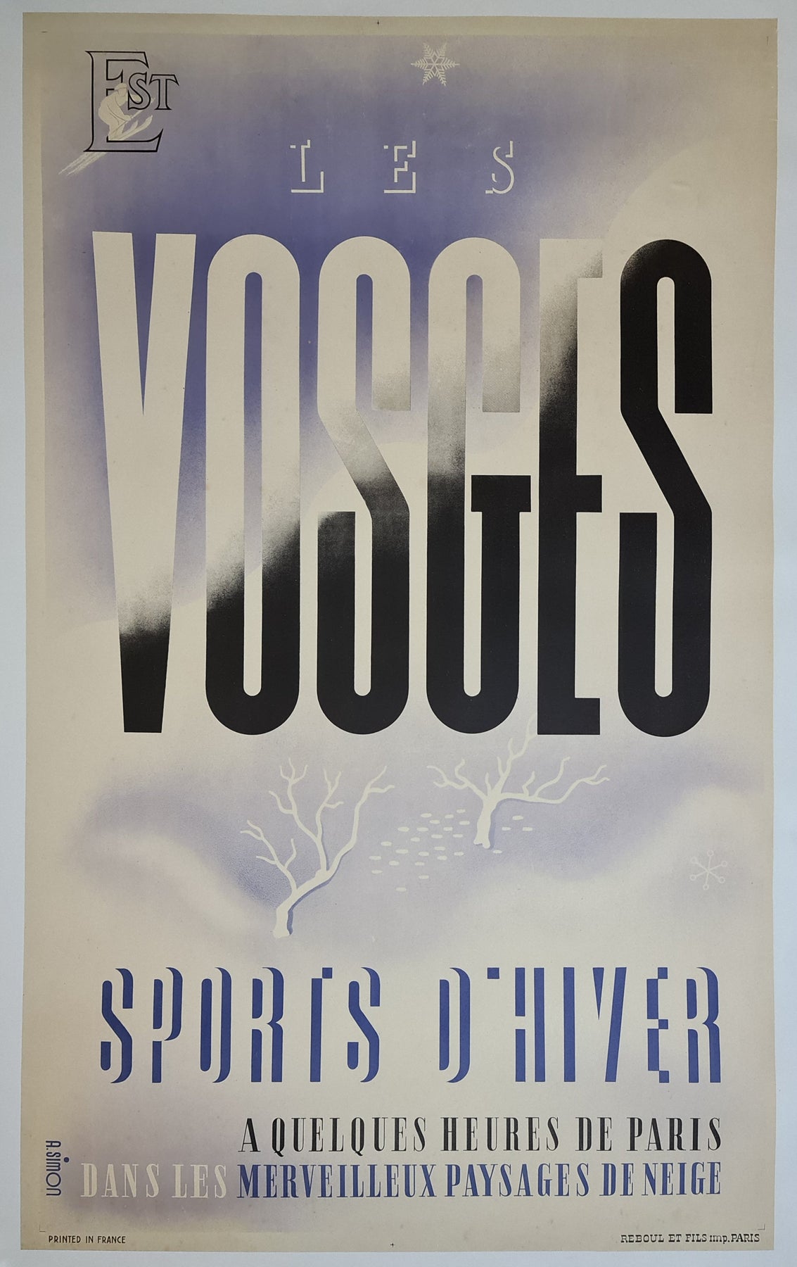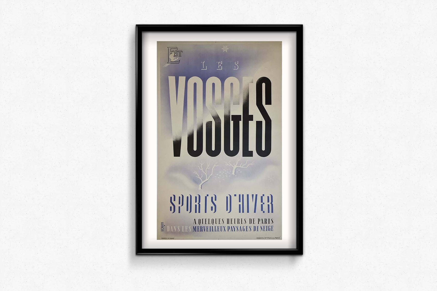 L'affiche de voyage originale de Simon pour « Les Vosges Sports d'Hiver » capture l'attrait intemporel des aventures hivernales dans les montagnes des Vosges, idéalement situées à proximité de Paris.