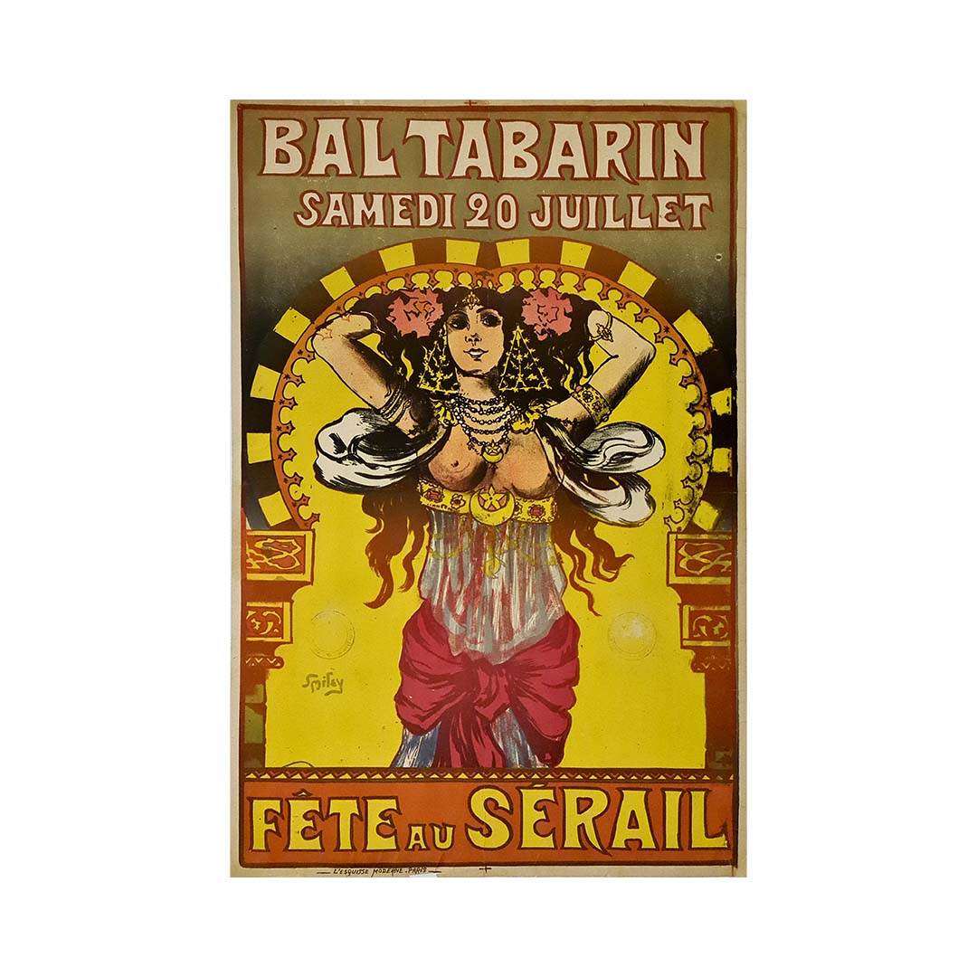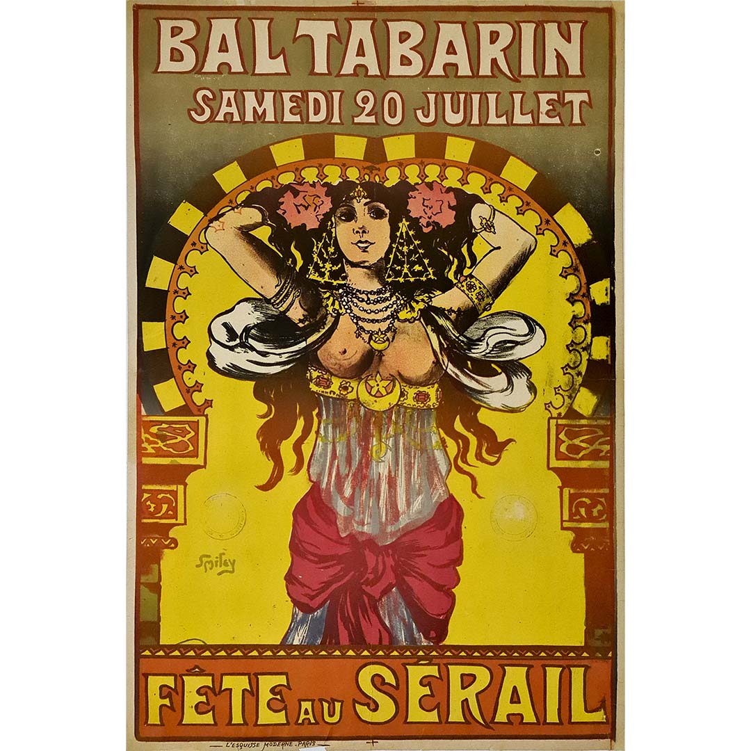 L'affiche annonce la « Fête au Sérail », un événement sans doute inspiré par les fantasmes orientalistes qui faisaient fureur dans les nuits parisiennes du début du XXe siècle. L'image, audacieuse et théâtrale, met en scène une danseuse sensuelle parée de bijoux exotiques, de voiles et d'une ceinture richement ornée, évoquant le mystère et le charme des harems orientaux. Sa pose assurée, son regard direct et sa longue chevelure noire dégagent une indéniable impression de liberté et de séduction, reflétant à merveille l'esprit des spectacles de Bal Tabarin.