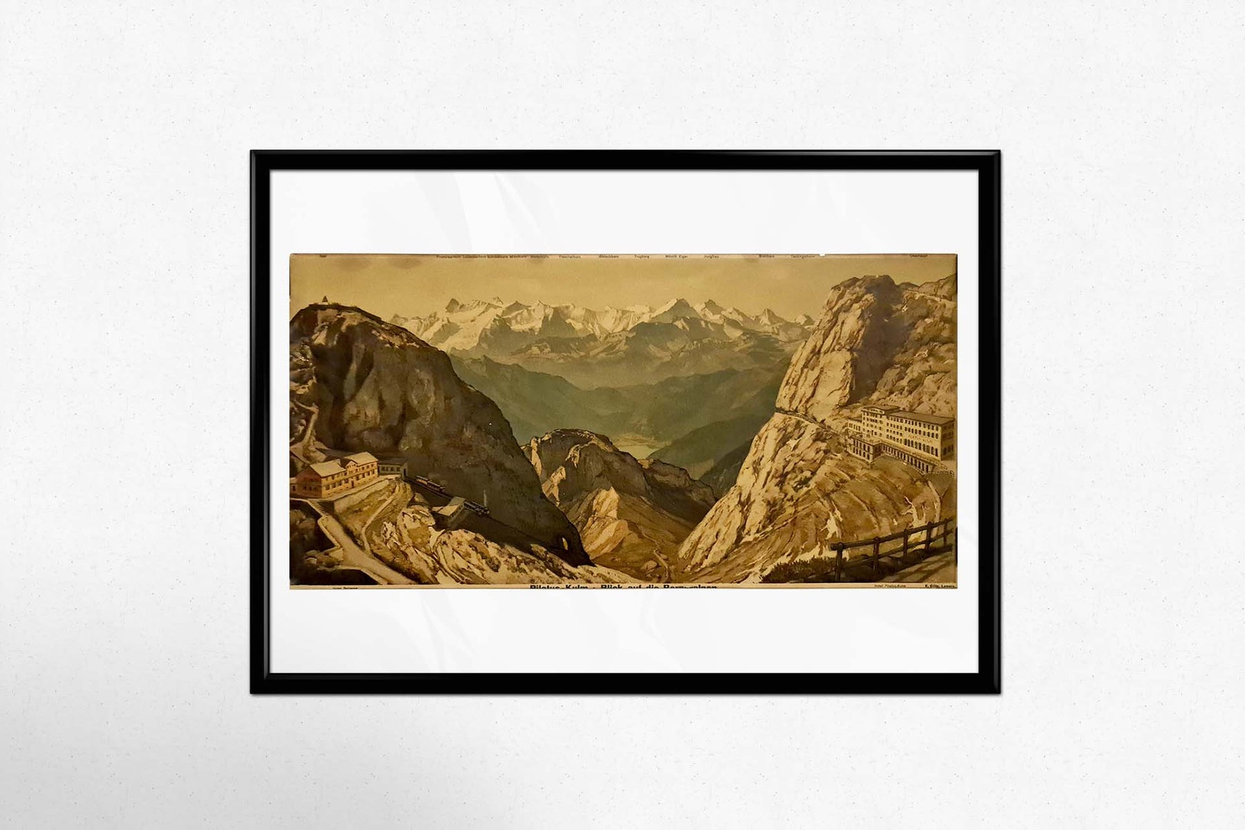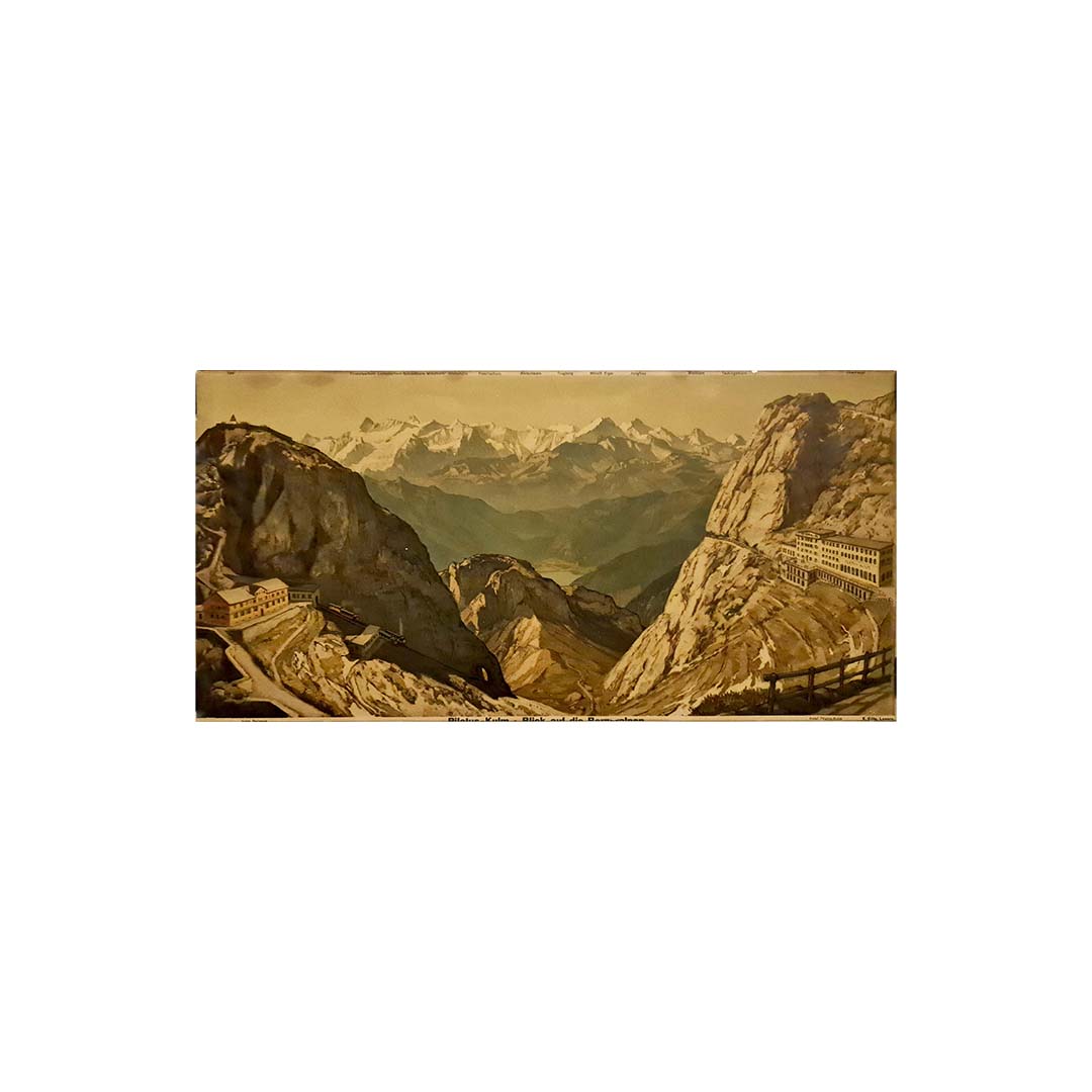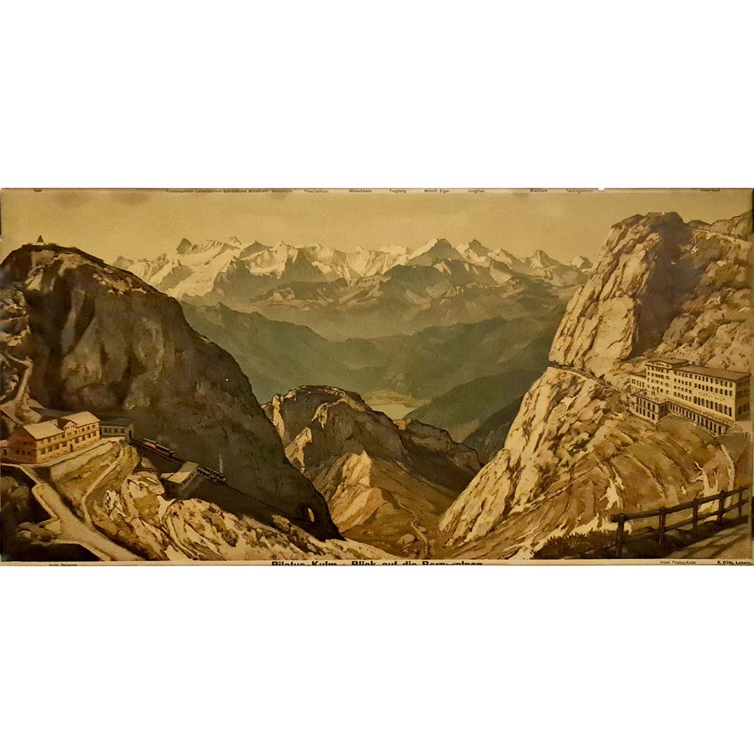 Magnifique estampe en couleurs des années 1920 présentant la vue majestueuse de l'hôtel Pilatus Kulm et de Bellevue.