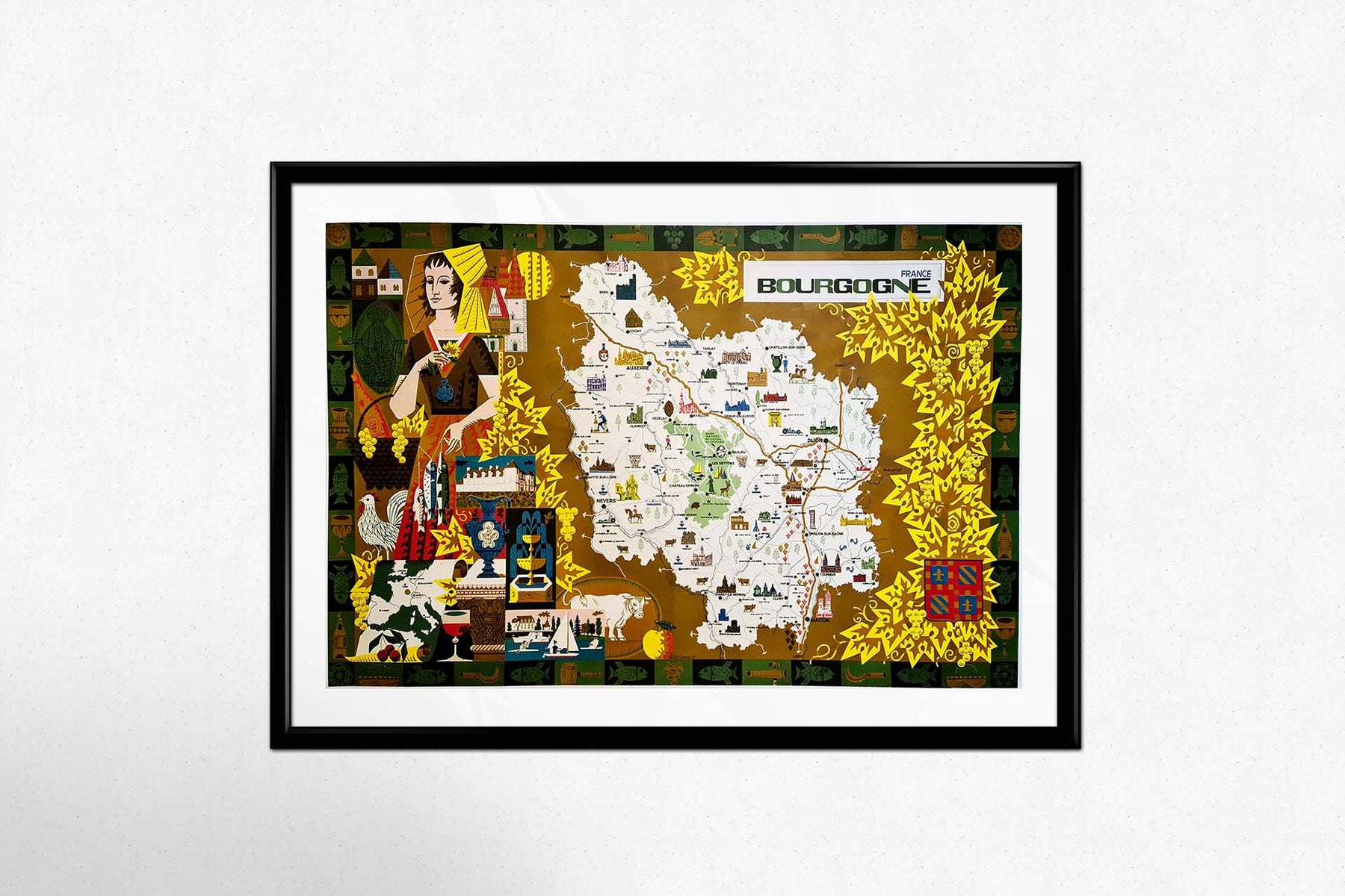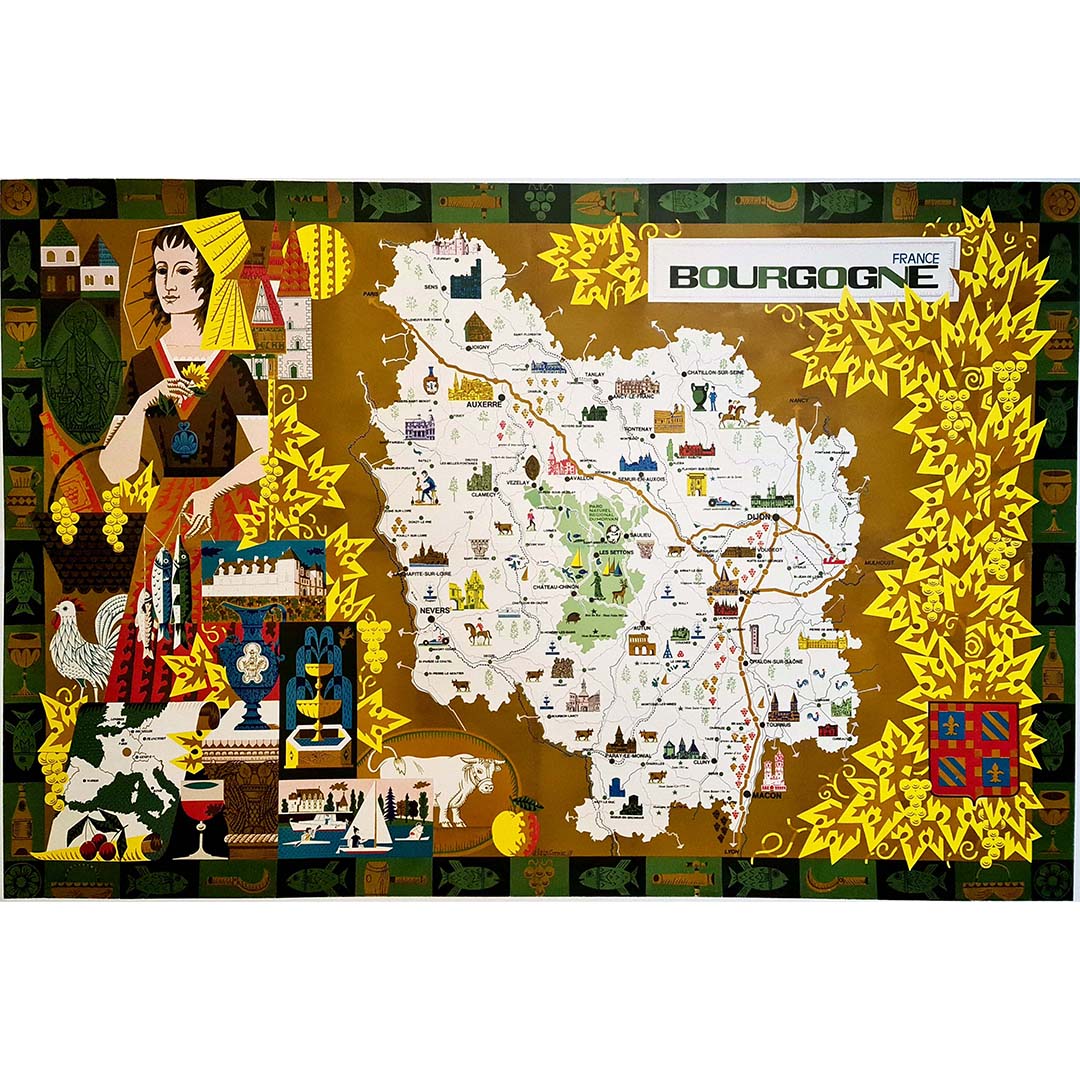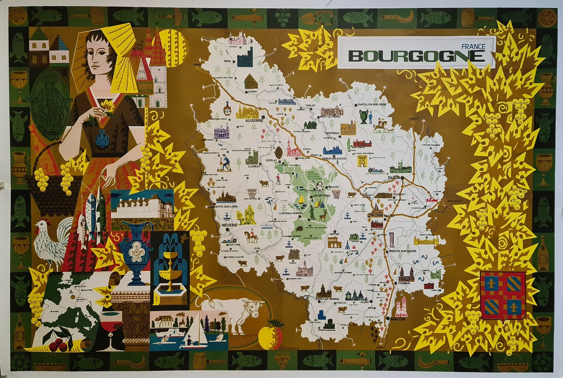 Magnifique affiche géographique de la Bourgogne créée par Alain Cornic en 1979.