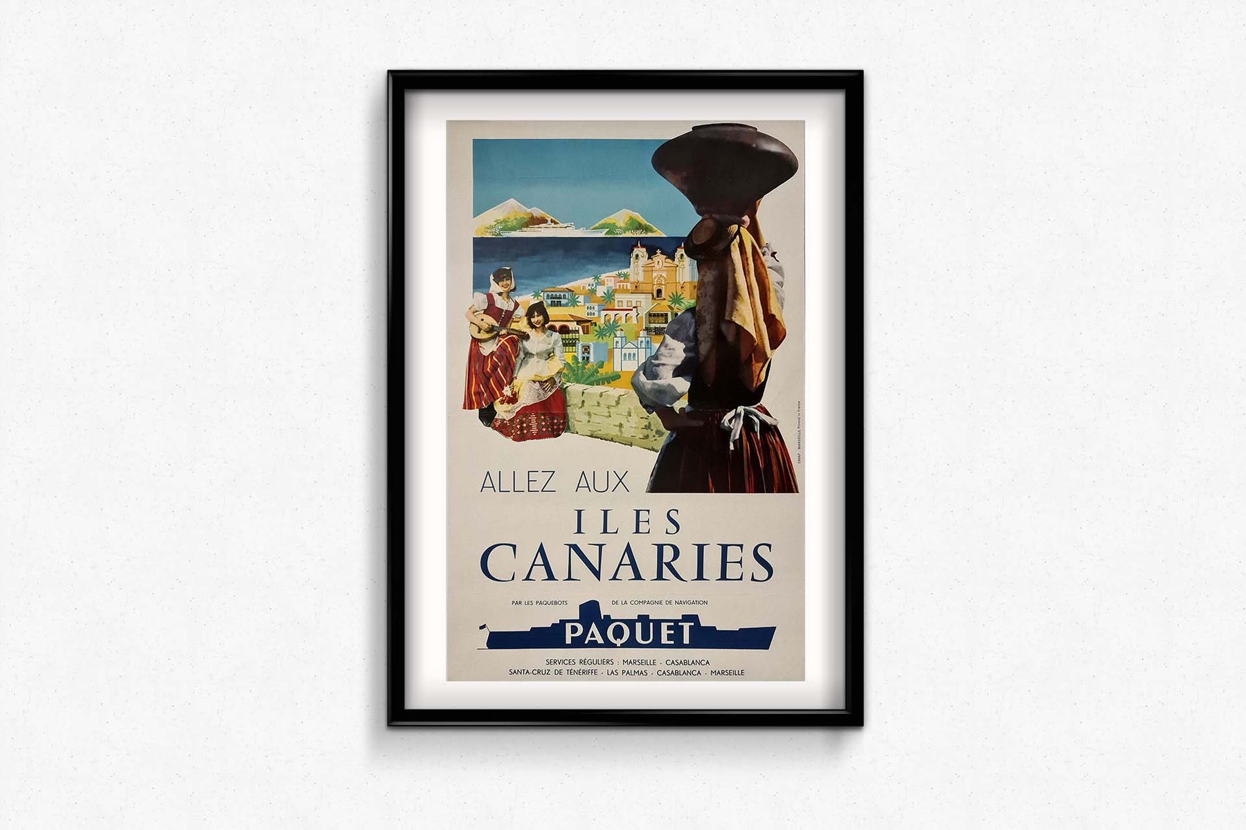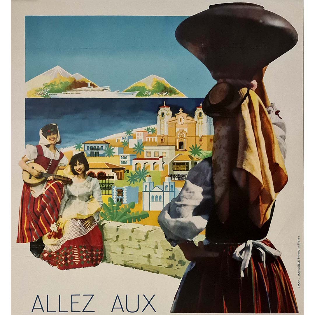 Affiche originale du tourisme des années cinquante pour visiter les îles Canaries à bord des paquebots de la compagnie maritime Paquet.