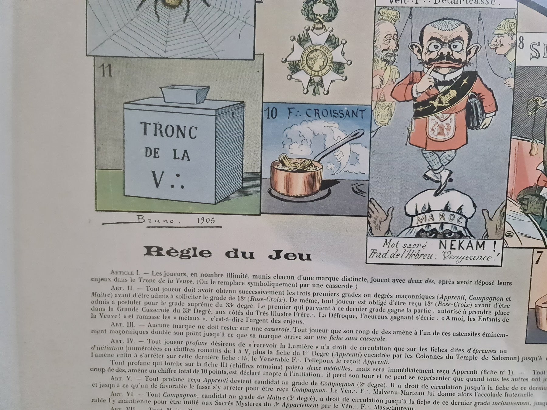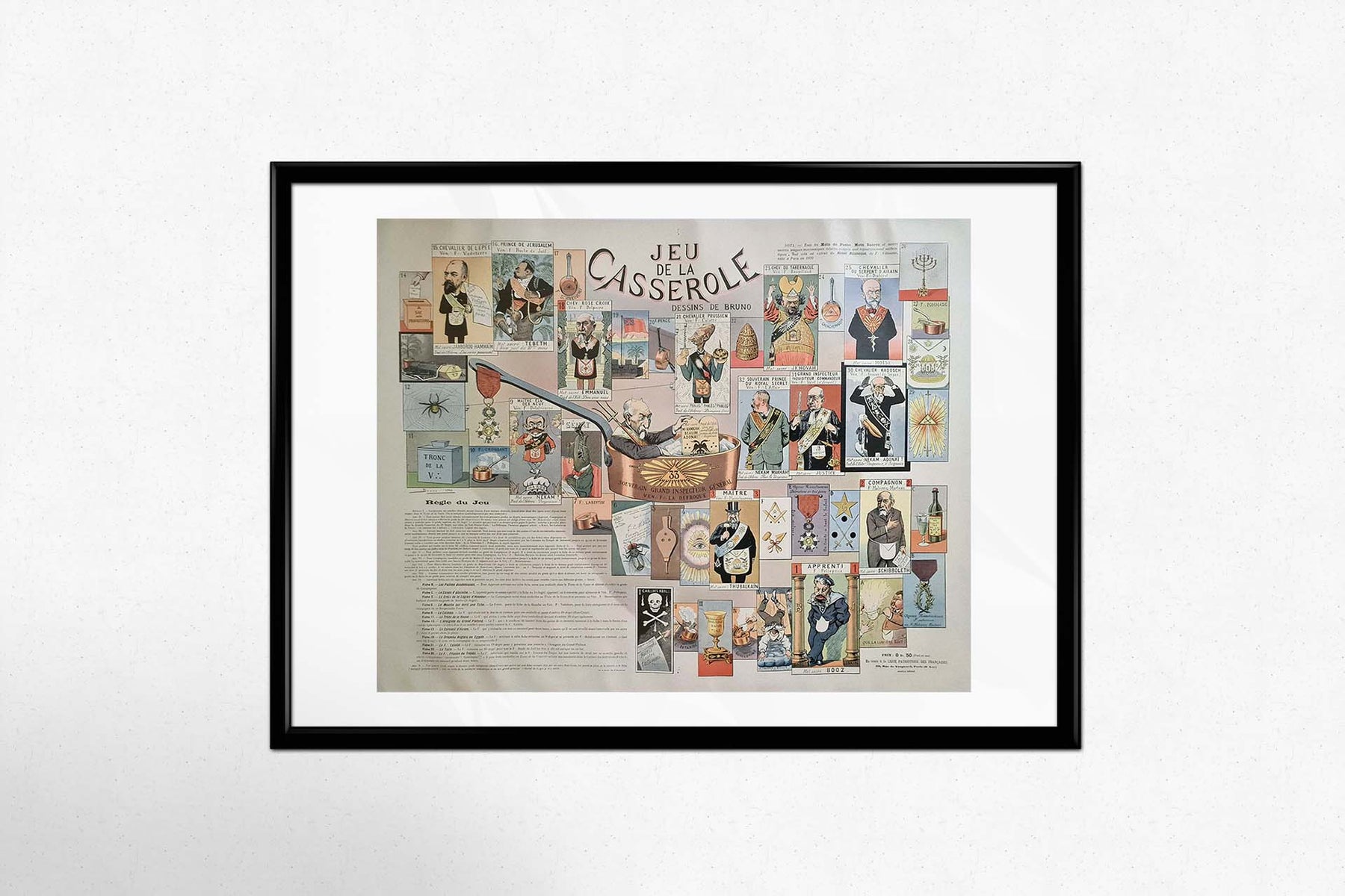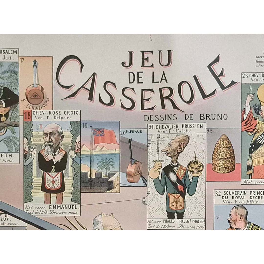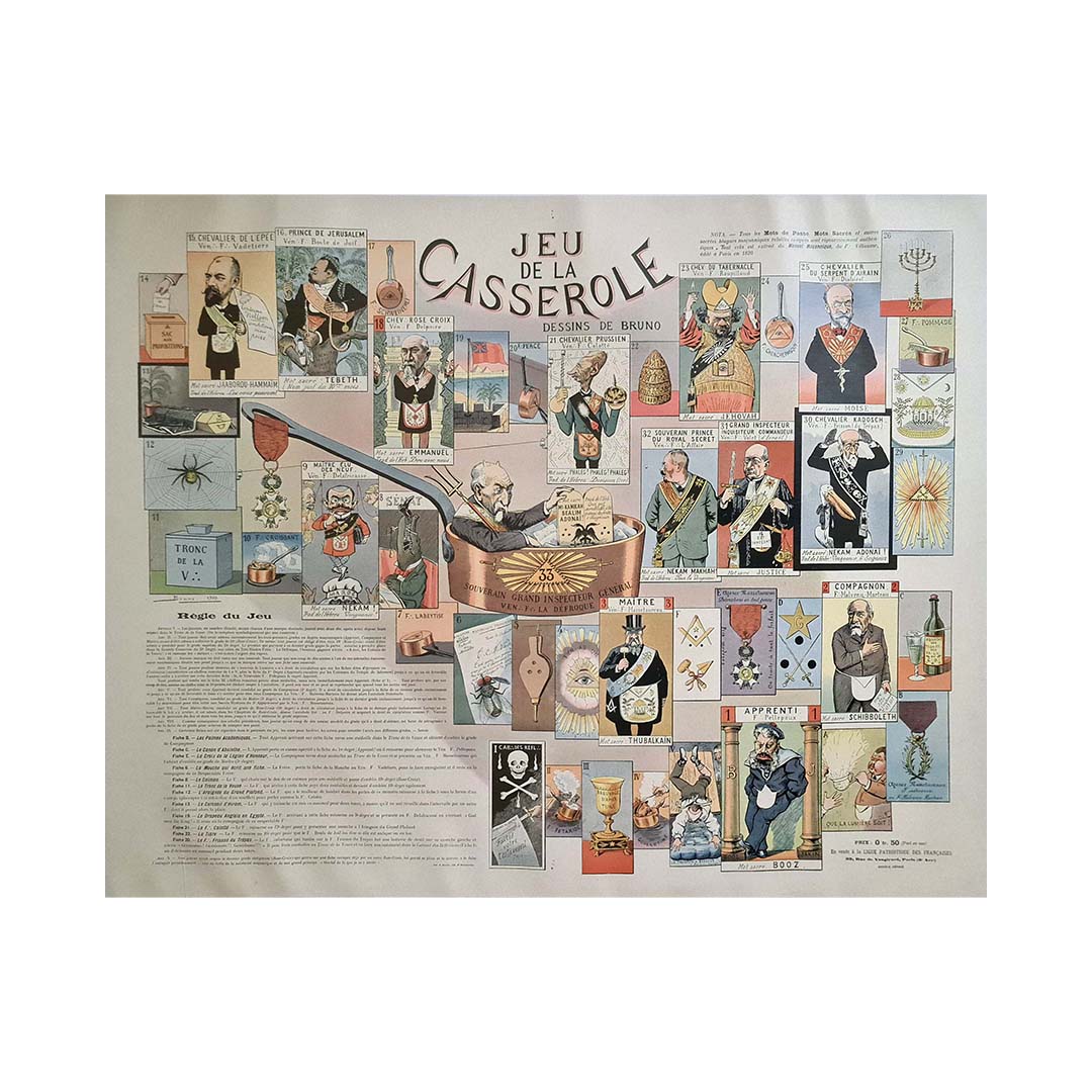 Le document original de 1905, intitulé « Jeu de la Casserole - Société Secrète, Jeu Anti-Maçonnique », offre un aperçu unique du paysage politique et social de la France du début du XXe siècle. Élaboré par la Ligue patriotique des Françaises, ce document reflète le fervent sentiment anti-maçonnique qui imprégnait la société française de cette époque.