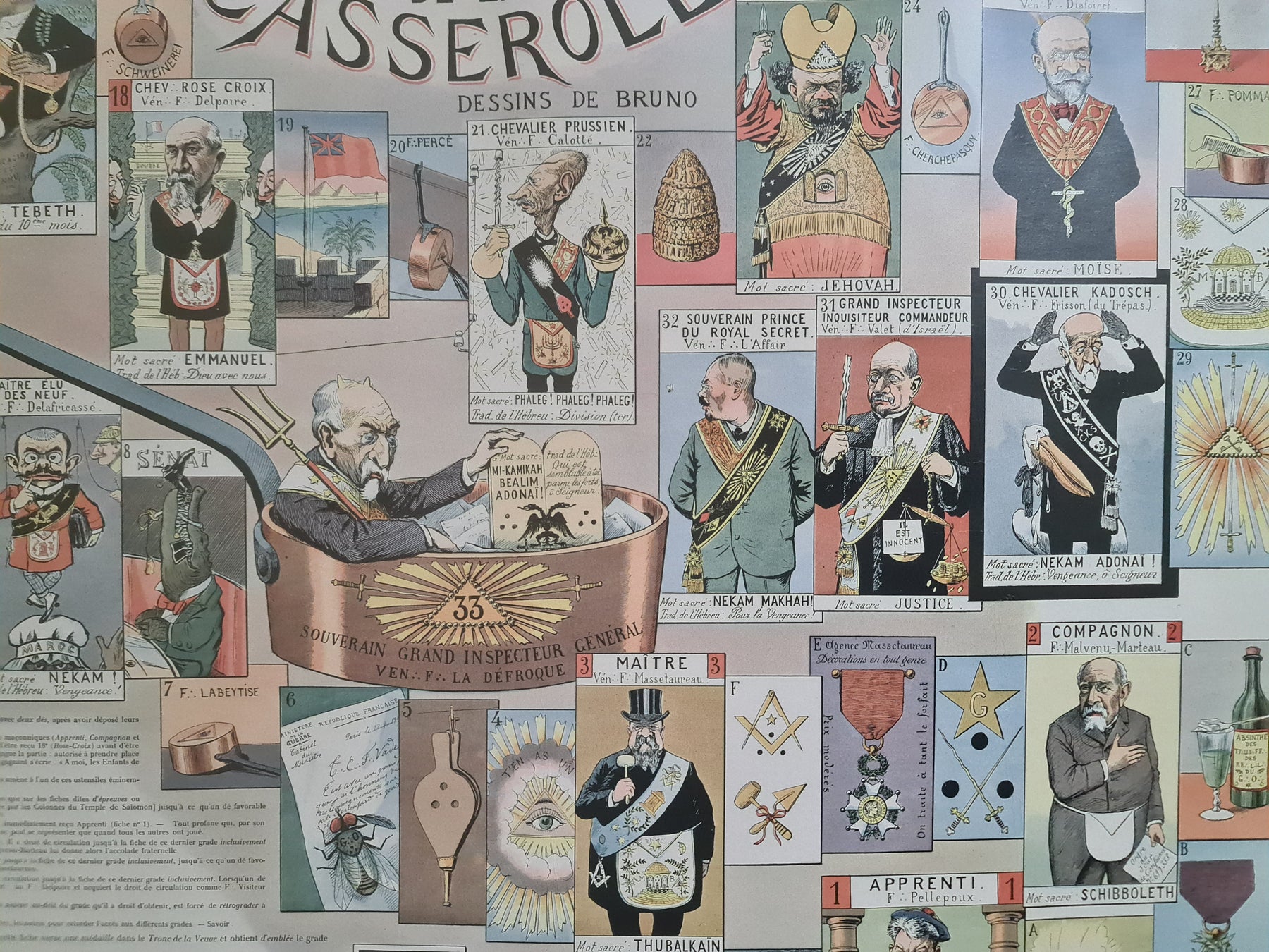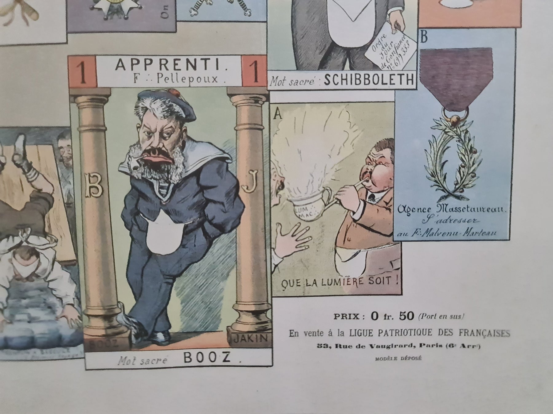 Au cœur de ce document se trouve le « Jeu de la Casserole », outil de propagande antimaçonnique au service de la Ligue patriotique. À travers caricatures, illustrations et textes, il vise à diaboliser la franc-maçonnerie et à la dépeindre comme une force secrète et subversive menaçant les valeurs de la nation française.