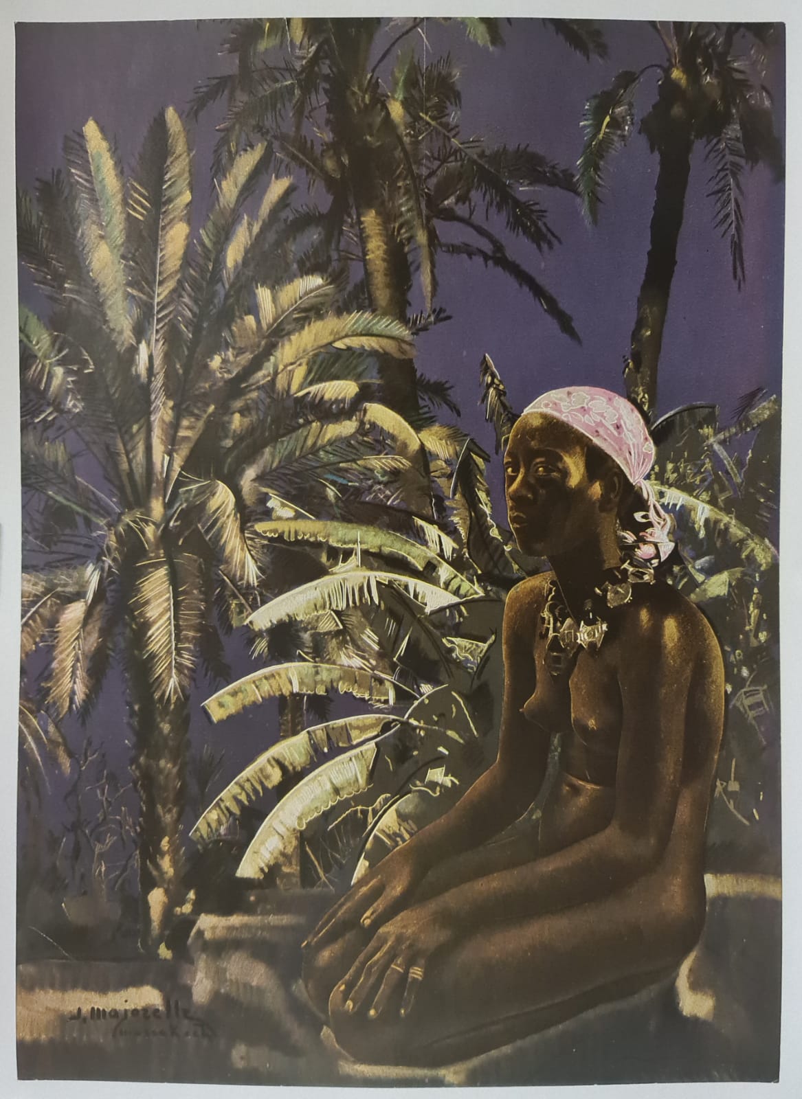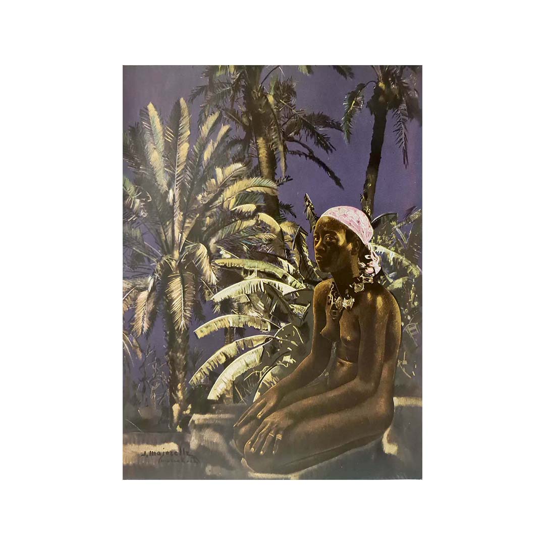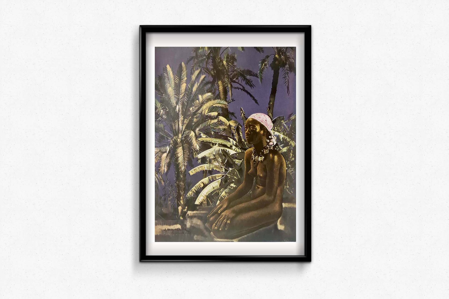 L'affiche de Majorelle met en lumière la rencontre entre l'exotisme de l'époque coloniale et la sensibilité artistique moderniste. Il y représente une Africaine assise au milieu d'une végétation tropicale luxuriante, soulignant ses parures culturelles et le cadre naturel. L'utilisation de couleurs vives et de contrastes marqués, notamment avec les verts profonds et les bruns terreux du feuillage, est caractéristique du style de Majorelle, qui puisait souvent dans la tradition orientaliste tout en l'imprégnant d'une abstraction et d'une intensité émotionnelle propres au modernisme.