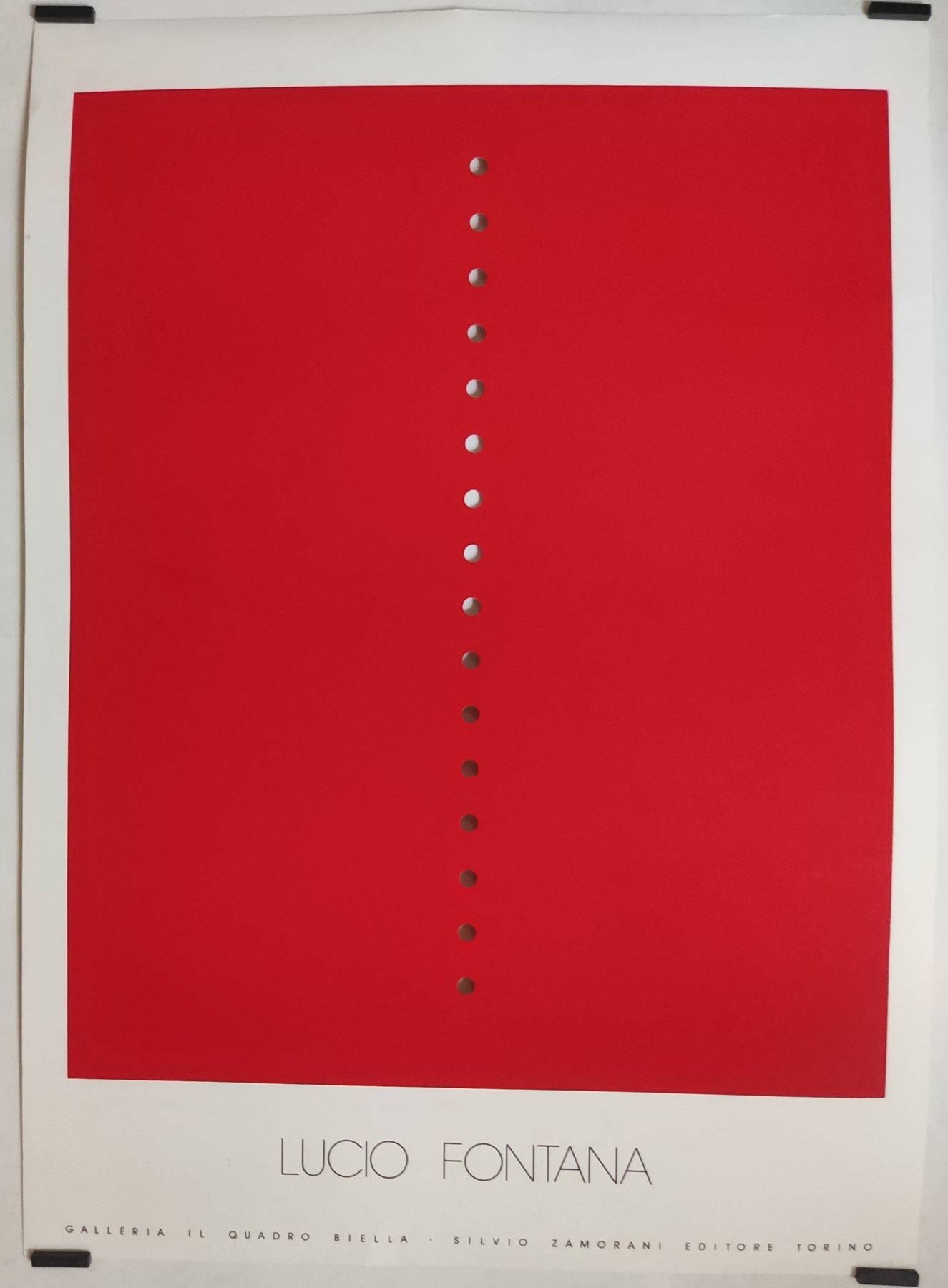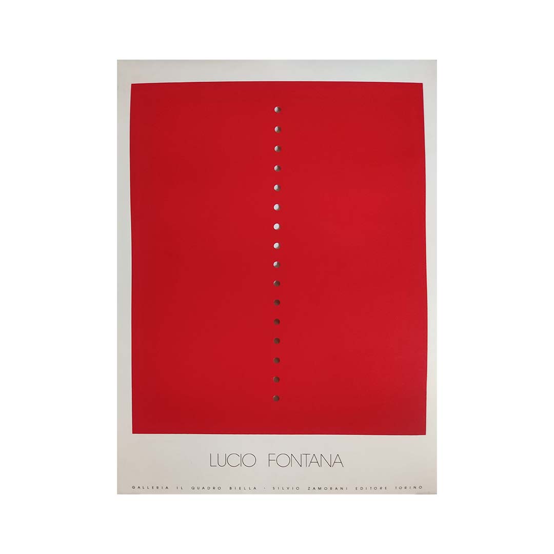 Minimaliste, radicale et indéniablement viscérale, cette affiche d'exposition originale de Lucio Fontana, datant d'environ 1970, saisit la puissance conceptuelle de sa série révolutionnaire Concetto Spaziale . Conçue pour une exposition à la Galleria Il Quadro de Biella et publiée par Silvio Zamorani Editore, l'affiche présente l'un des monochromes rouges emblématiques de Fontana, transpercé d'une ligne verticale de perforations précisément espacées.