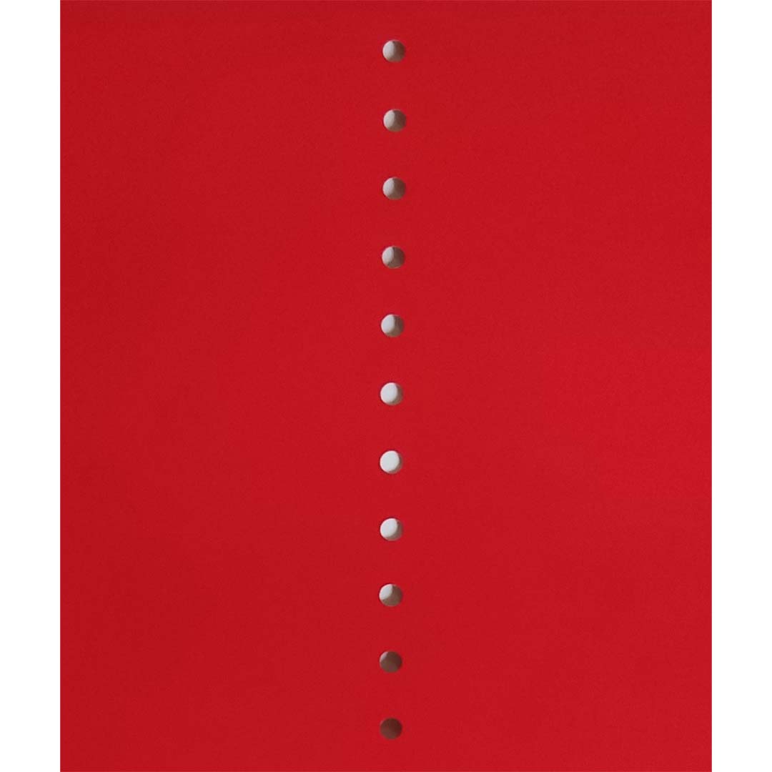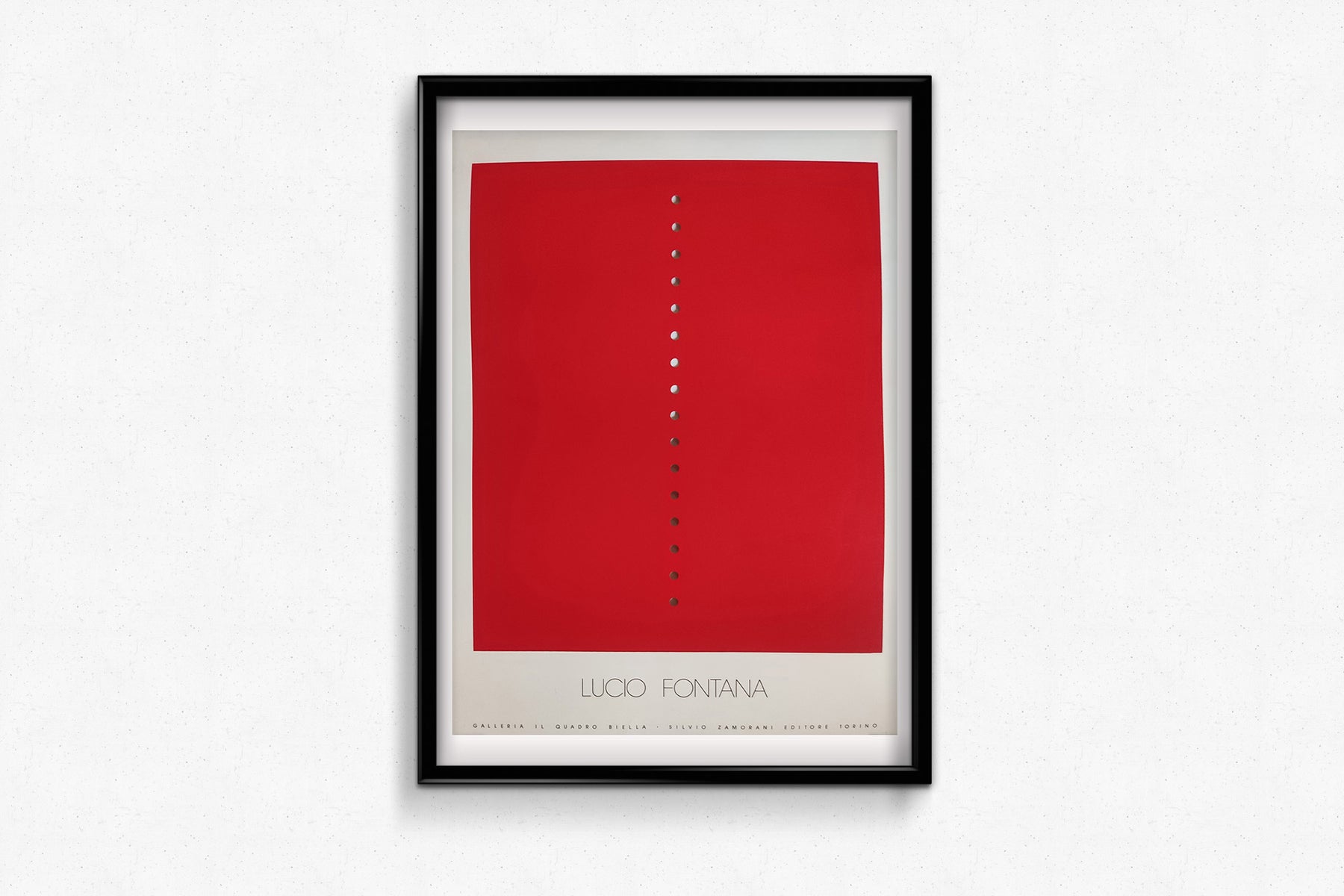 Sur un fond blanc cassé, le champ rouge évoque à la fois la violence et la transcendance. Les « buchi » (trous) de Fontana constituaient une rupture audacieuse avec la peinture traditionnelle ; ils incisent la surface pour y introduire une profondeur littérale – spatiale, philosophique et spirituelle. Cette reproduction graphique traduit ce geste en un manifeste visuel pour le mouvement spatialiste qu’il a fondé, abolissant la frontière entre toile et sculpture.