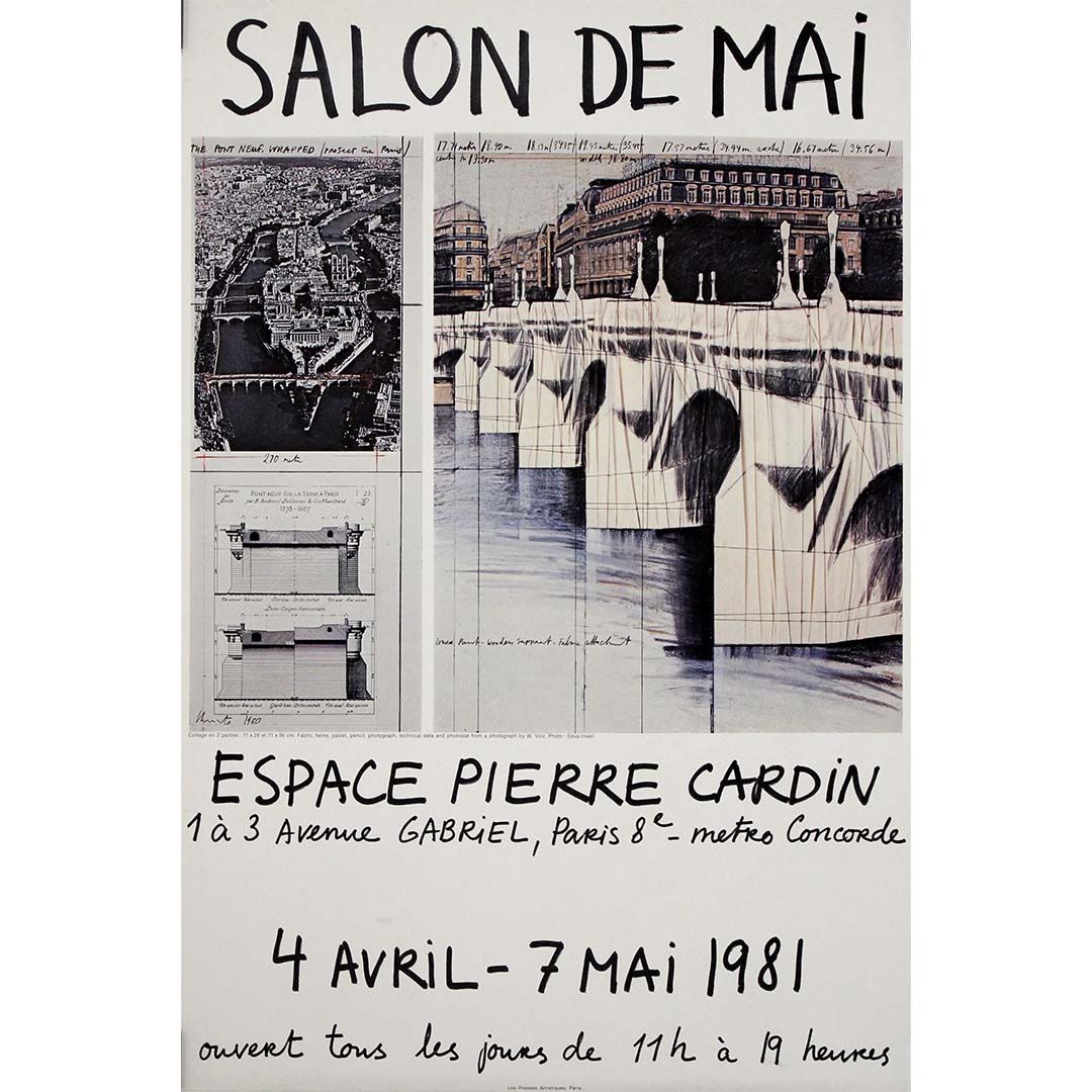 Cette affiche originale de l'exposition de 1981 a été créée par Christo, artiste environnemental et d'installations de renom, pour le Salon de Mai, qui s'est tenu à l'Espace Pierre Cardin à Paris du 4 avril au 7 mai 1981.