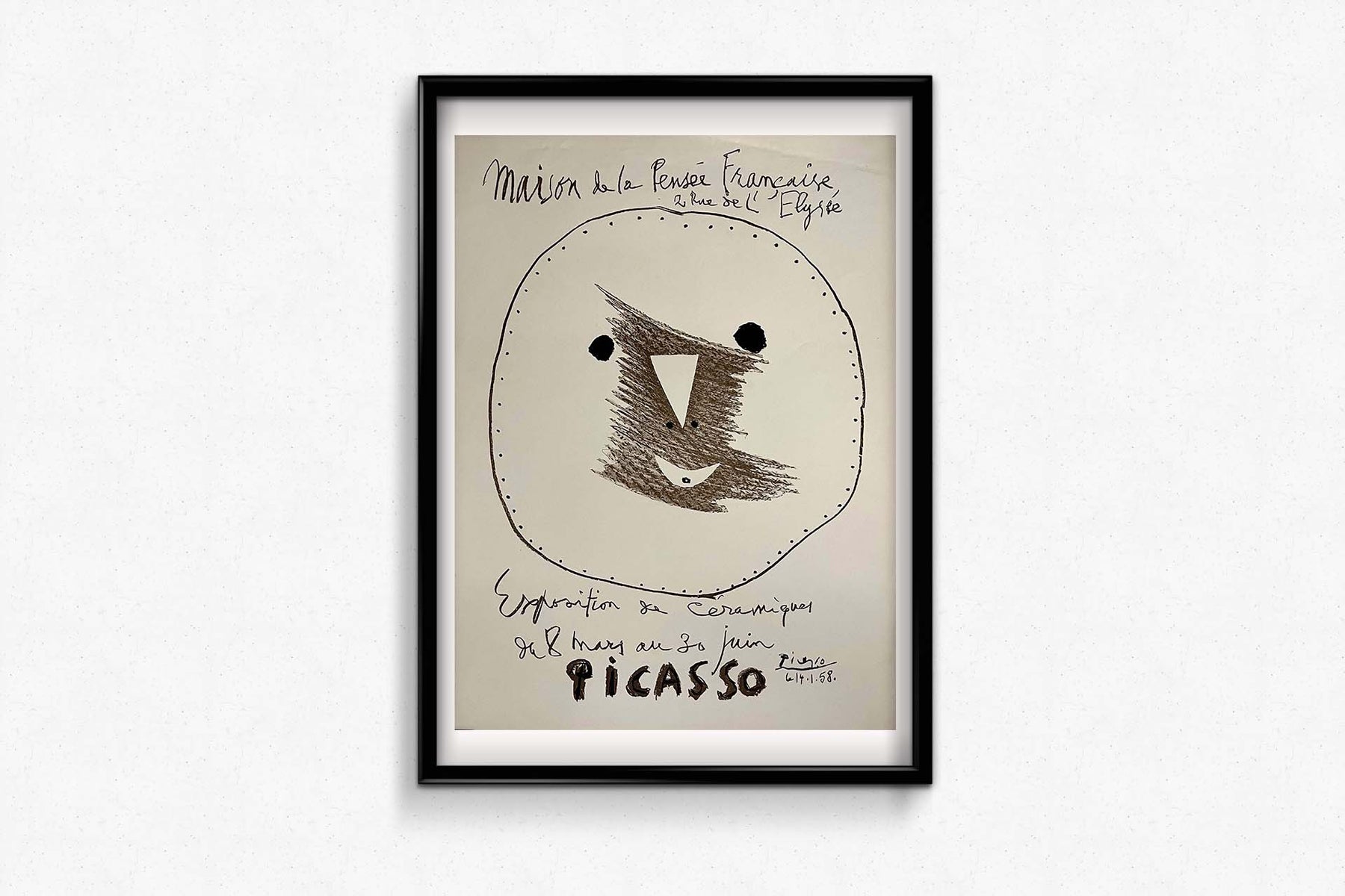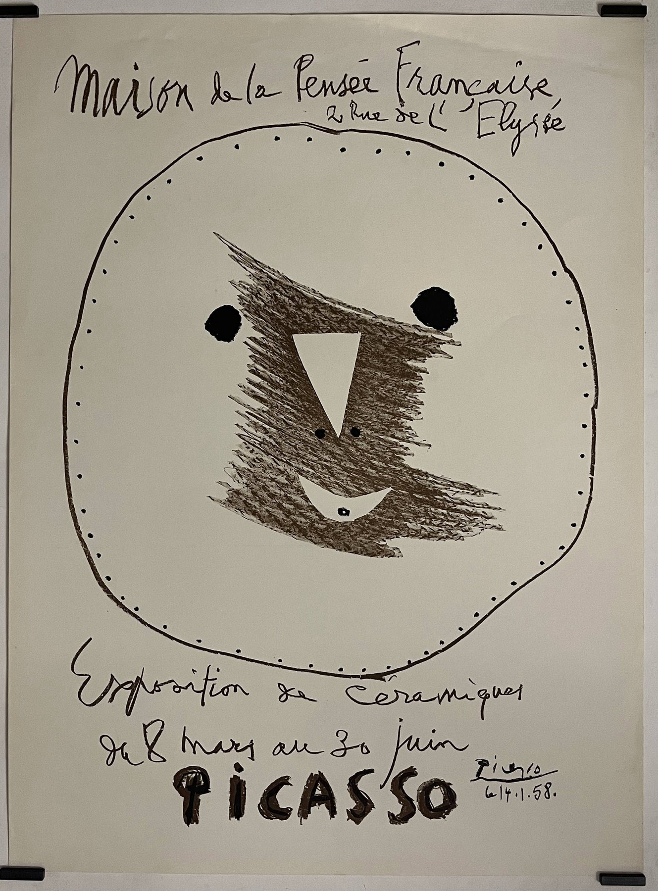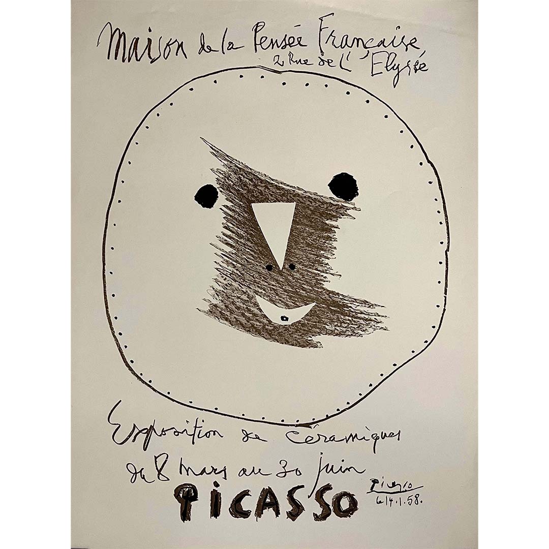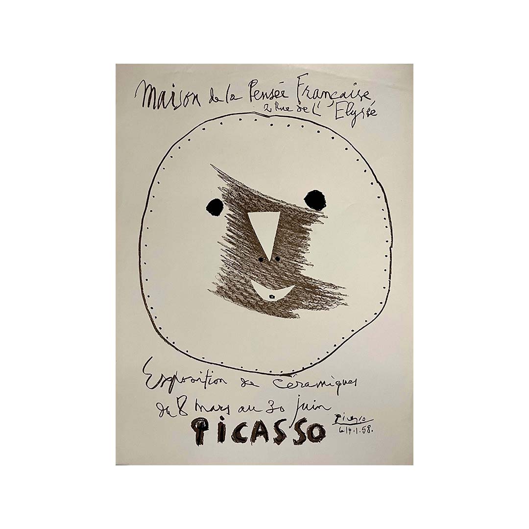L'année 1958 marque un tournant dans le parcours artistique de Pablo Picasso, l'une des figures les plus influentes de l'art du XXe siècle. Cette année-là, Picasso, reconnu pour sa maîtrise de divers médiums, dont la peinture et la sculpture, s'aventure dans le domaine de la céramique. L'affiche originale de l'exposition de céramiques présentée à la Maison de la Pensée Française témoigne de cette phase charnière de sa carrière.