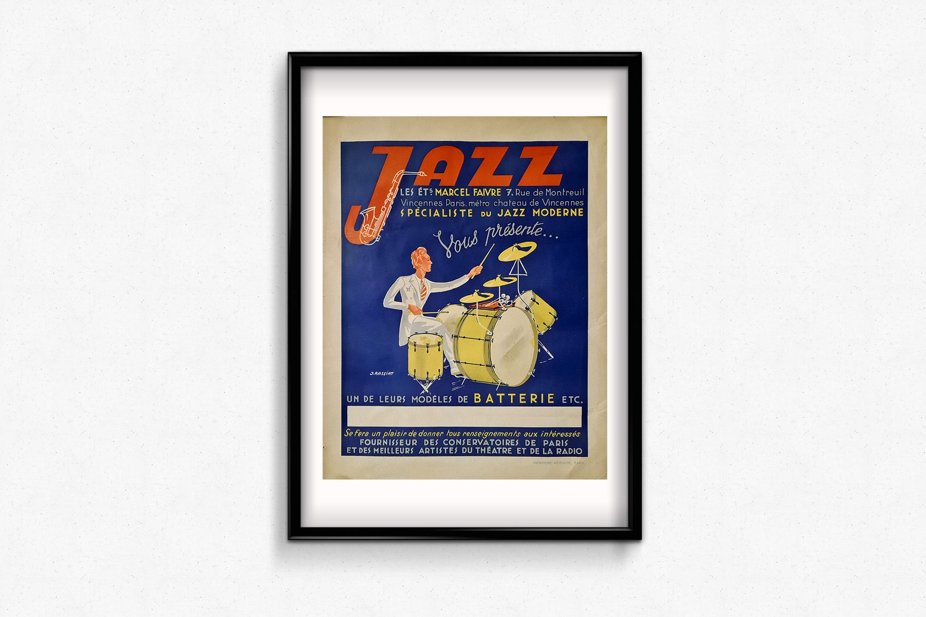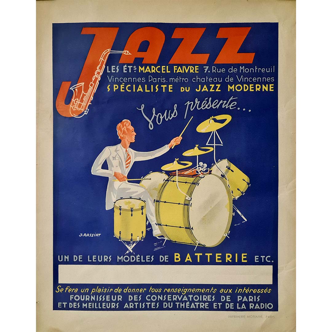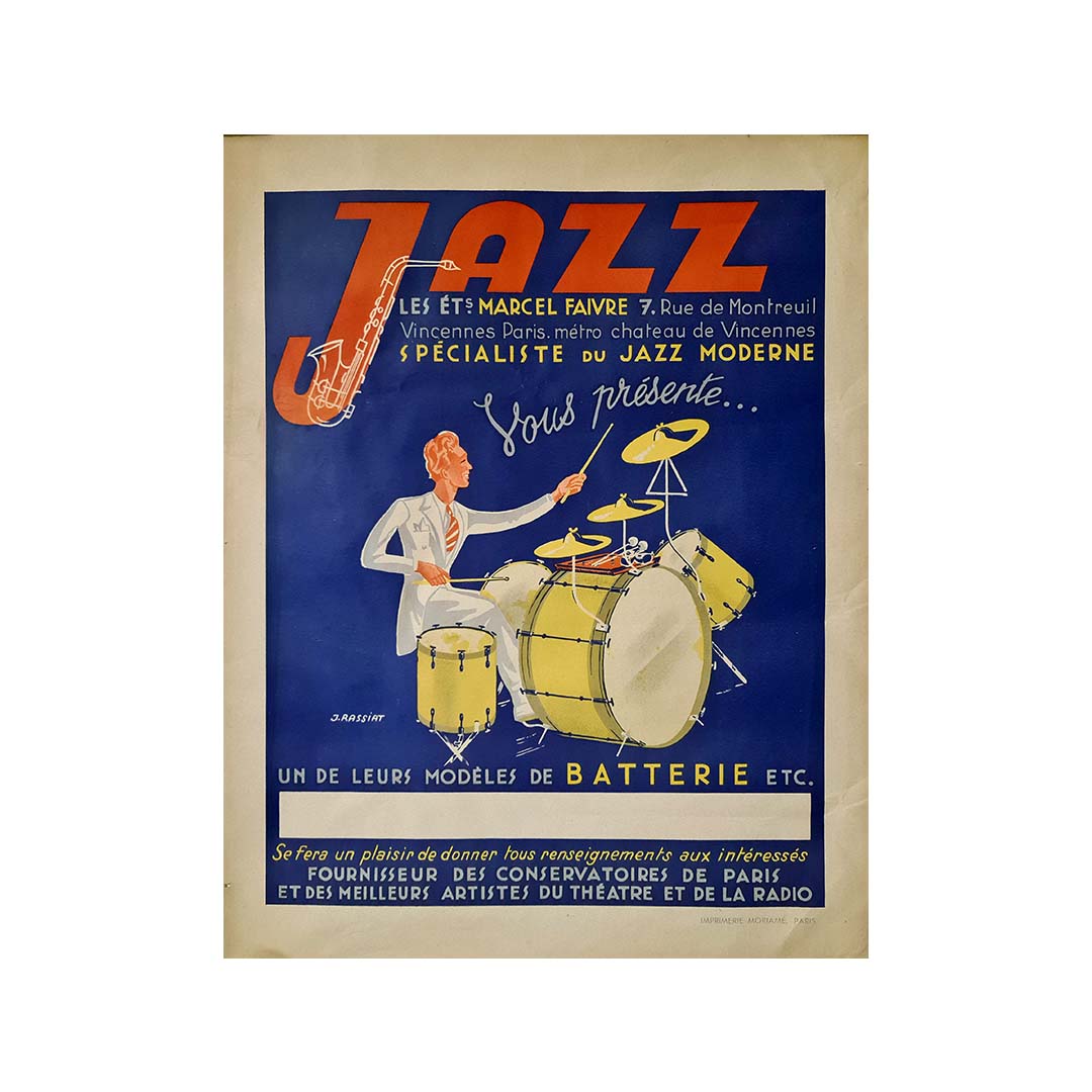 Cette superbe affiche originale datant d'environ 1945 a été illustrée par James Rassiat et commandée par Les Établissements Marcel Faivre, une entreprise parisienne située au 7 rue de Montreuil à Vincennes, connue pour sa spécialisation dans les instruments de jazz modernes.