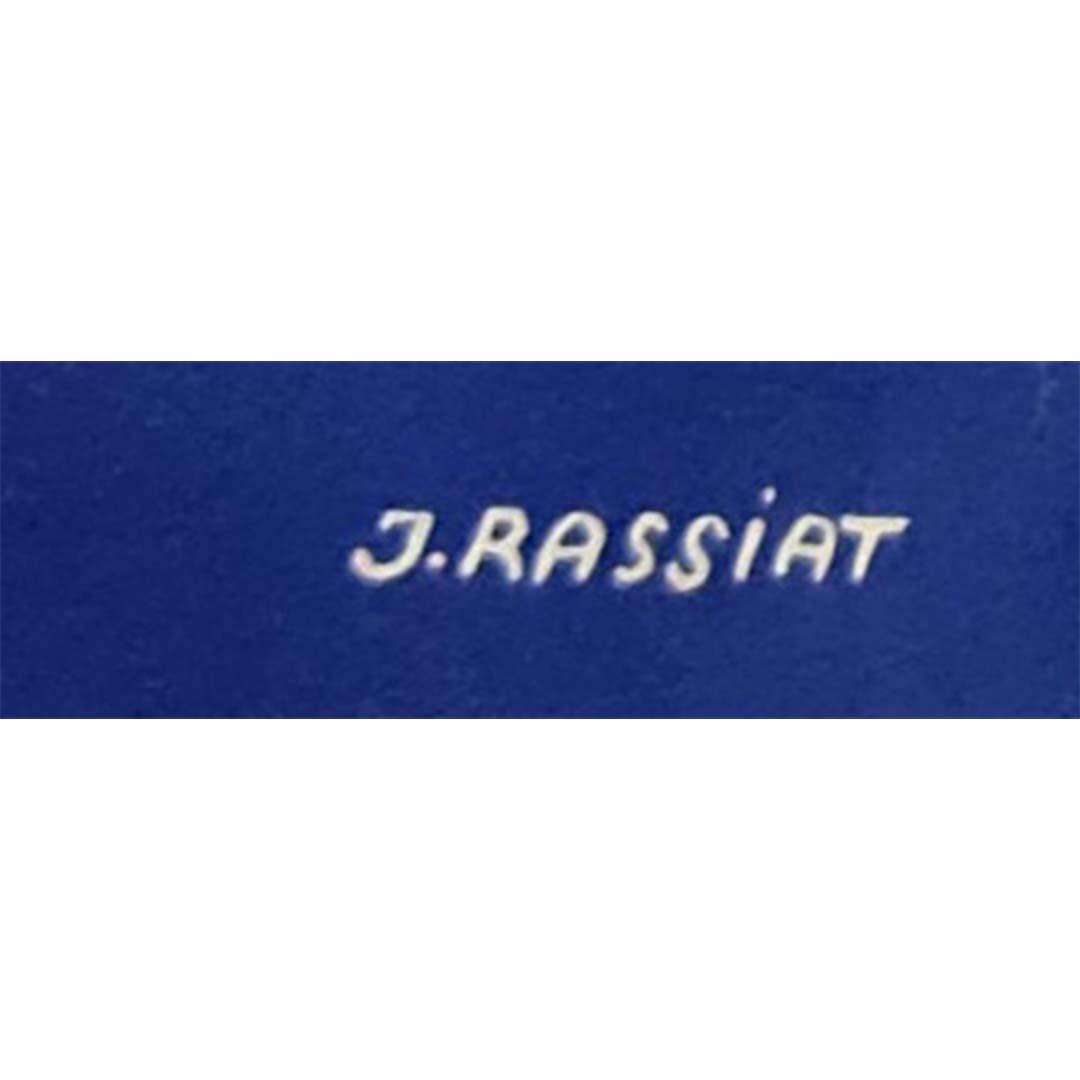 Le texte présente fièrement Marcel Faivre comme « Spécialiste du Jazz Moderne » et fournisseur des conservatoires parisiens, des artistes de radio et de théâtre, témoignant du rôle central de la maison Faivre dans le renouveau culturel français des années 1940. Un saxophone stylisé, astucieusement intégré au « J » du mot JAZZ, apporte une touche graphique charmante, tandis que la signature de Rassiat se trouve discrètement sur le côté gauche de l'œuvre.