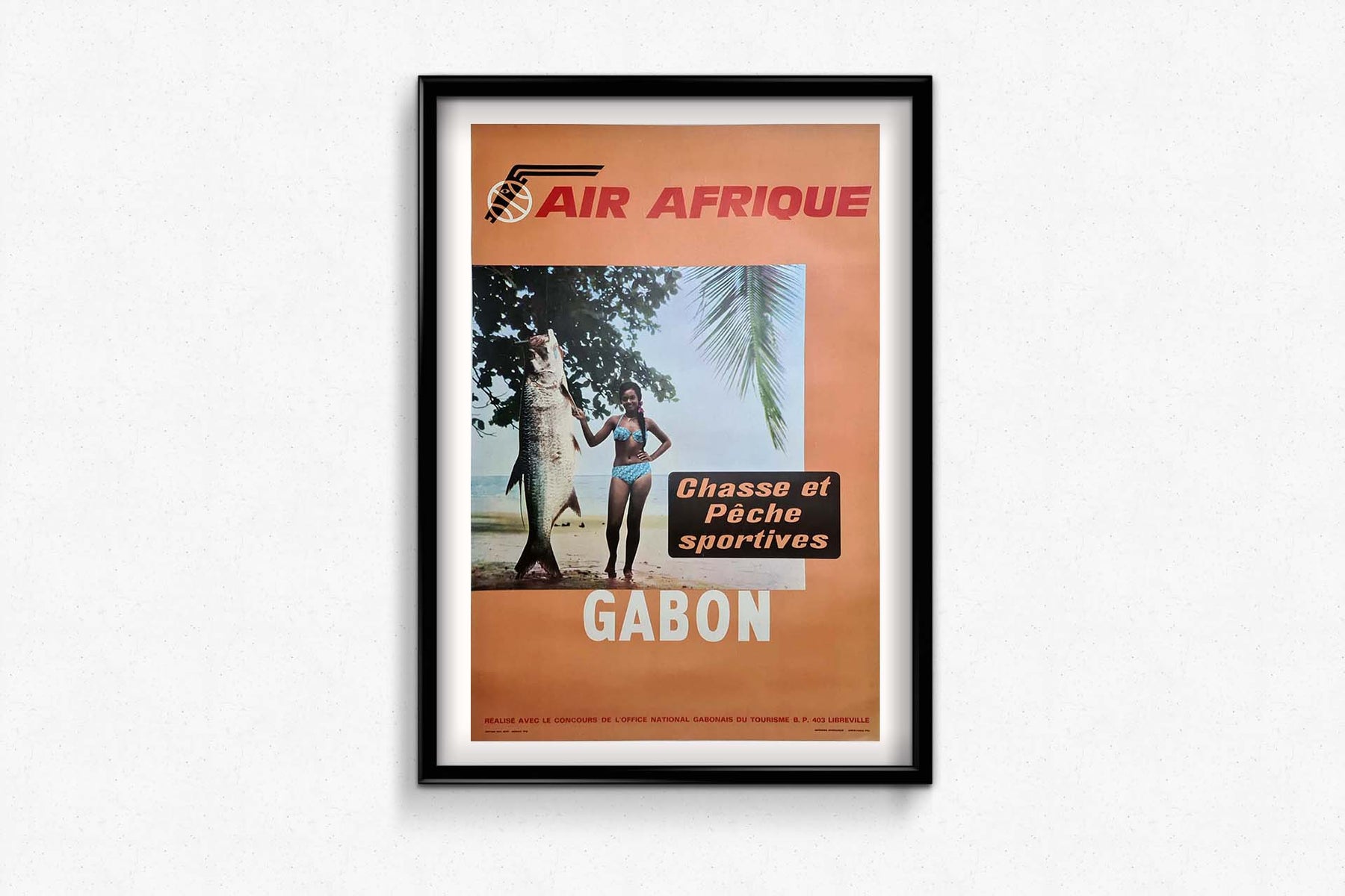Affiche originale de la compagnie aérienne Air Afrique pour ses voyages au Gabon, pays de la chasse et de la pêche sportives.