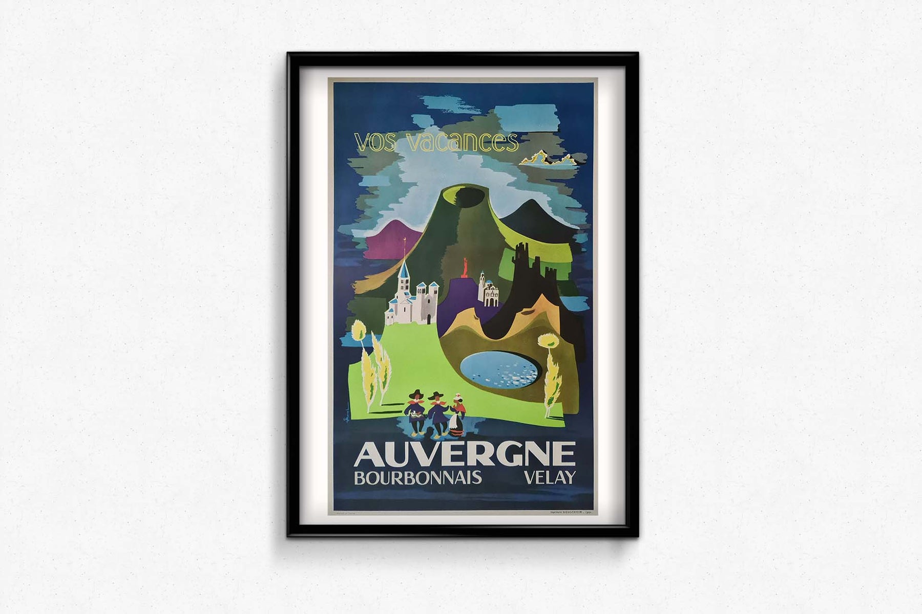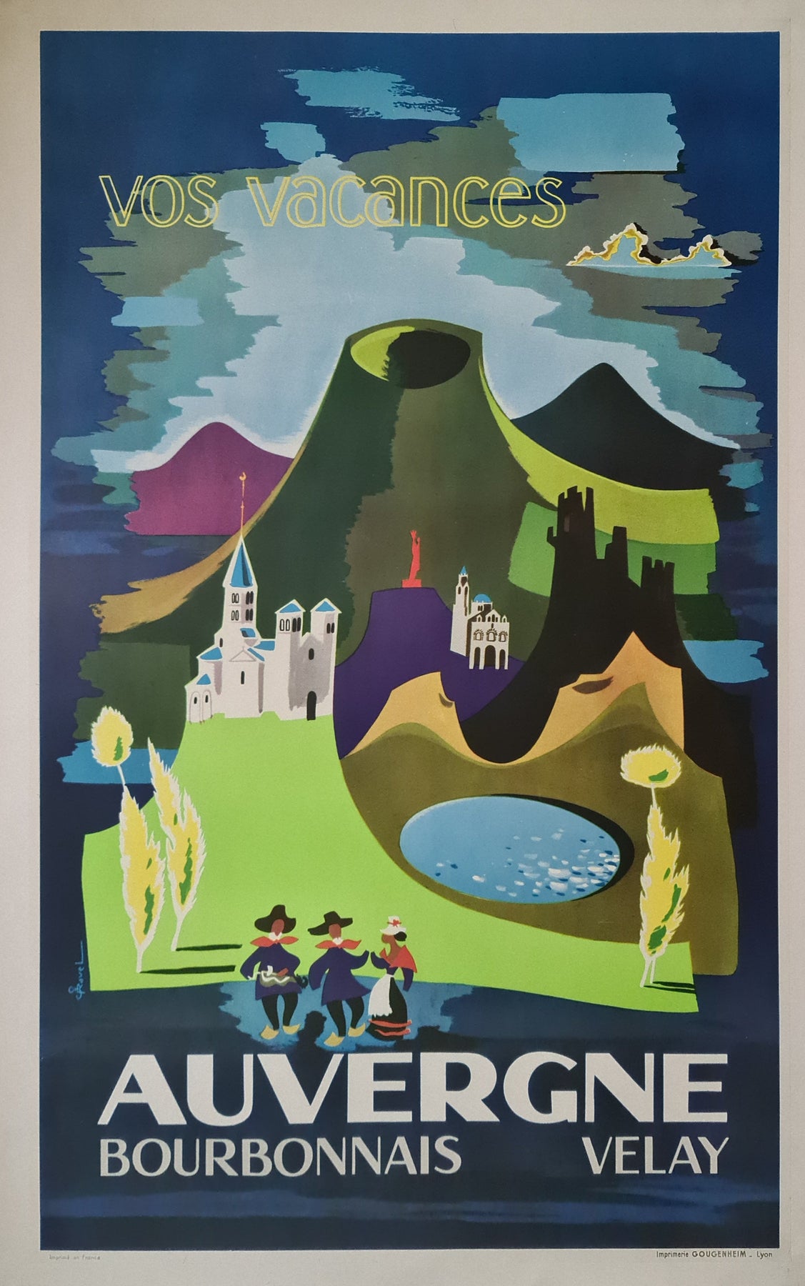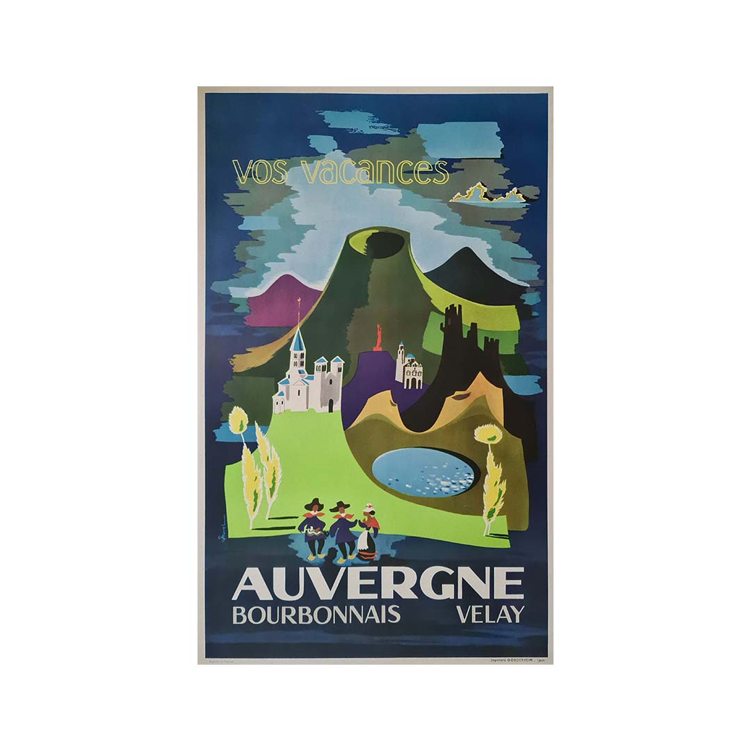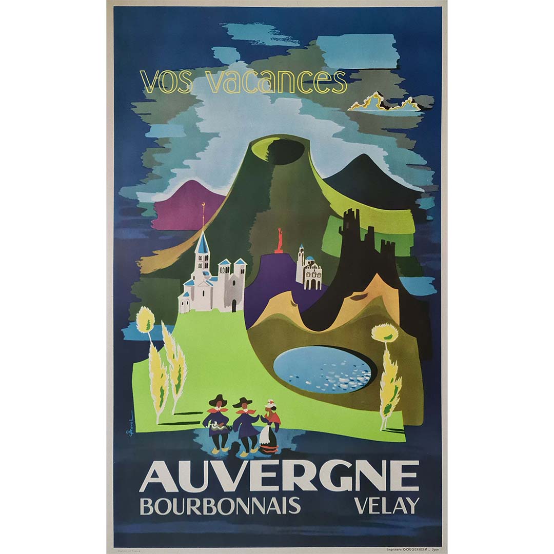 L'affiche visait probablement à inciter les voyageurs à explorer les attraits uniques et les paysages idylliques de l'Auvergne, du Bourbonnais et du Velay. Qu'il s'agisse des collines ondulantes, des sites historiques ou des villages pittoresques, l'affiche suggère un voyage au cœur de la campagne française, invitant les spectateurs à découvrir les trésors cachés de ces régions.