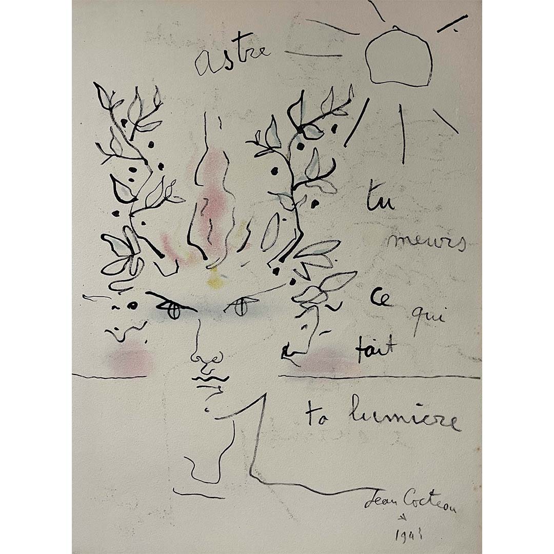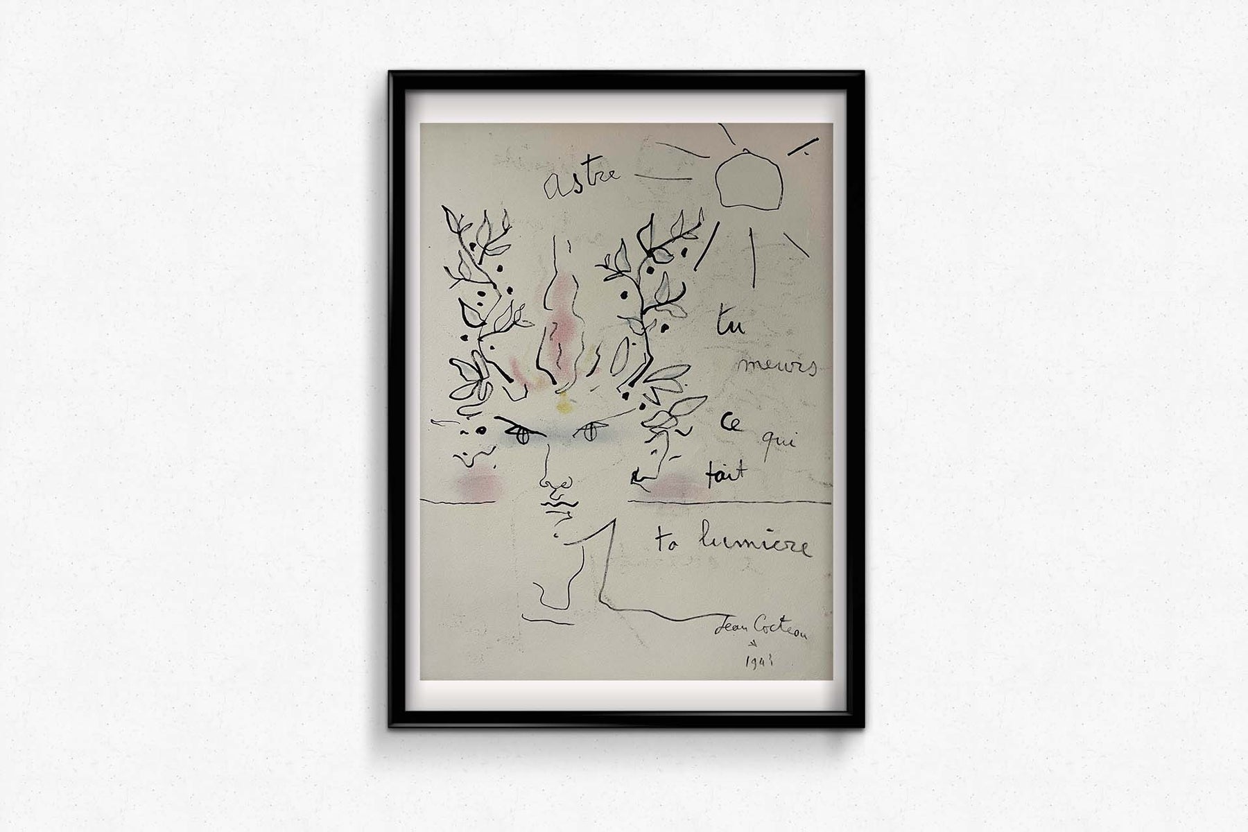 La lithographie de Jean Cocteau de 1943, « Astre, tu meurs : ce qui fait ta lumière », est une exploration poétique de la vie et de la mort à travers la métaphore cosmique d'une étoile mourante. Cocteau, artiste français aux multiples talents, y mêle symbolisme et abstraction, invitant le spectateur à contempler la nature cyclique de l'existence. Avec ses lignes fluides et ses détails minutieux, la lithographie capture l'essence de la beauté cosmique et de la fugacité de l'éphémère. « Astre, tu meurs » reflète la fascination de Cocteau pour la mythologie et l'interconnexion entre l'art et le céleste, invitant le spectateur à méditer sur les mystères de l'existence.